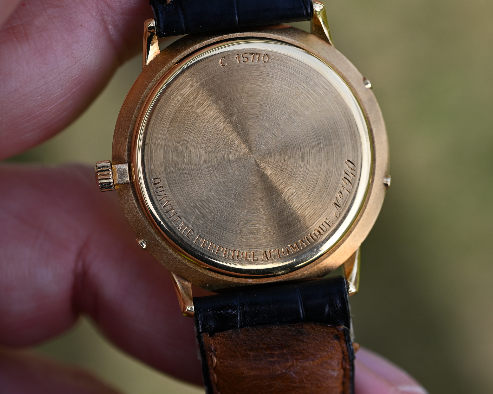 Das elegante 18k Gelbgoldgehäuse präsentiert sich in herausragendem Gesamtzustand und unterstreicht den klassischen Charakter dieser außergewöhnlichen Komplikationsuhr. Die harmonisch gestalteten Kalenderanzeigen verleihen dem Zifferblatt eine faszinierende technische Tiefe, ohne dabei die elegante Gesamtästhetik zu verlieren.