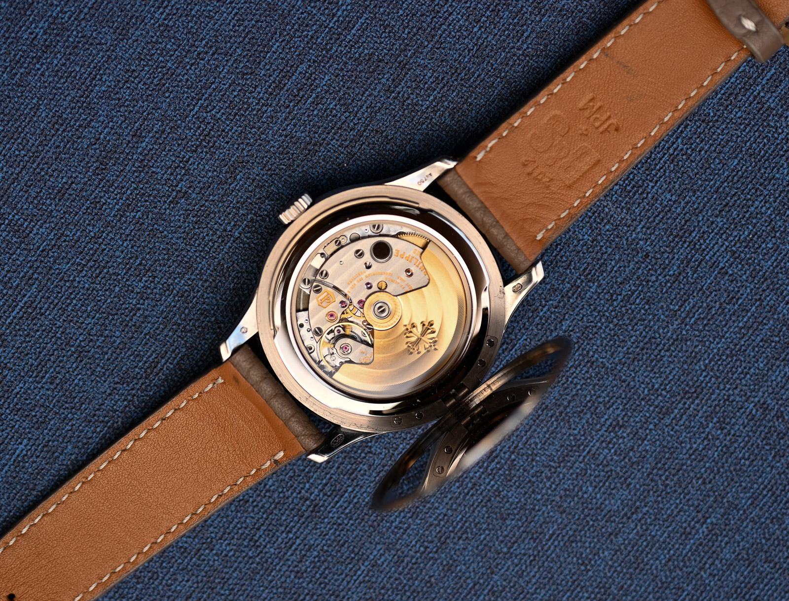 Durch ein verstecktes Scharnier, lässt sich der sogenannte Offiziersdeckel öffnen, um einen Blick in das wunderschöne Werk zu gestatten. Ich habe sonst noch nie so ein filigranes Scharnier gesehen. Natürlich völlig nutzlos, aber Patek tut es, weil sie es können.