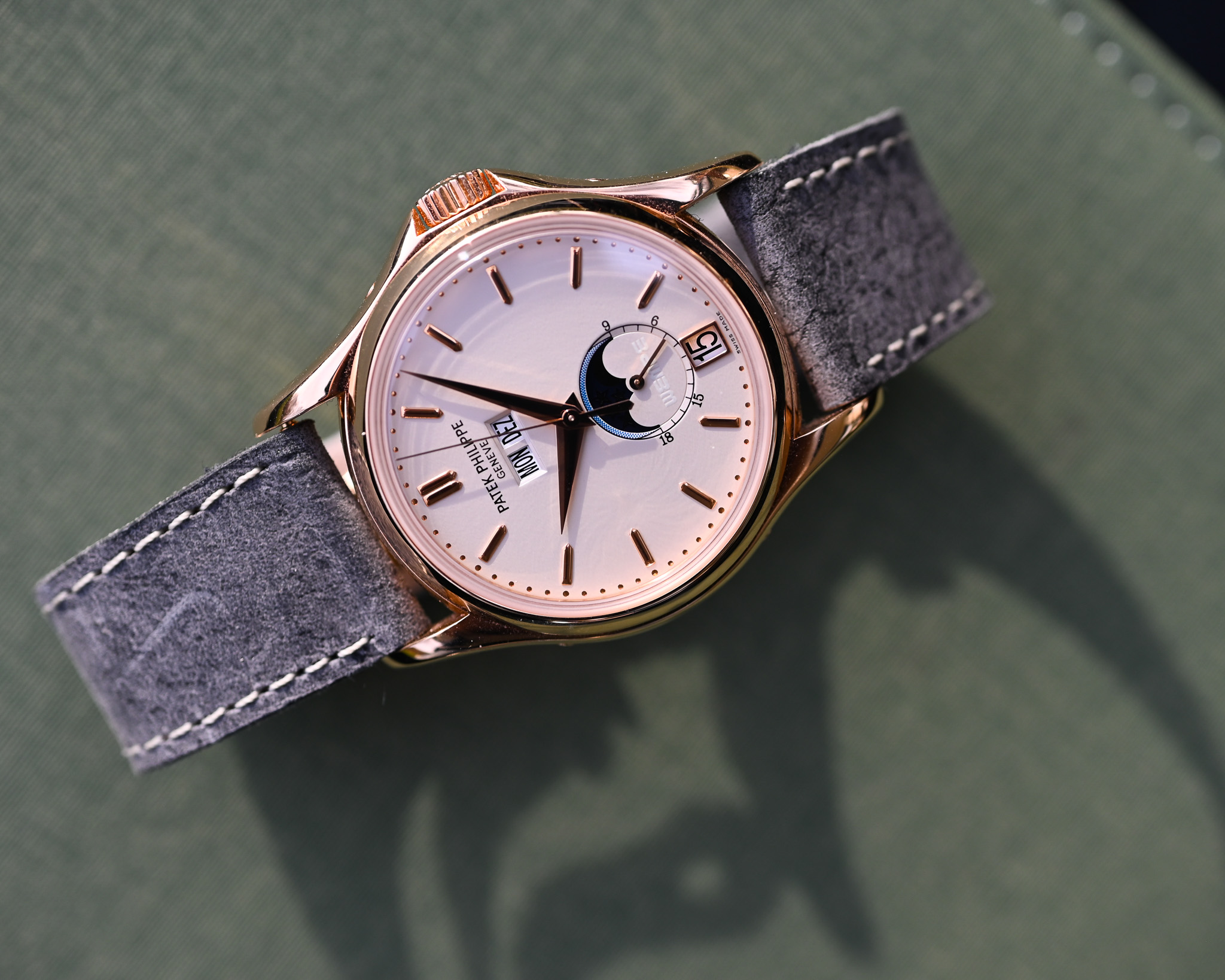 Das originale Patek Philippe Krokodillederband ist ungetragen. Zusätzlich wird ein weiches, komfortables graues Wildlederband mitgeliefert, das der Uhr eine sportliche Leichtigkeit verleiht und ihre Vielseitigkeit unterstreicht.