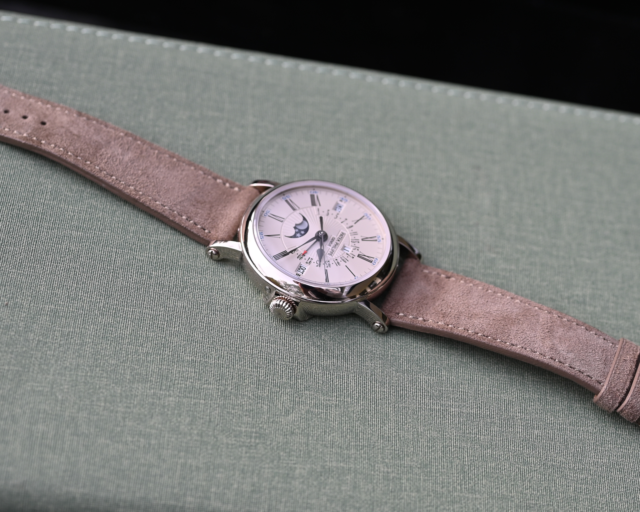 Das silber-opaline Zifferblatt zeigt den ewigen Kalender mit retrograder Datumsanzeige, Wochentag, Monat und Mondphase – übersichtlich gestaltet und perfekt ausbalanciert. Im Inneren arbeitet das automatische Kaliber 324 S QR, ein technisch anspruchsvolles Werk mit feinster Finissierung.