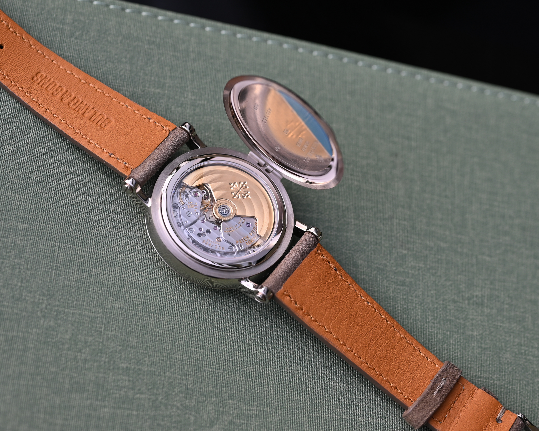 Die Patek Philippe 5159G-001 verbindet klassische Ästhetik mit komplexer Mechanik. Das Modell präsentiert sich in einem eleganten Gehäuse aus 18-karätigem Weißgold mit charakteristischem, klappbarem Offiziersboden – eine Hommage an die große Tradition der Genfer Uhrmacherkunst.