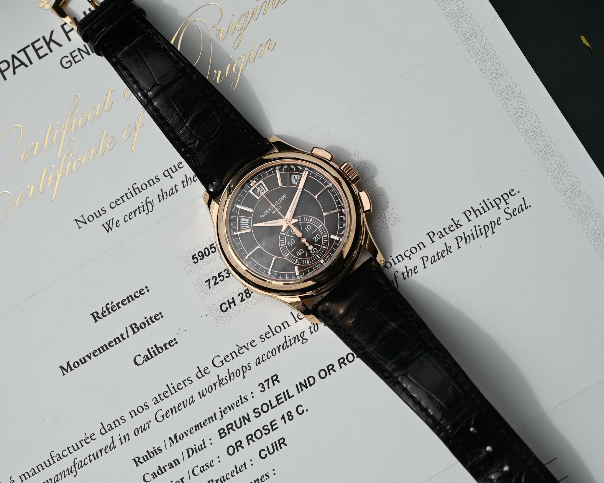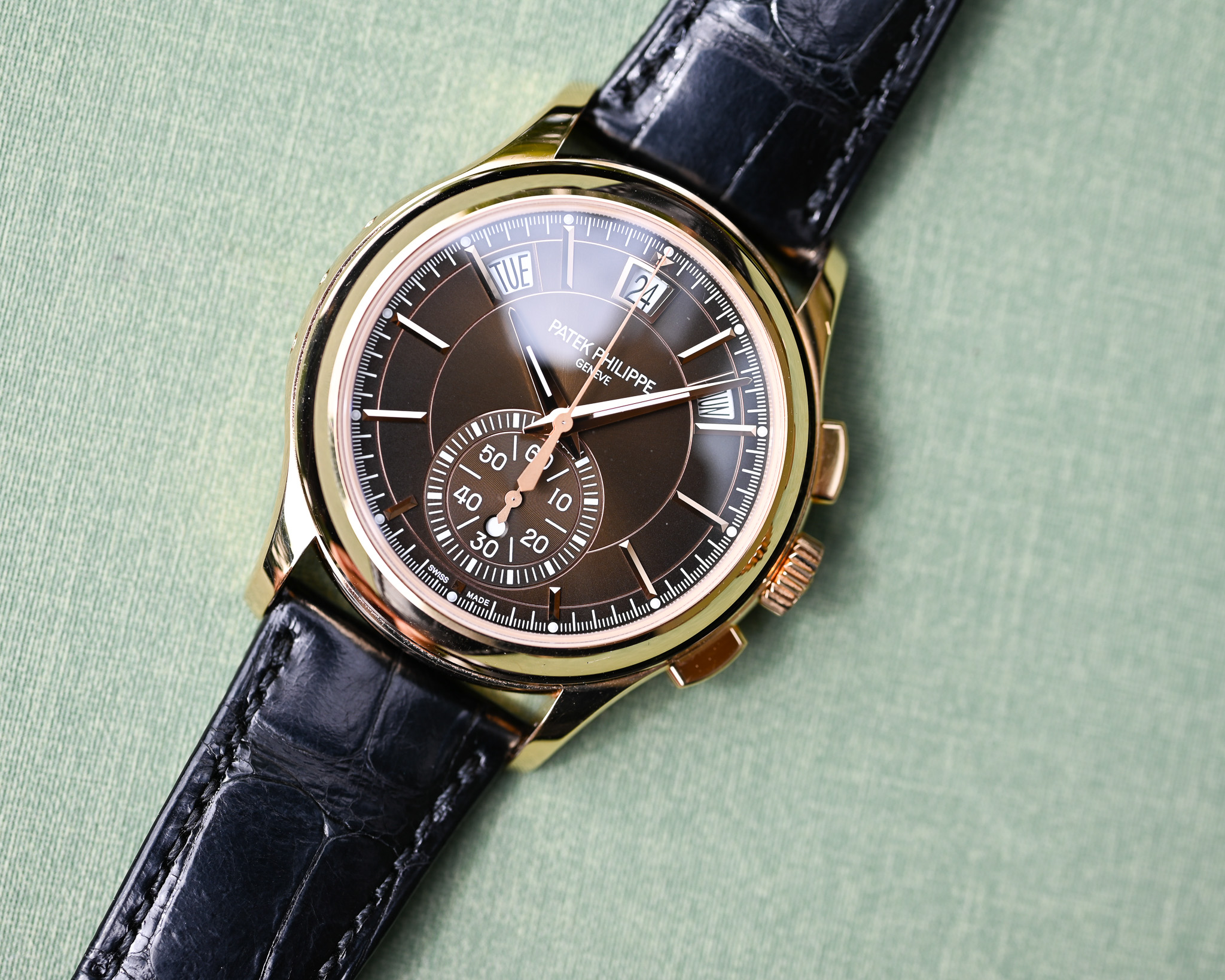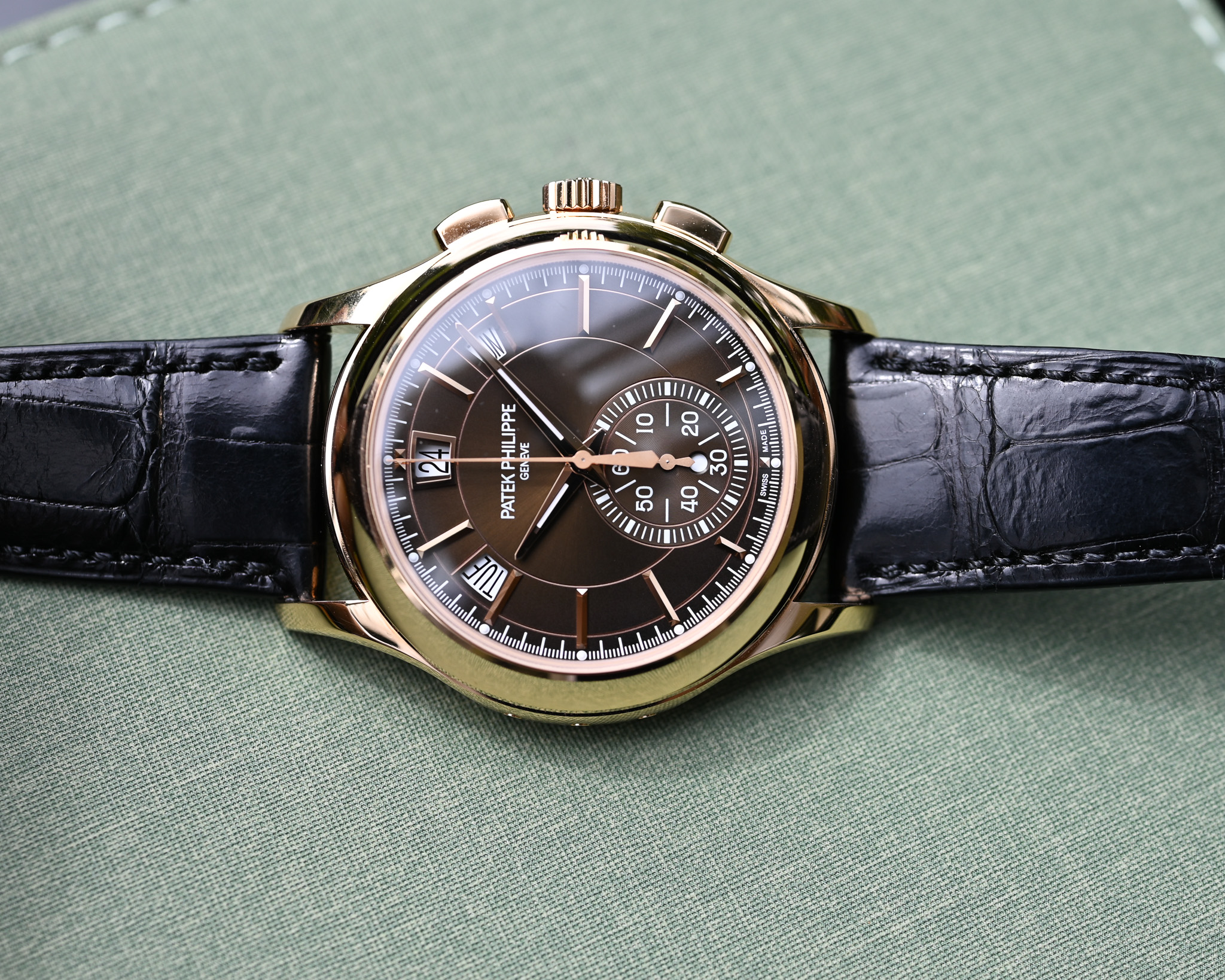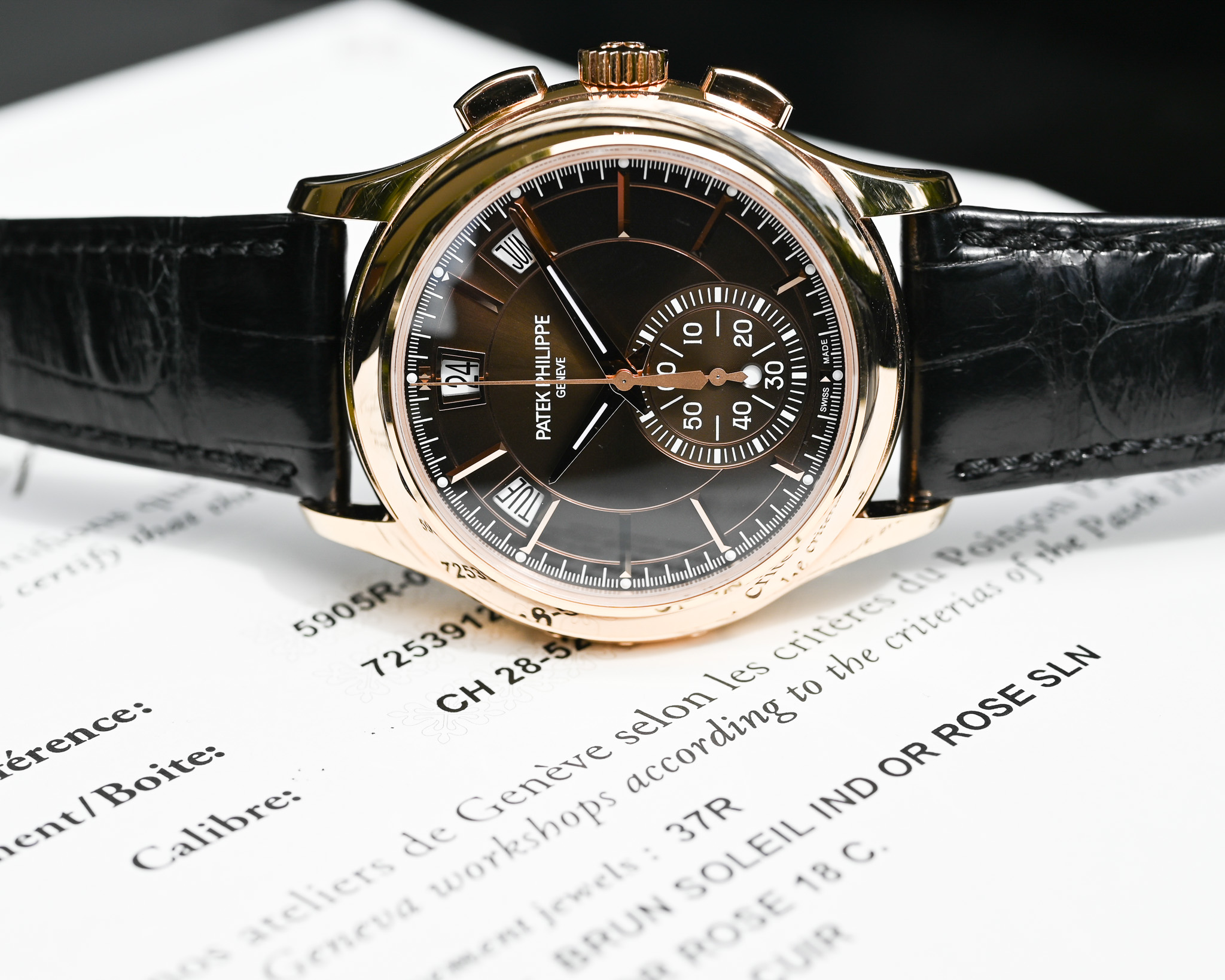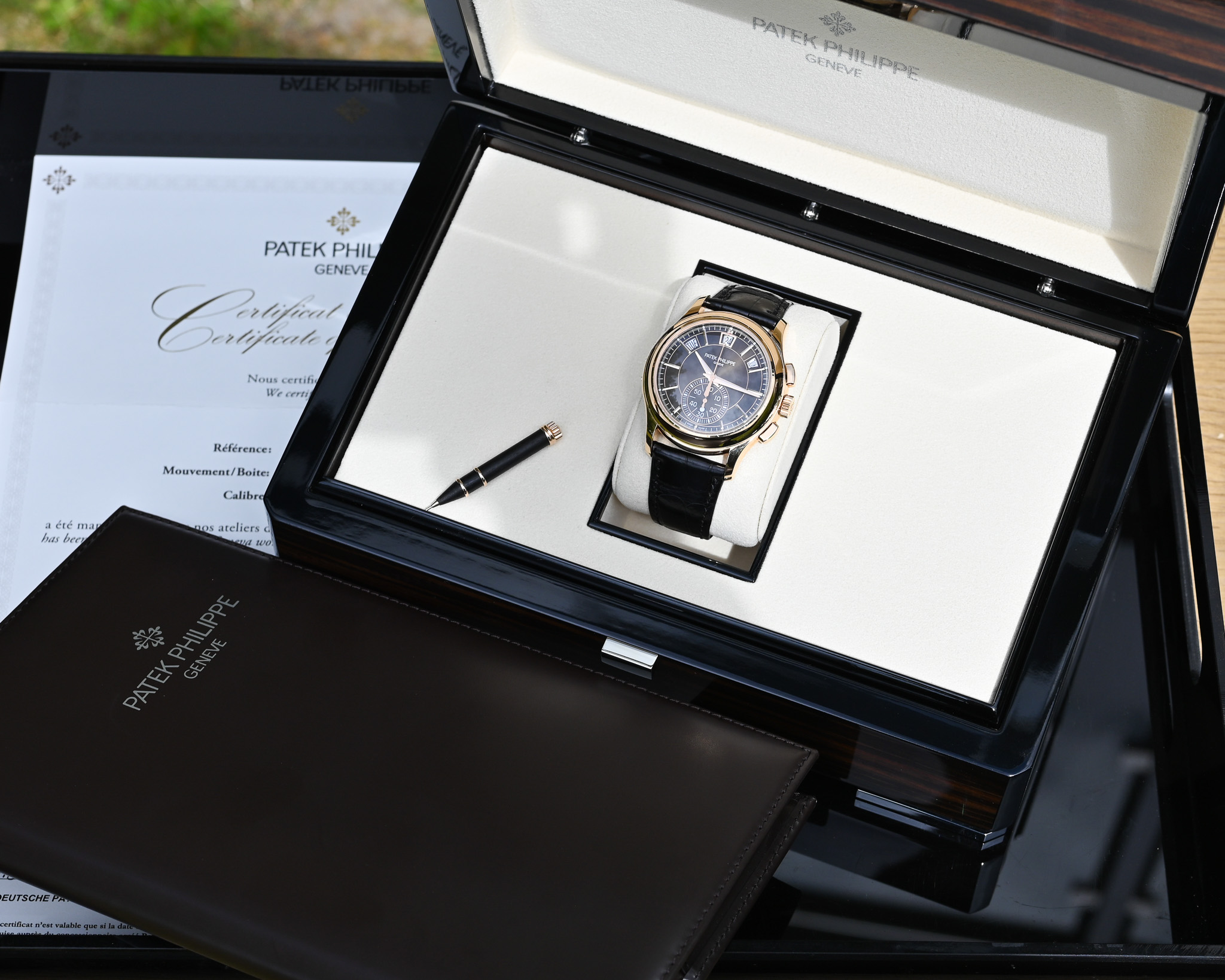 Zu verkaufen ist die Patek Philippe 5905R-001 mit dem schönen Schokblatt.