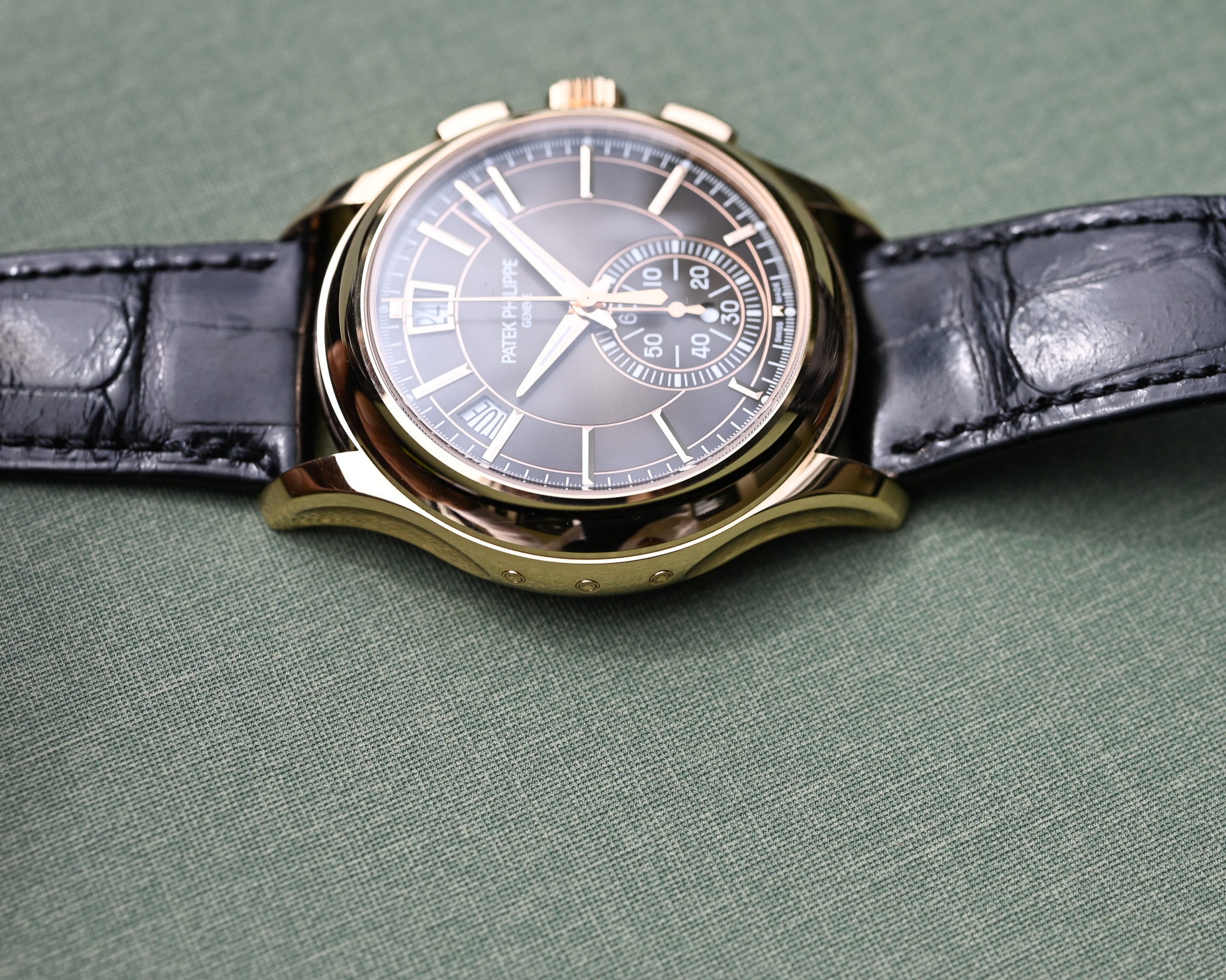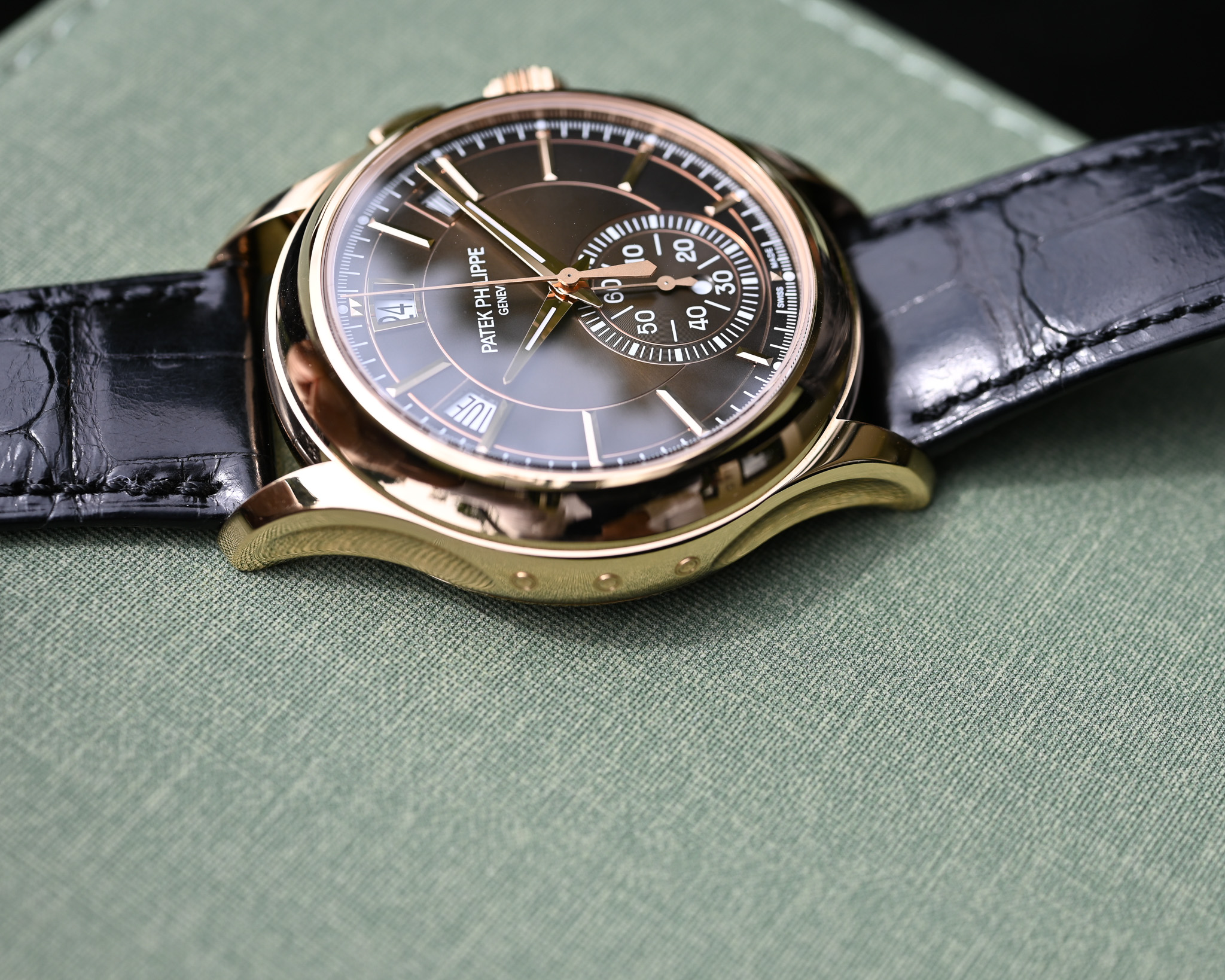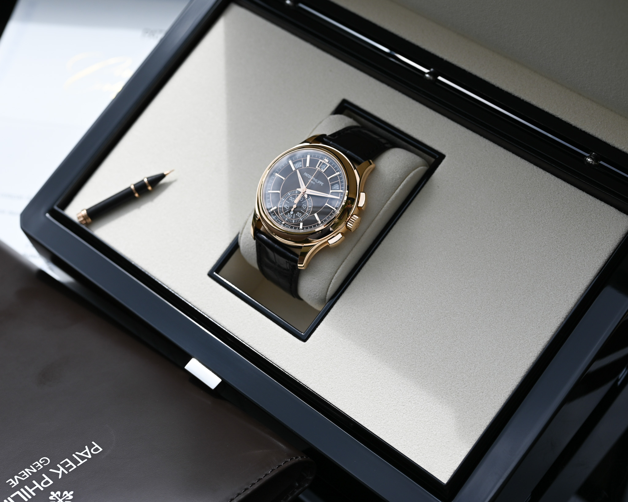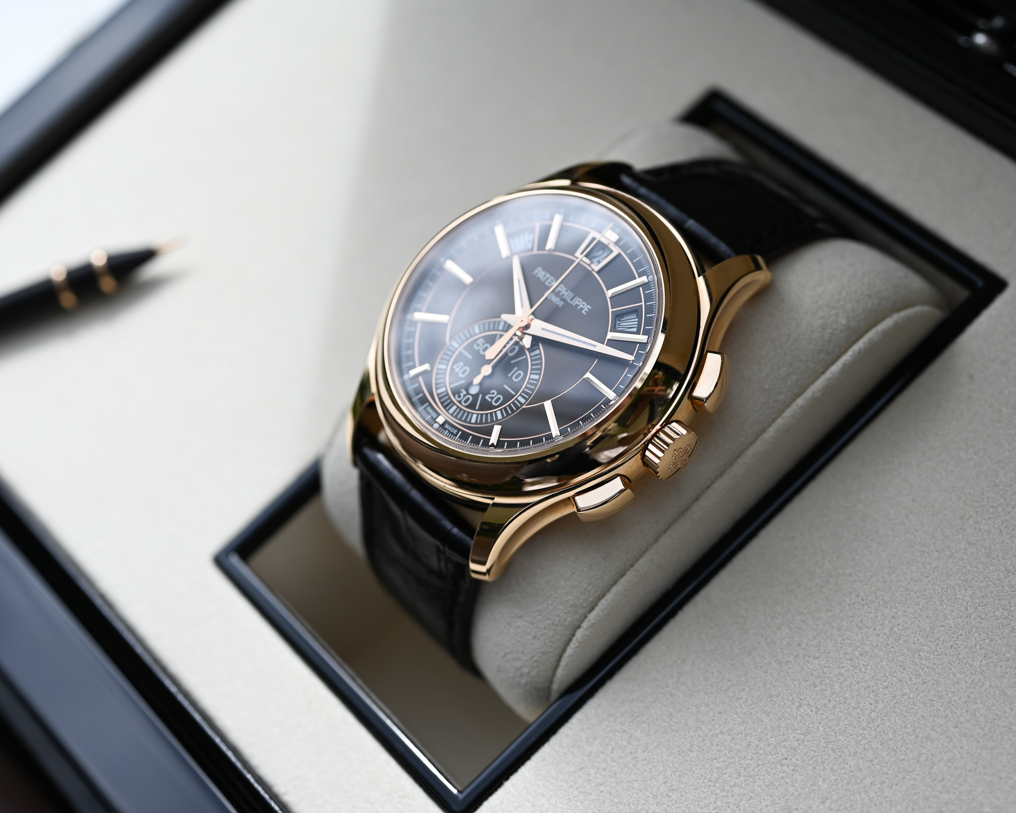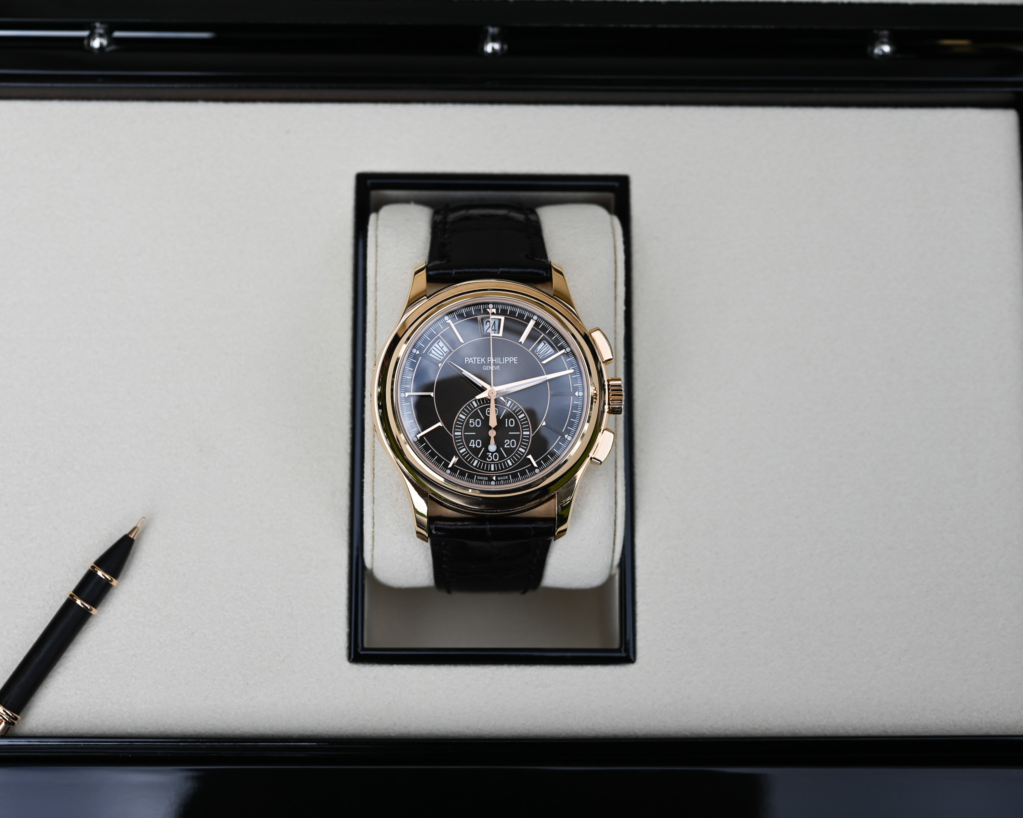 Zu verkaufen ist die Patek Philippe 5905R-001 mit dem schönen Schokblatt.