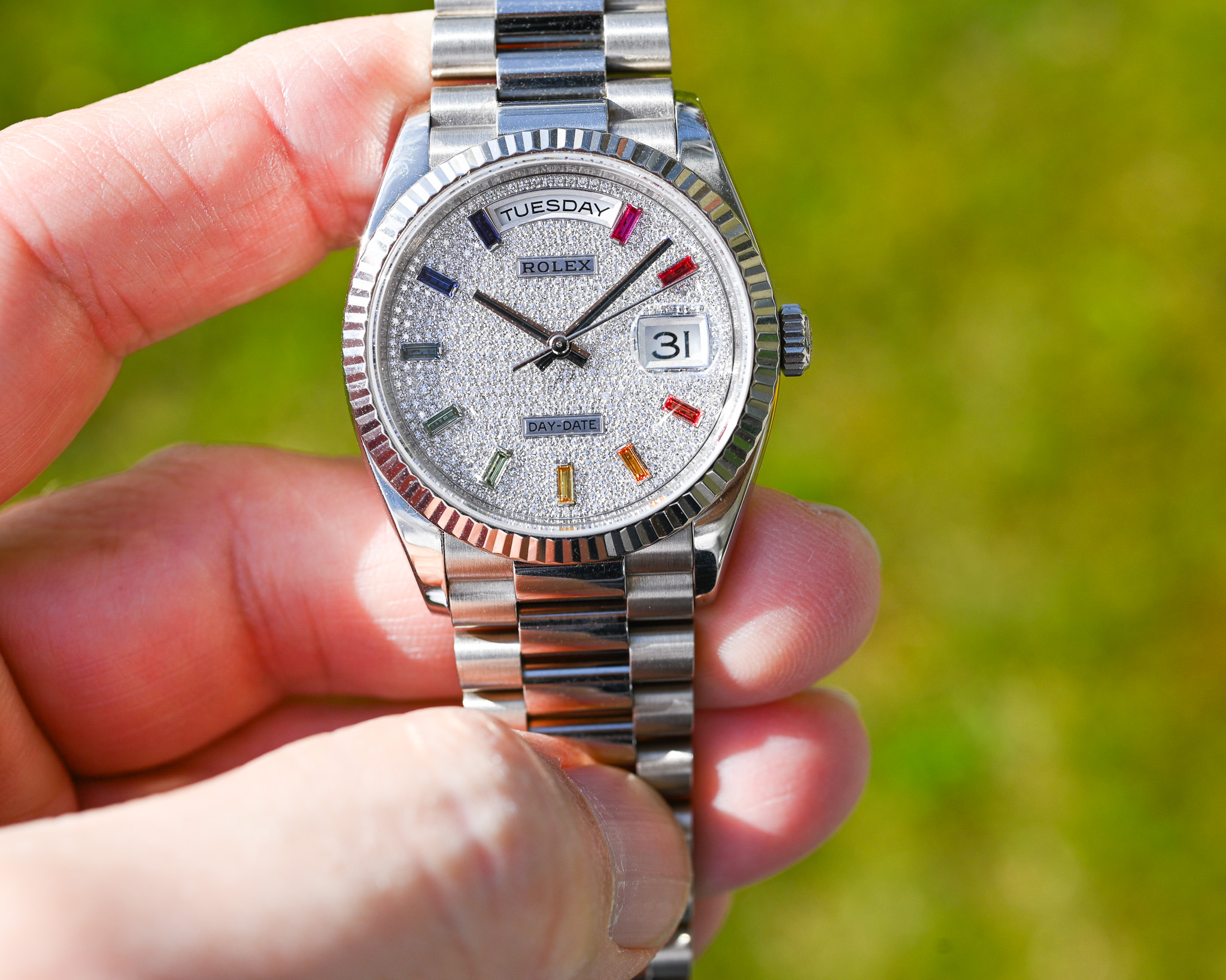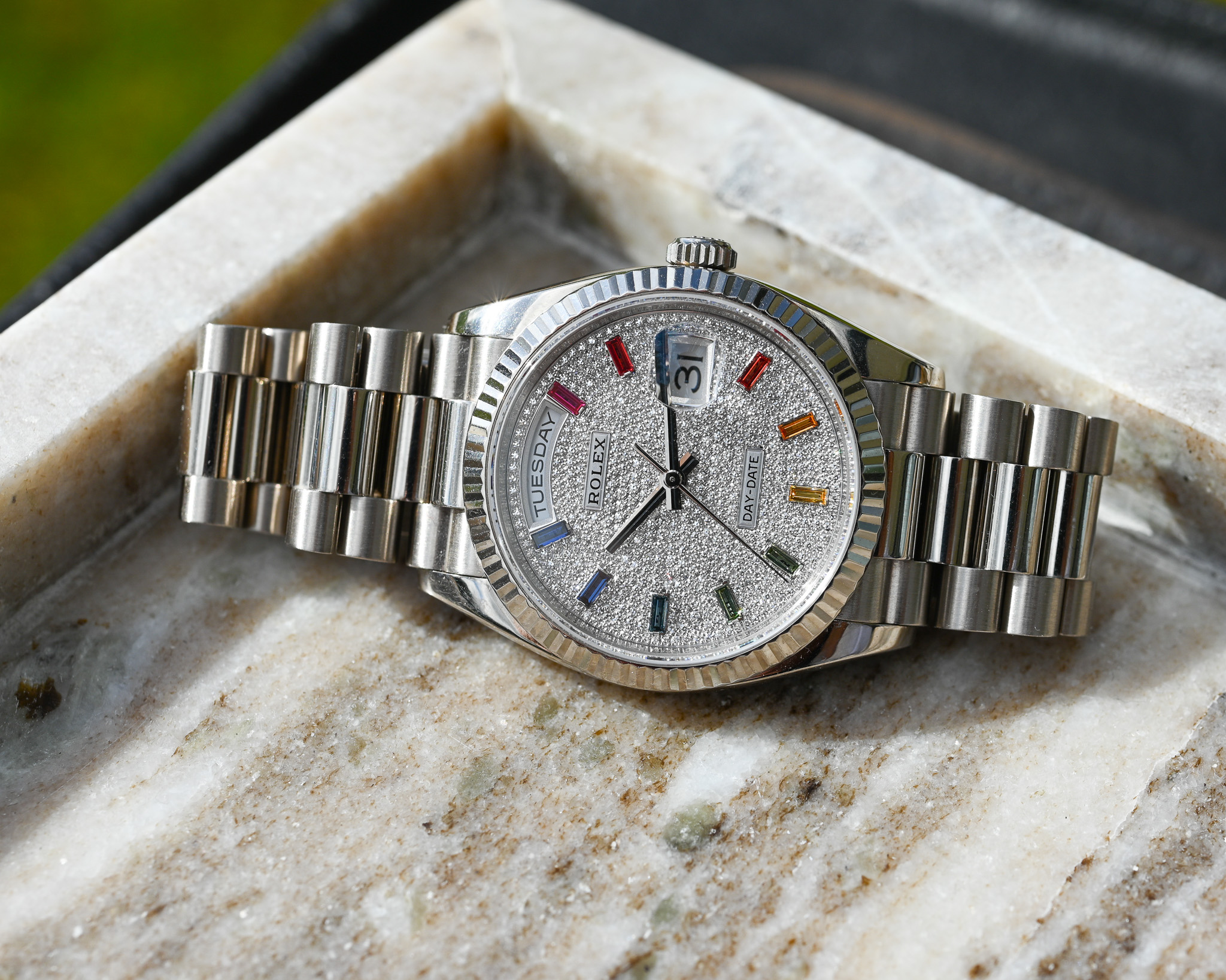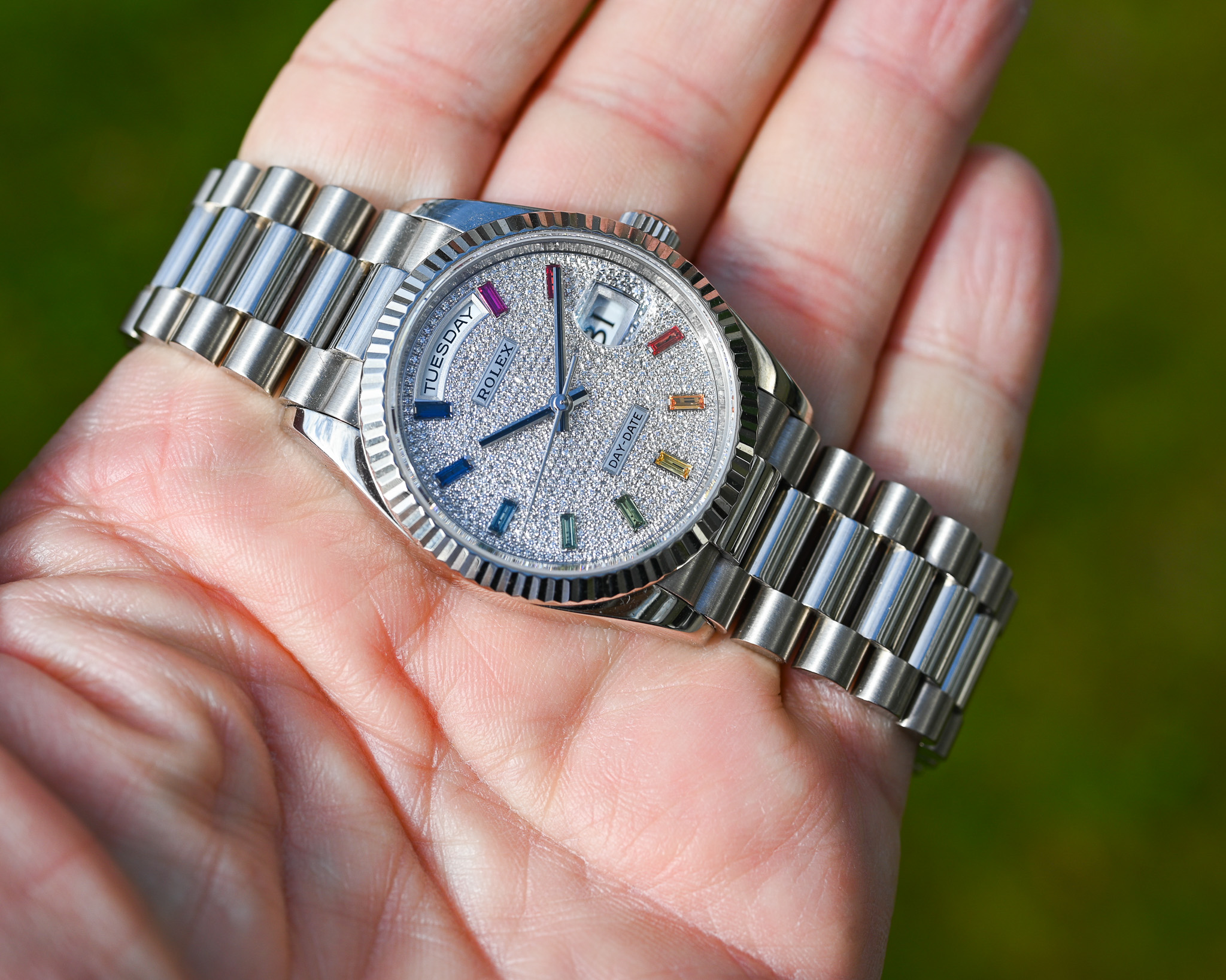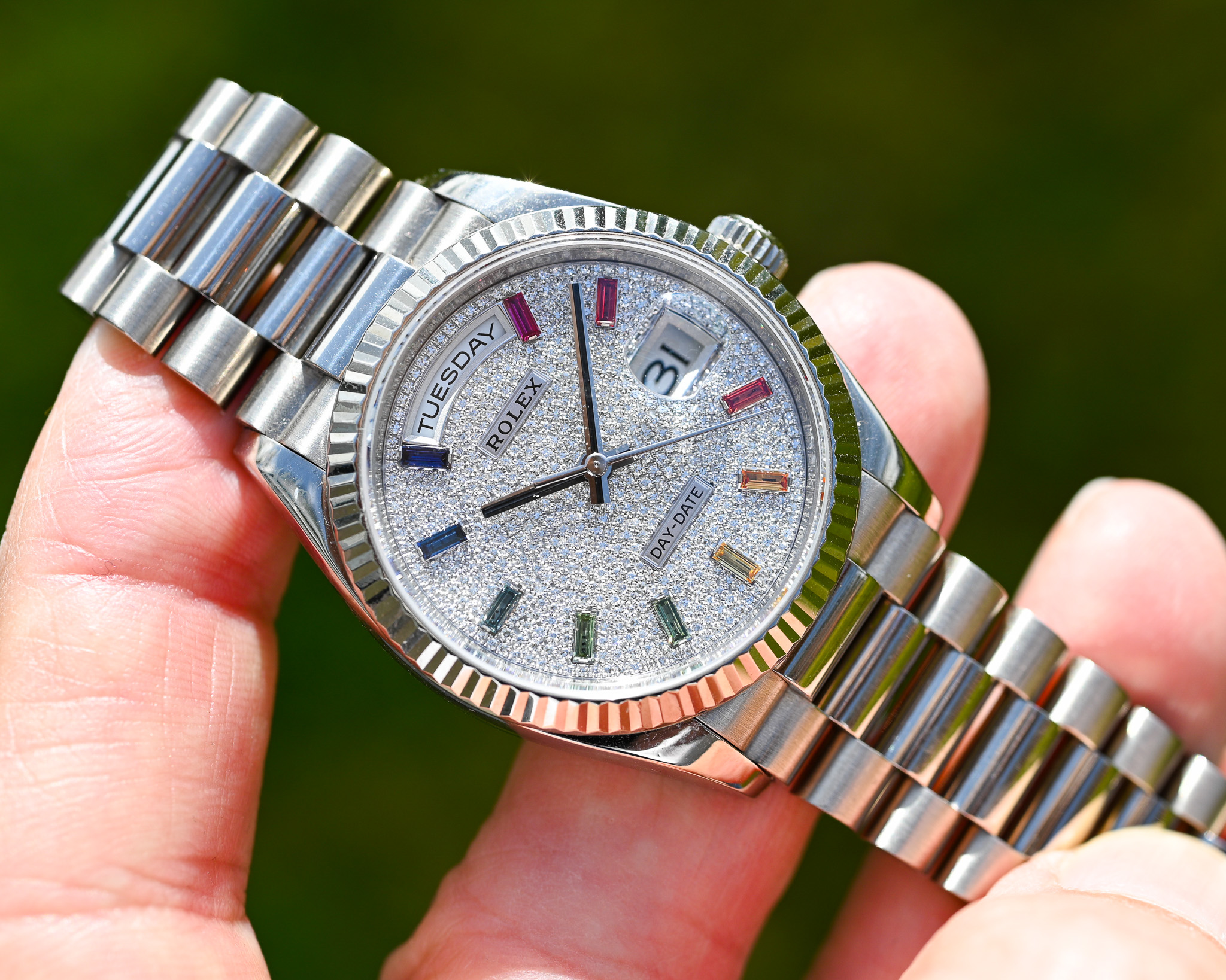 - Zifferblatt: Factory Diamond Pavé mit Rainbow-Saphiren