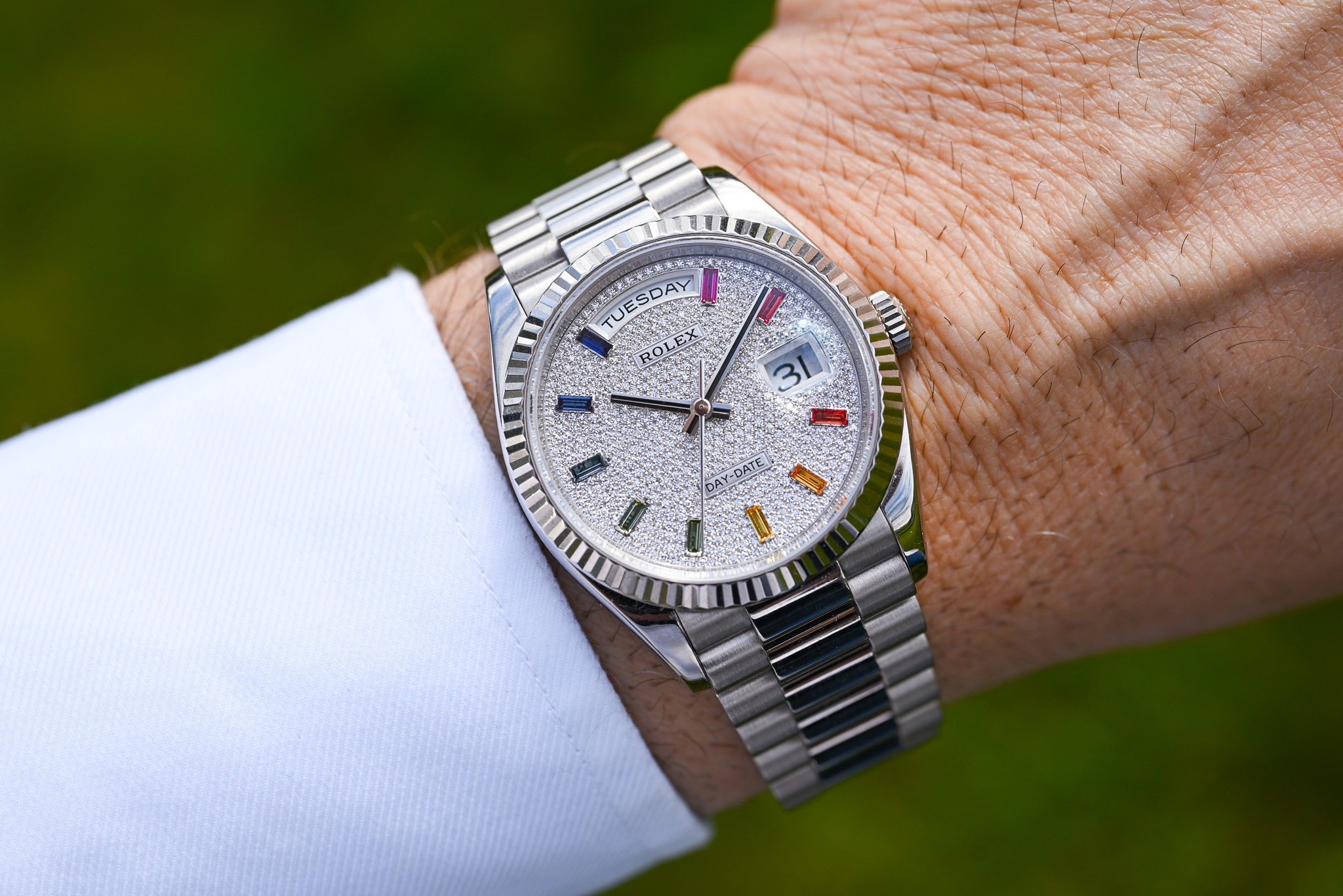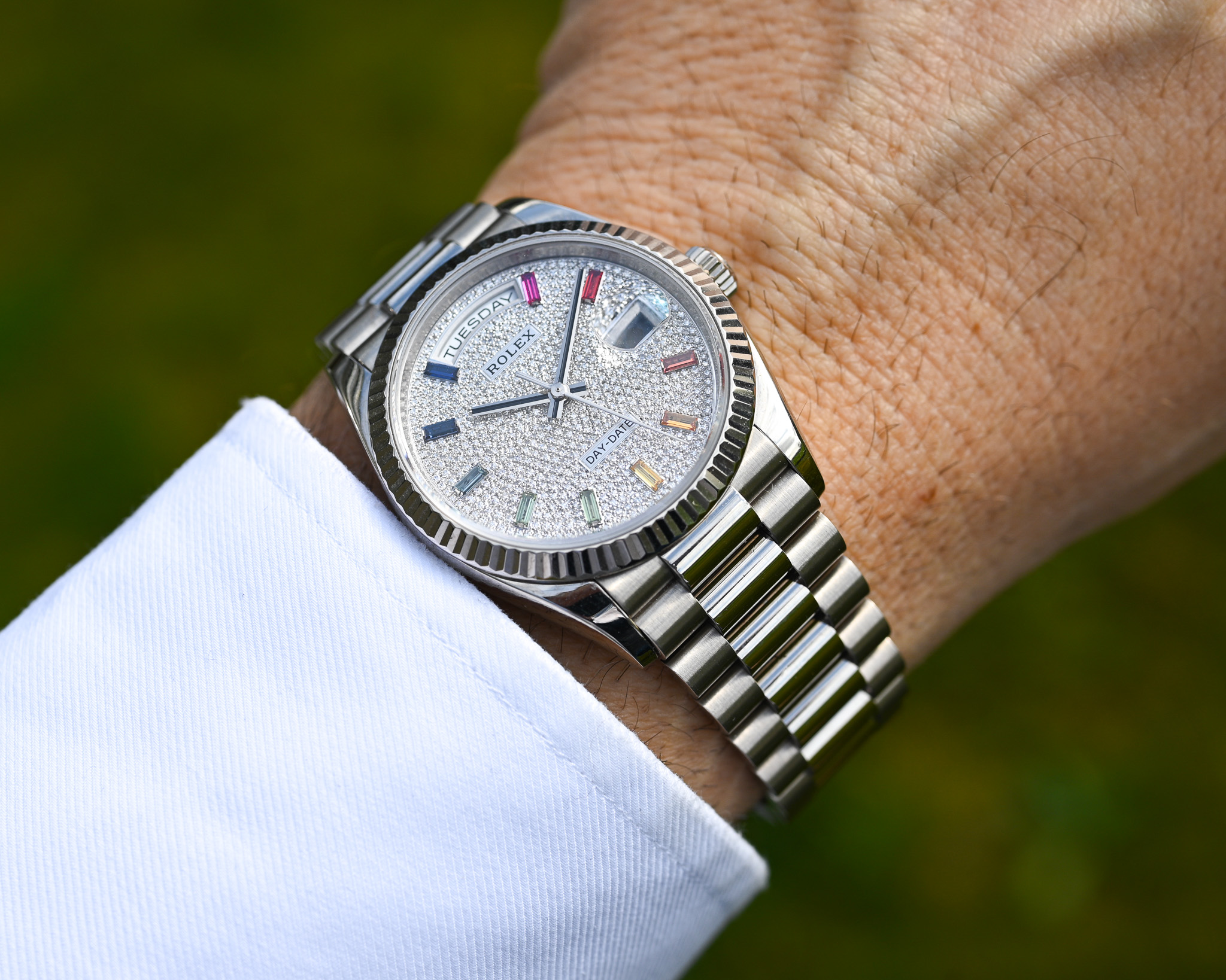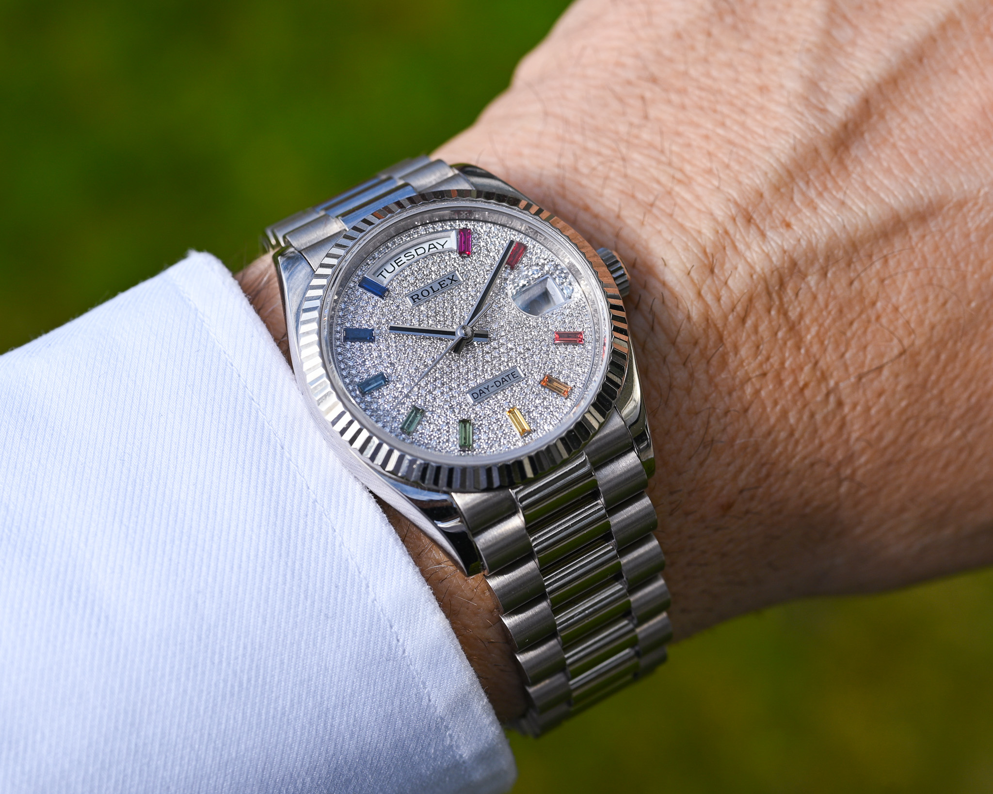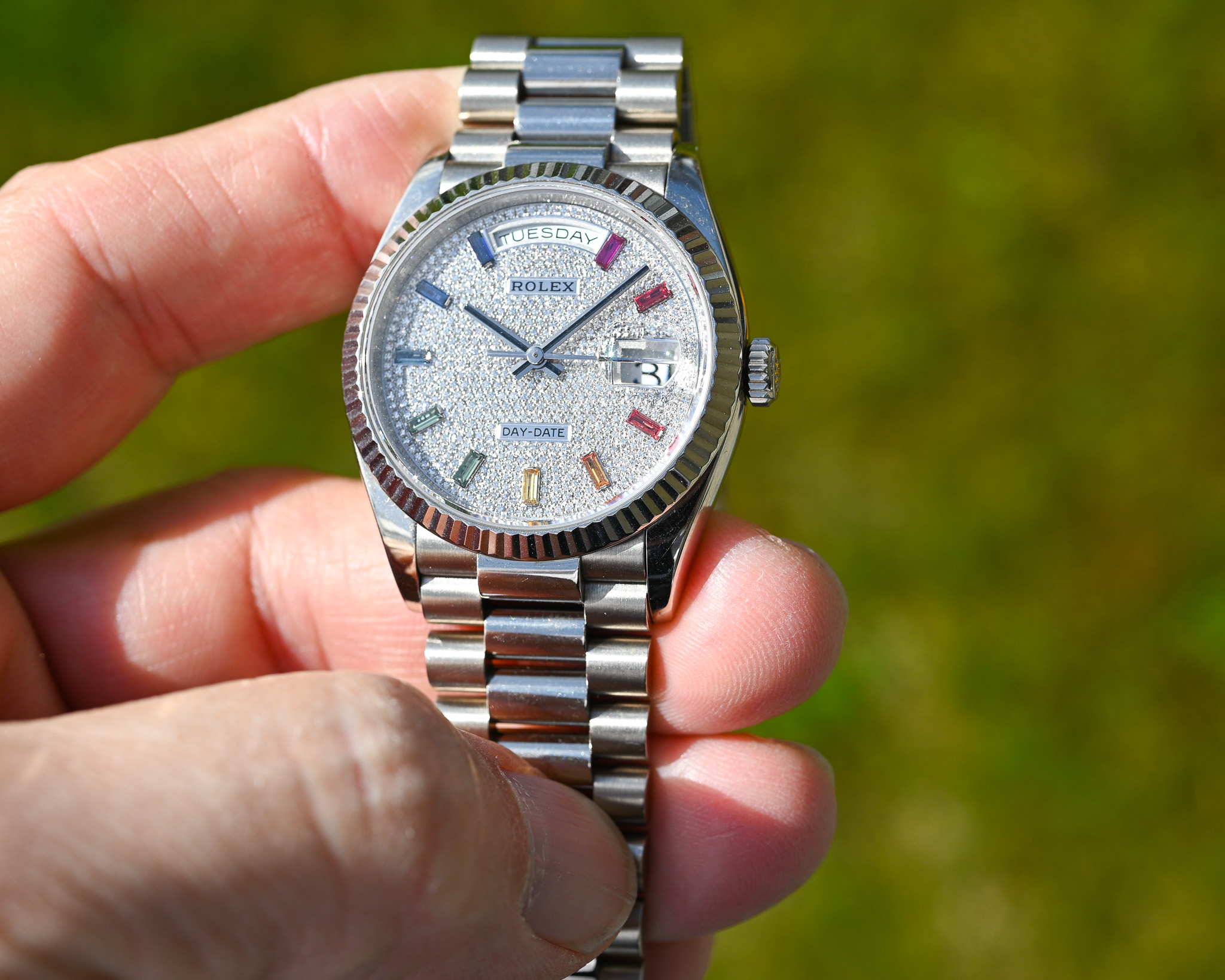 - Zifferblatt: Factory Diamond Pavé mit Rainbow-Saphiren