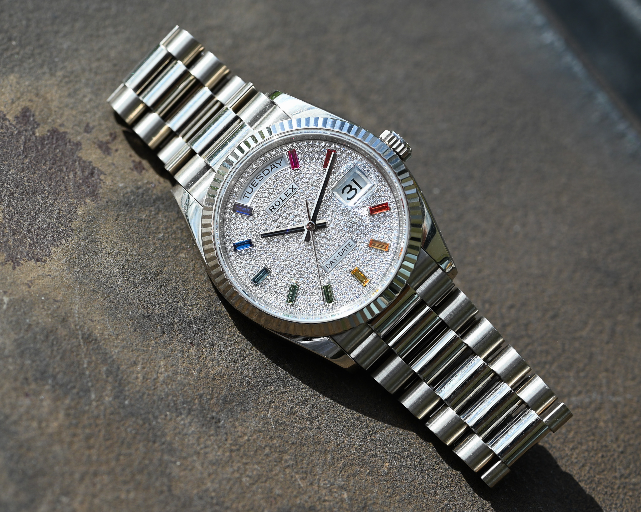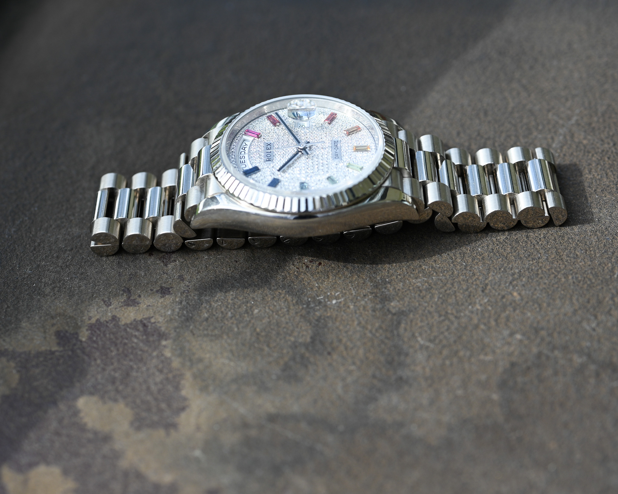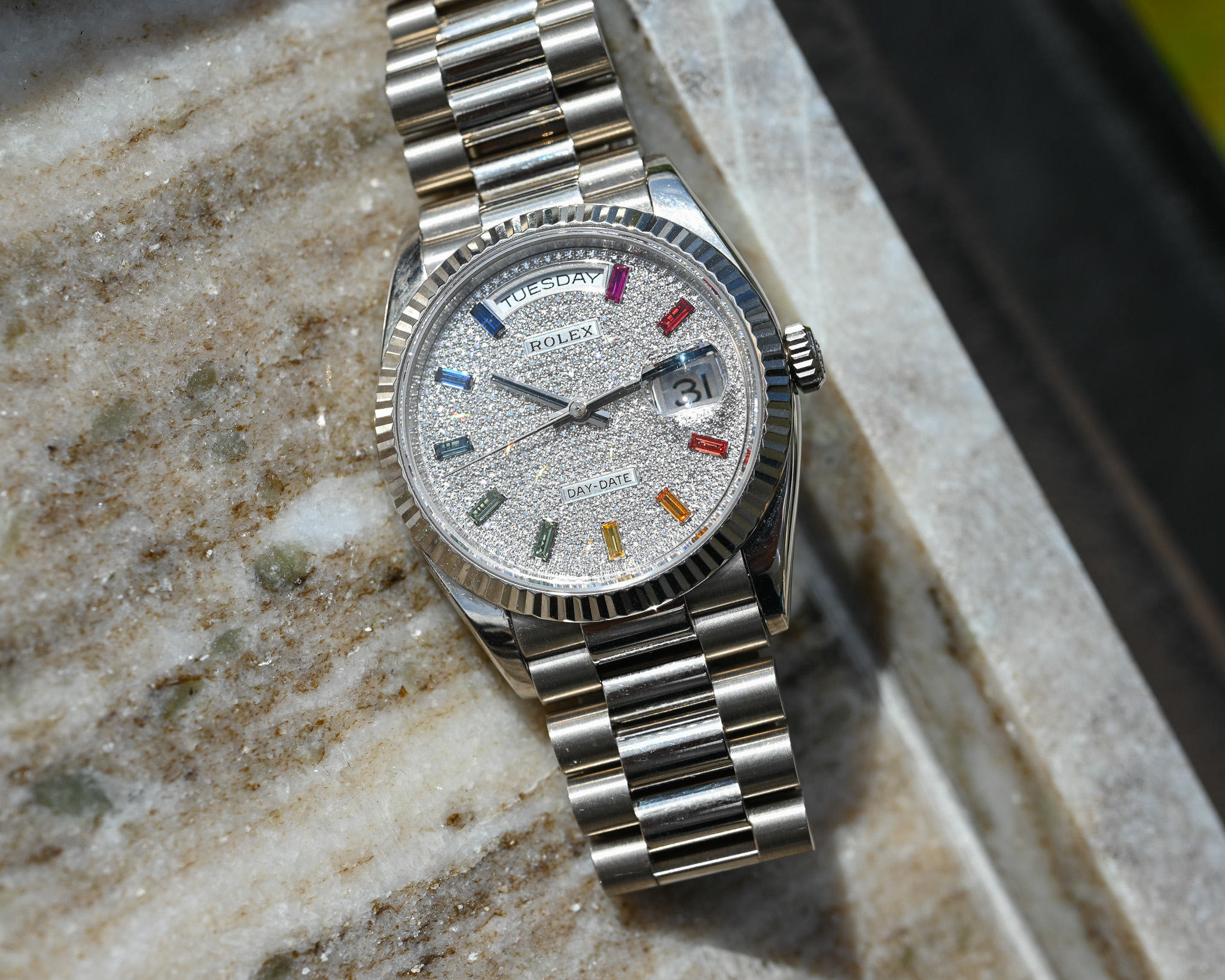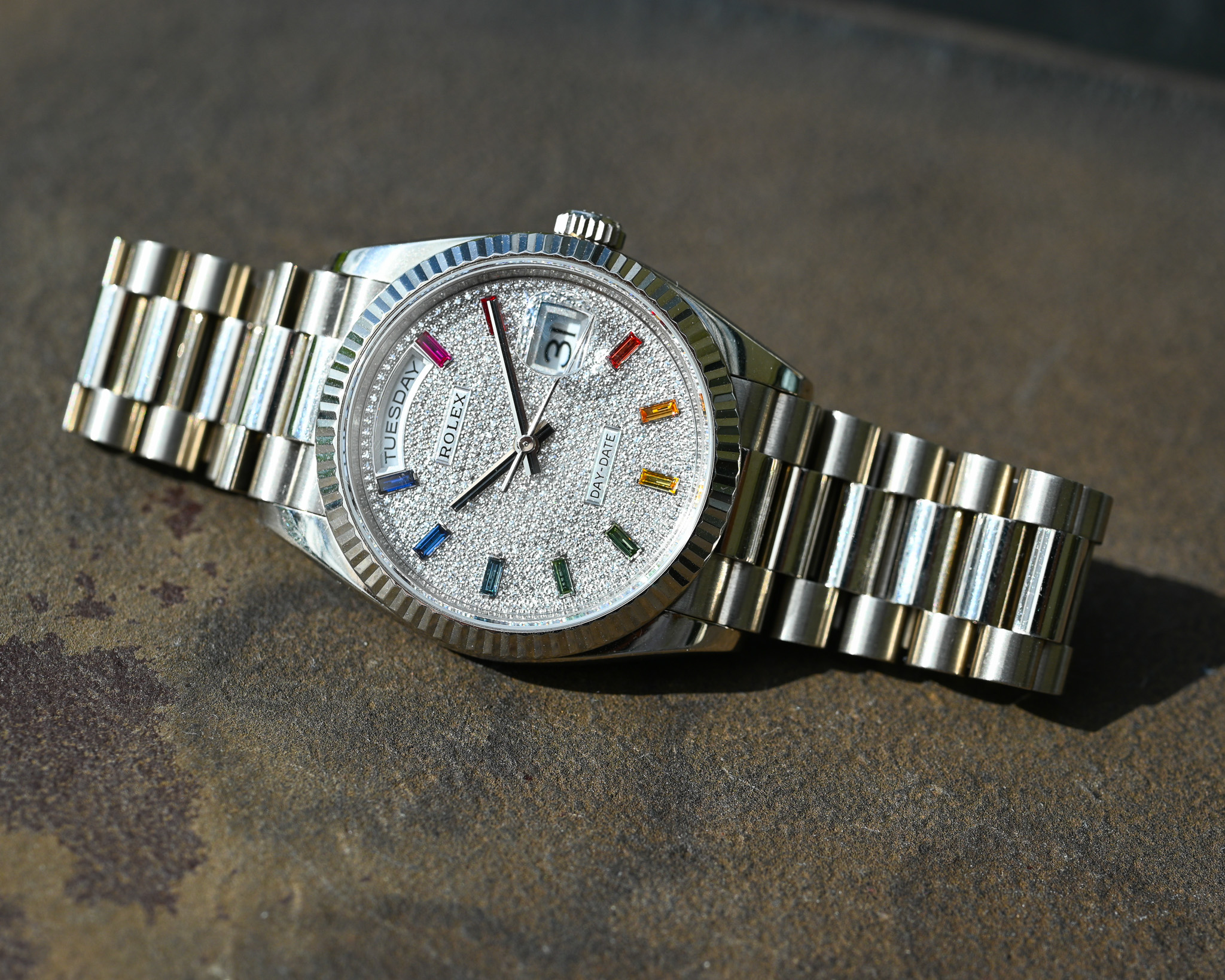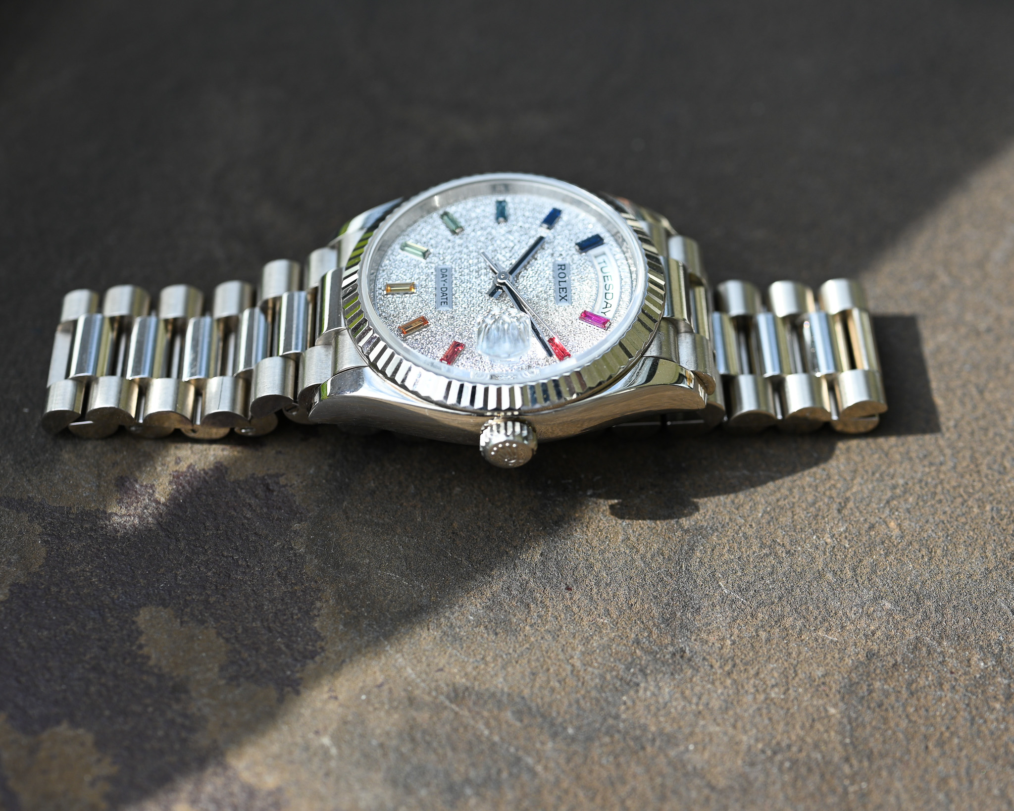 Das aufwendig gefertigte Zifferblatt kombiniert feinste Diamanten mit farbigen Saphiren im Baguette-Schliff und erzeugt so den begehrten Rainbow-Effekt – ein Ausdruck höchster Juwelierskunst und exklusiver Rolex-Manufakturarbeit.
