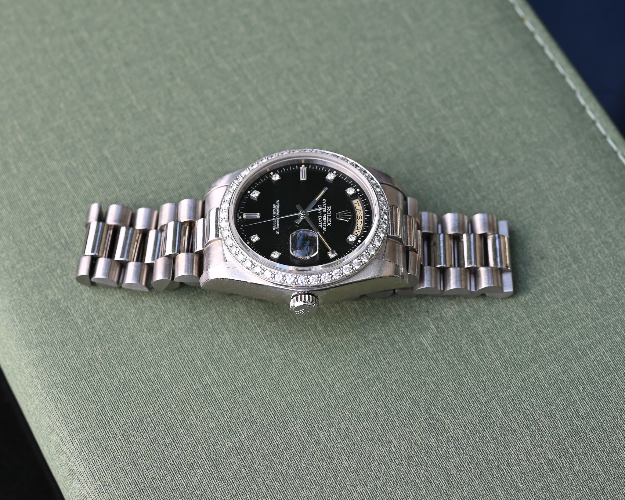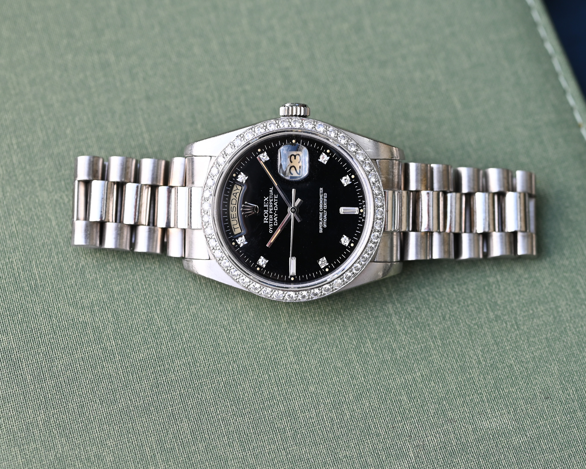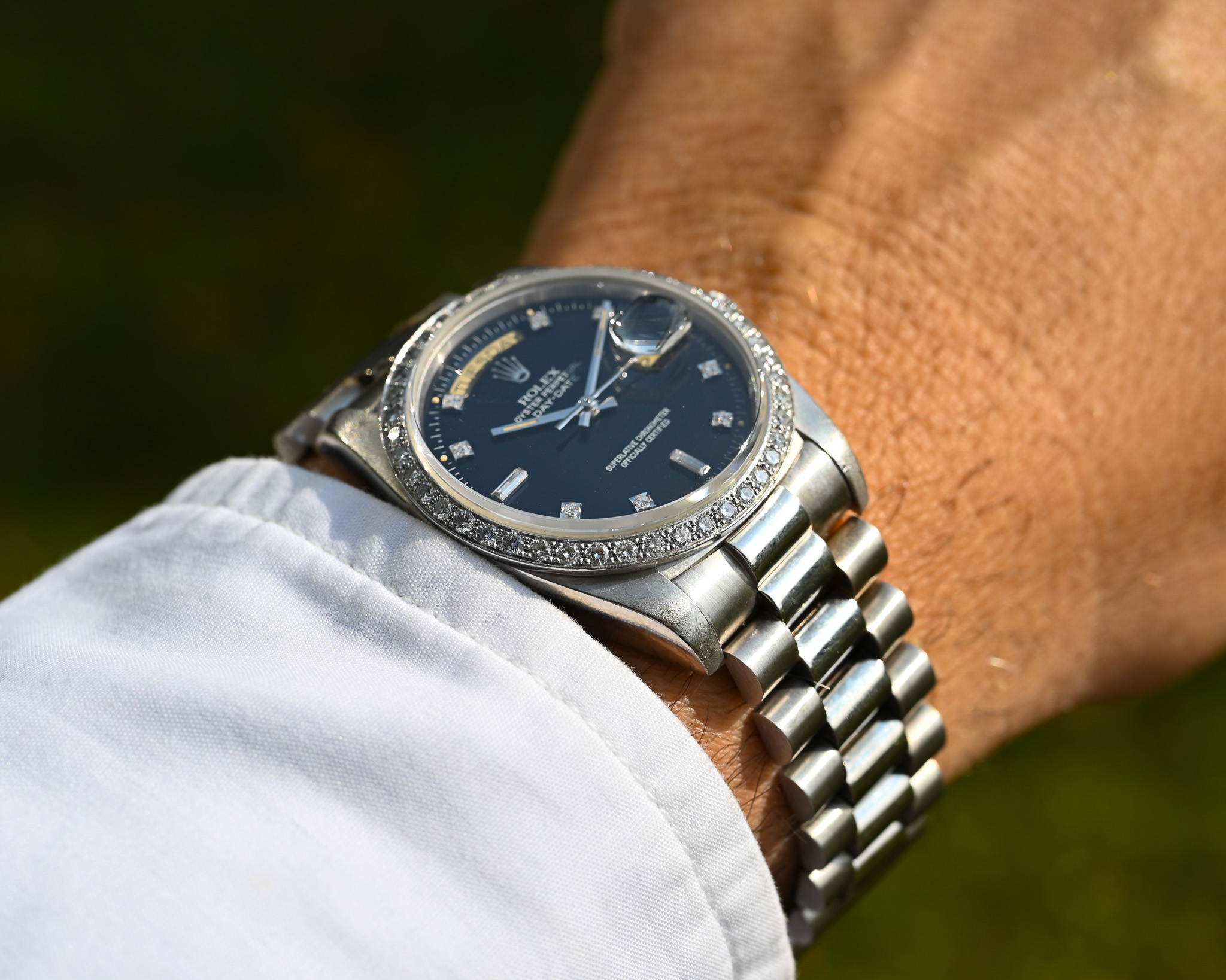 Im Vergleich zu aktuellen Modellen bietet diese Uhr einen enormen Gegenwert: Eine moderne Day-Date 36 mm mit Diamantblatt und – Lünette liegt heute bei etwa 53.000 €. Natürlich ist ein direkter Vergleich schwierig, aber schon damals gehörte die 18049 zu den hochpreisigsten Modellen im Rolex-Portfolio. Mit diesem Exemplar erwerben Sie nicht nur eine luxuriöse Uhr, sondern auch ein Stück Uhrengeschichte – und das in einem außergewöhnlich guten Zustand zu einem absolut fairen Preis.