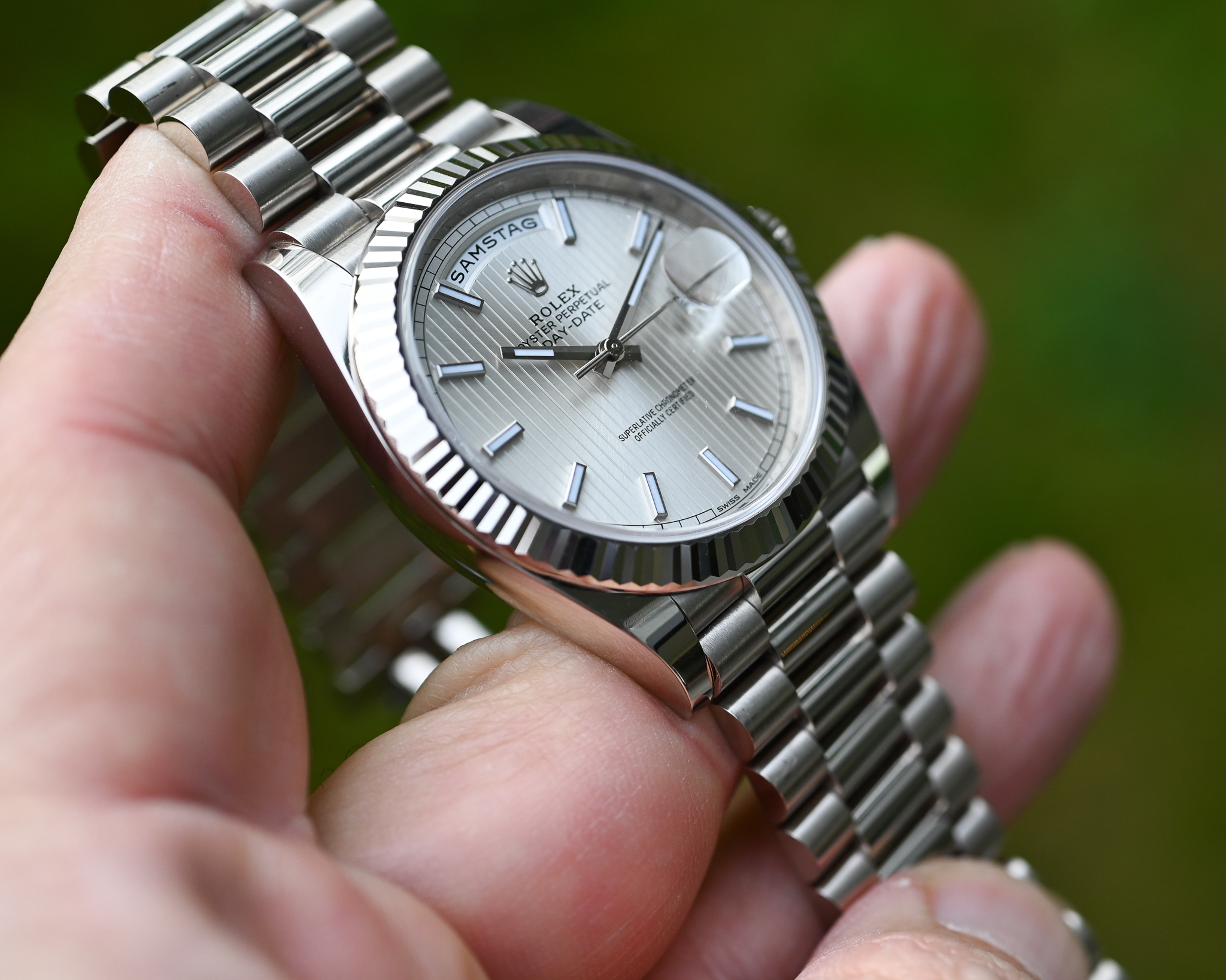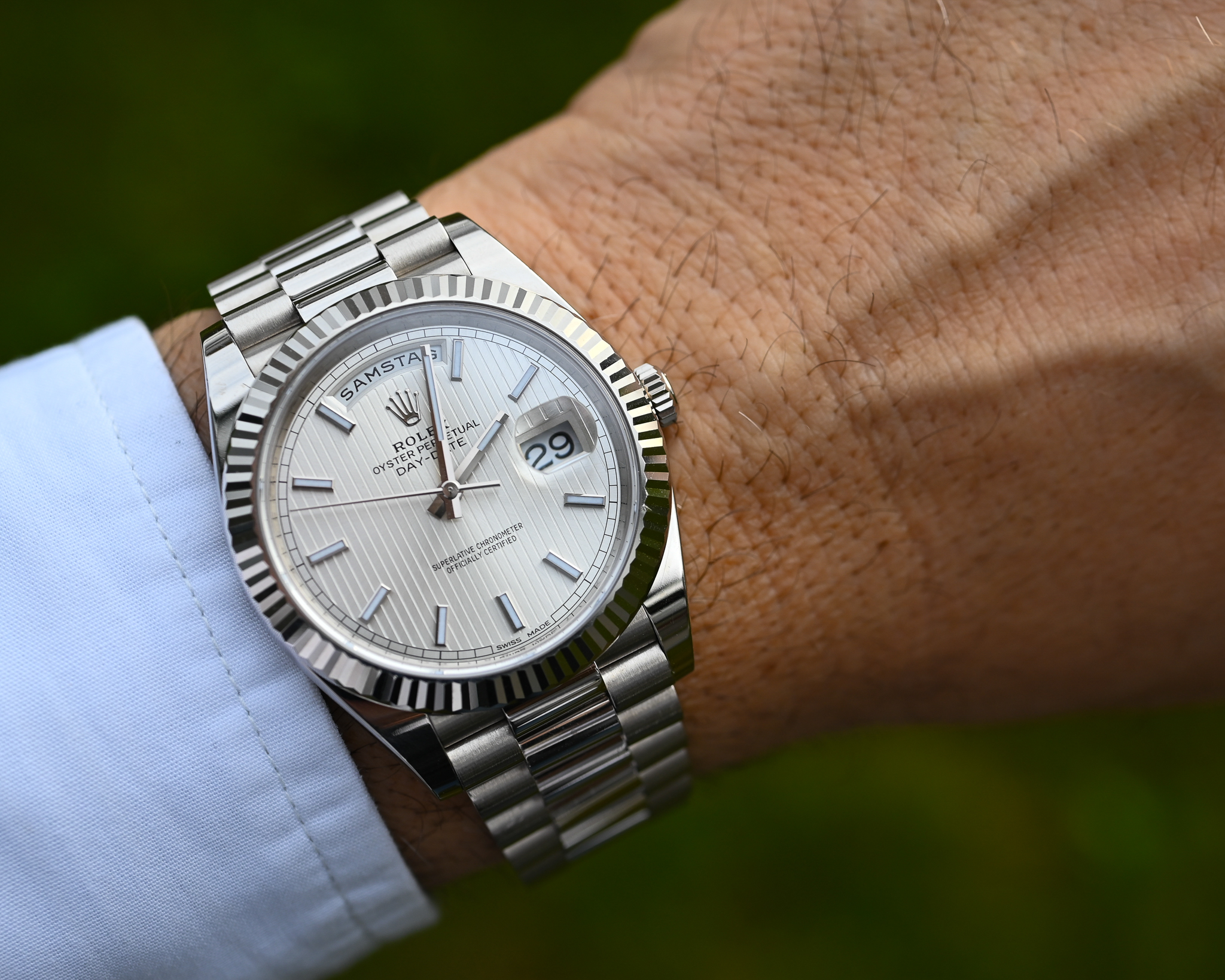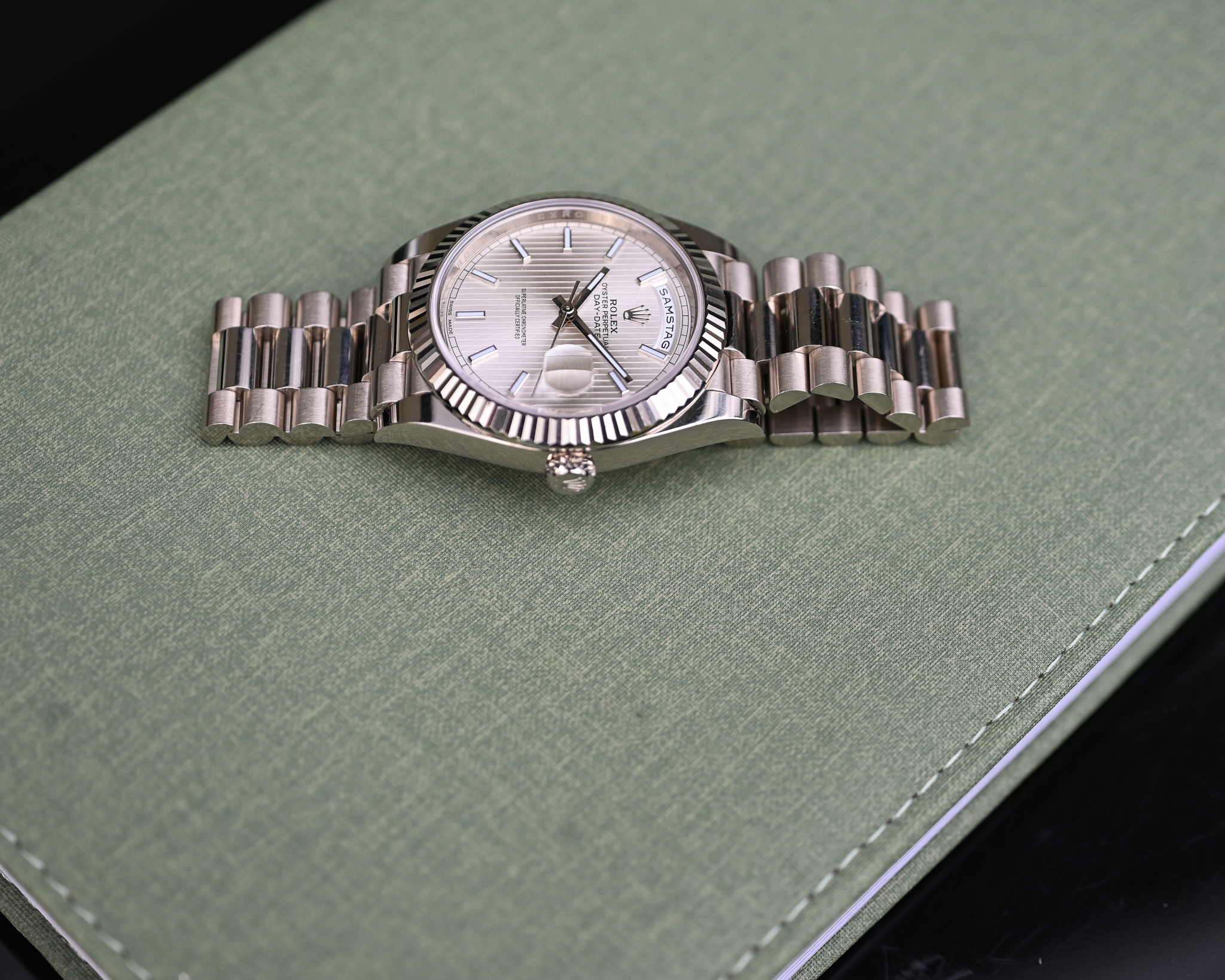 Ein besonderes Highlight dieser Day-Date ist das silberne Tapestry-Zifferblatt. Dieses seltene Blatt wirkt auf den ersten Blick dezent und zurückhaltend, offenbart jedoch bei näherer Betrachtung eine faszinierende Tiefenwirkung. Die vertikale Struktur verleiht dem Zifferblatt eine elegante Spannung und macht die Uhr zu einem subtilen, aber außergewöhnlich raffinierten Blickfang.