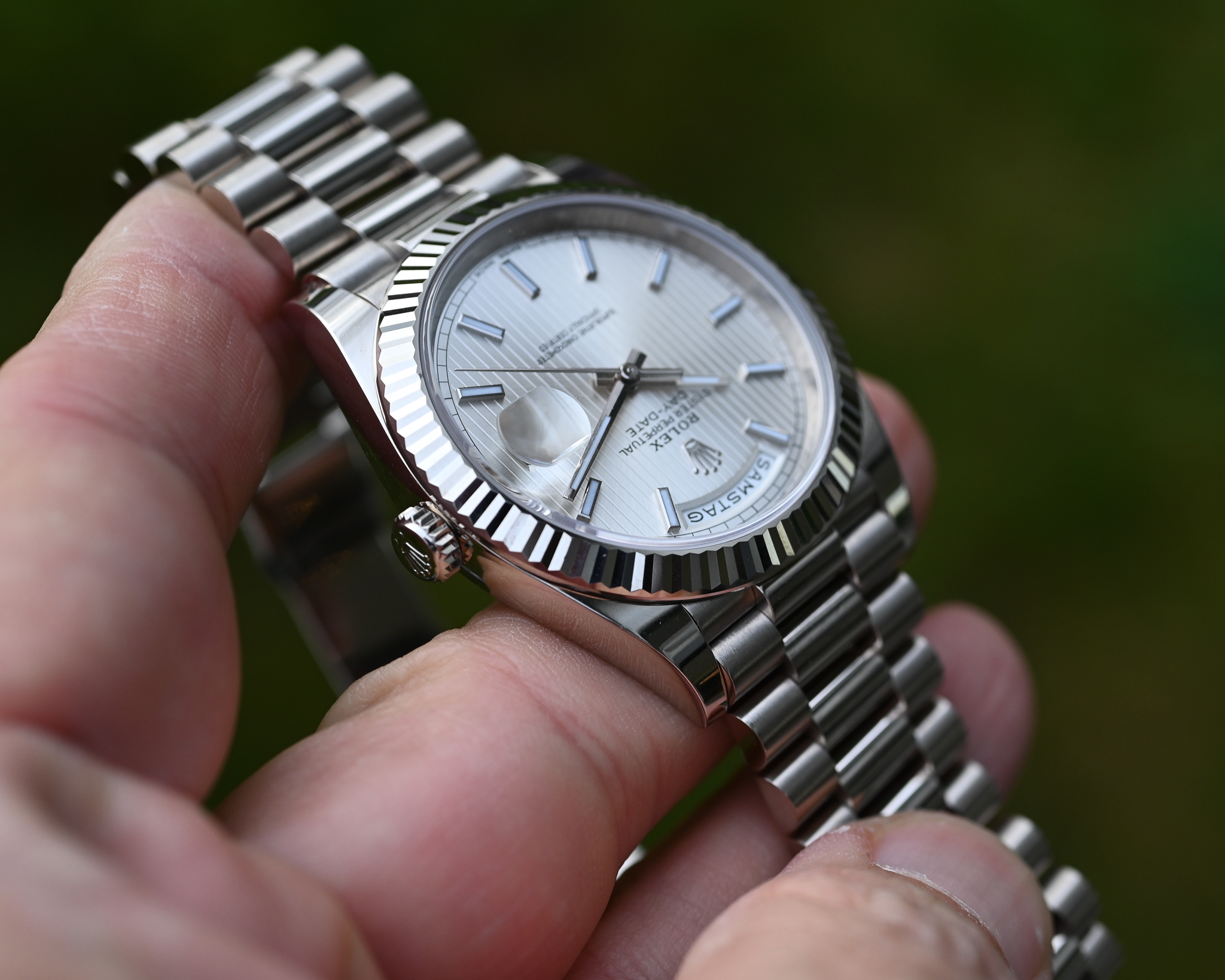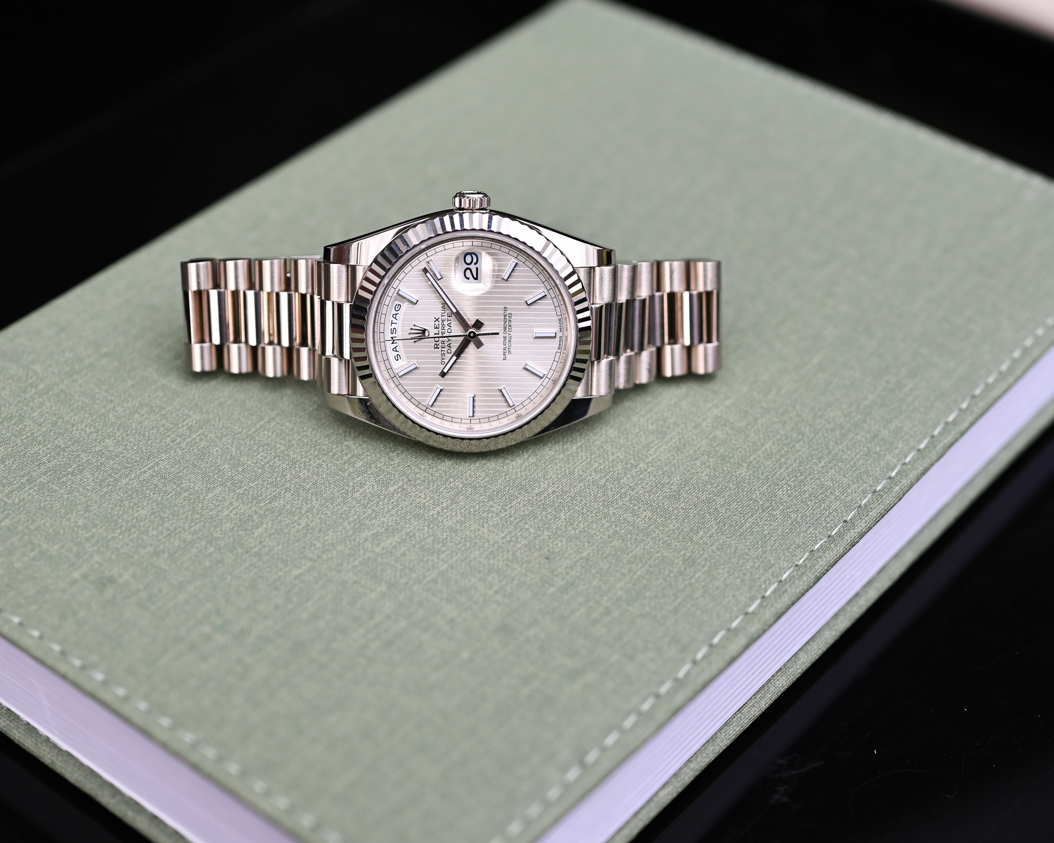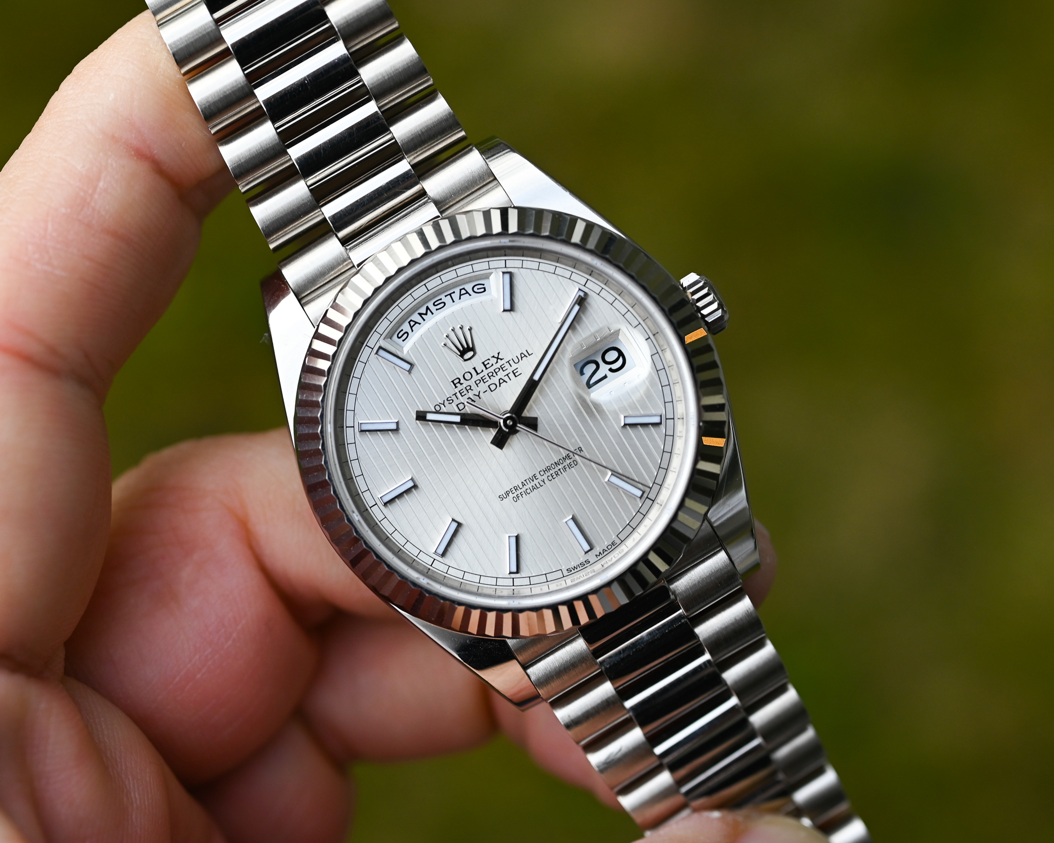 Ein besonderes Highlight dieser Day-Date ist das silberne Tapestry-Zifferblatt. Dieses seltene Blatt wirkt auf den ersten Blick dezent und zurückhaltend, offenbart jedoch bei näherer Betrachtung eine faszinierende Tiefenwirkung. Die vertikale Struktur verleiht dem Zifferblatt eine elegante Spannung und macht die Uhr zu einem subtilen, aber außergewöhnlich raffinierten Blickfang.