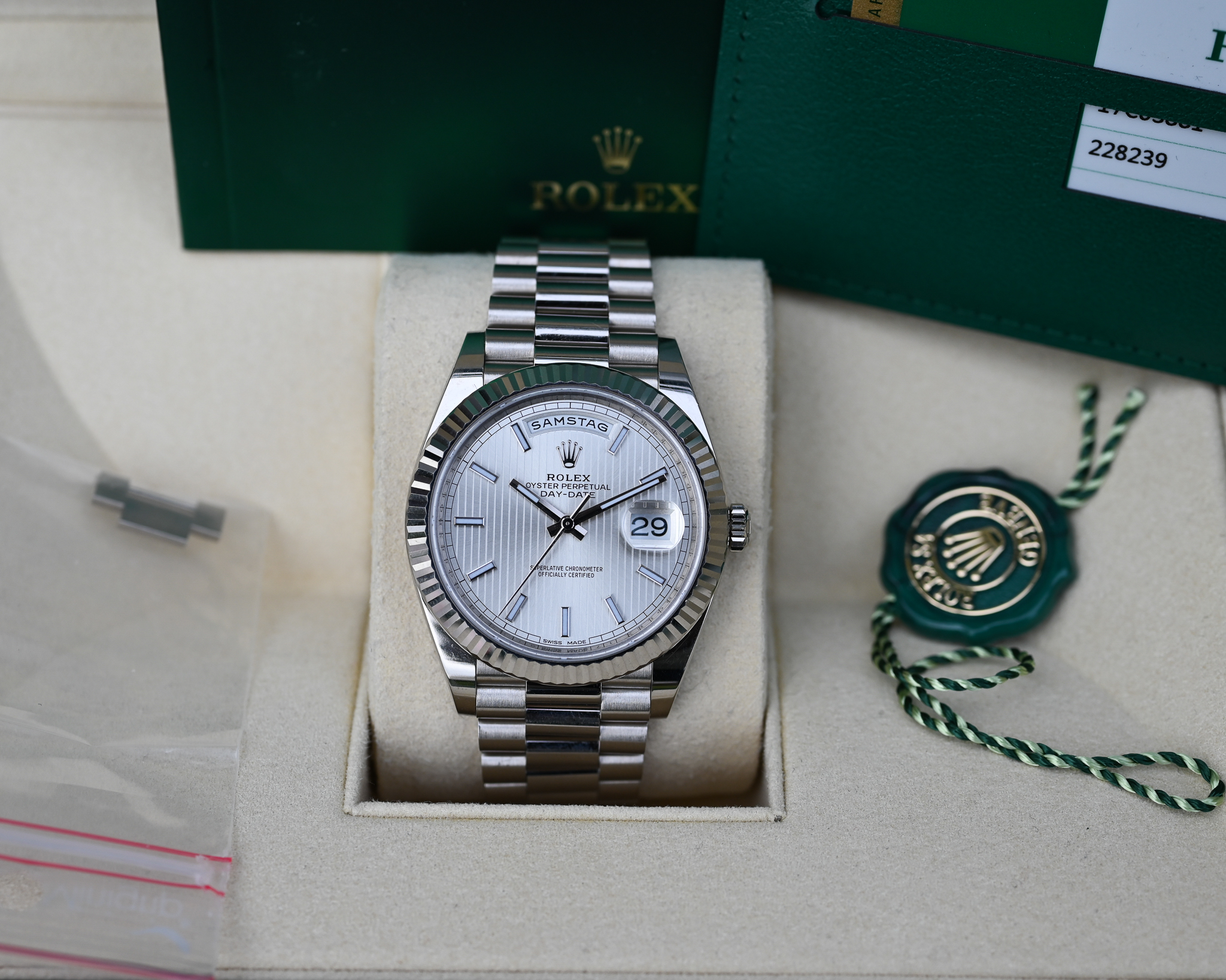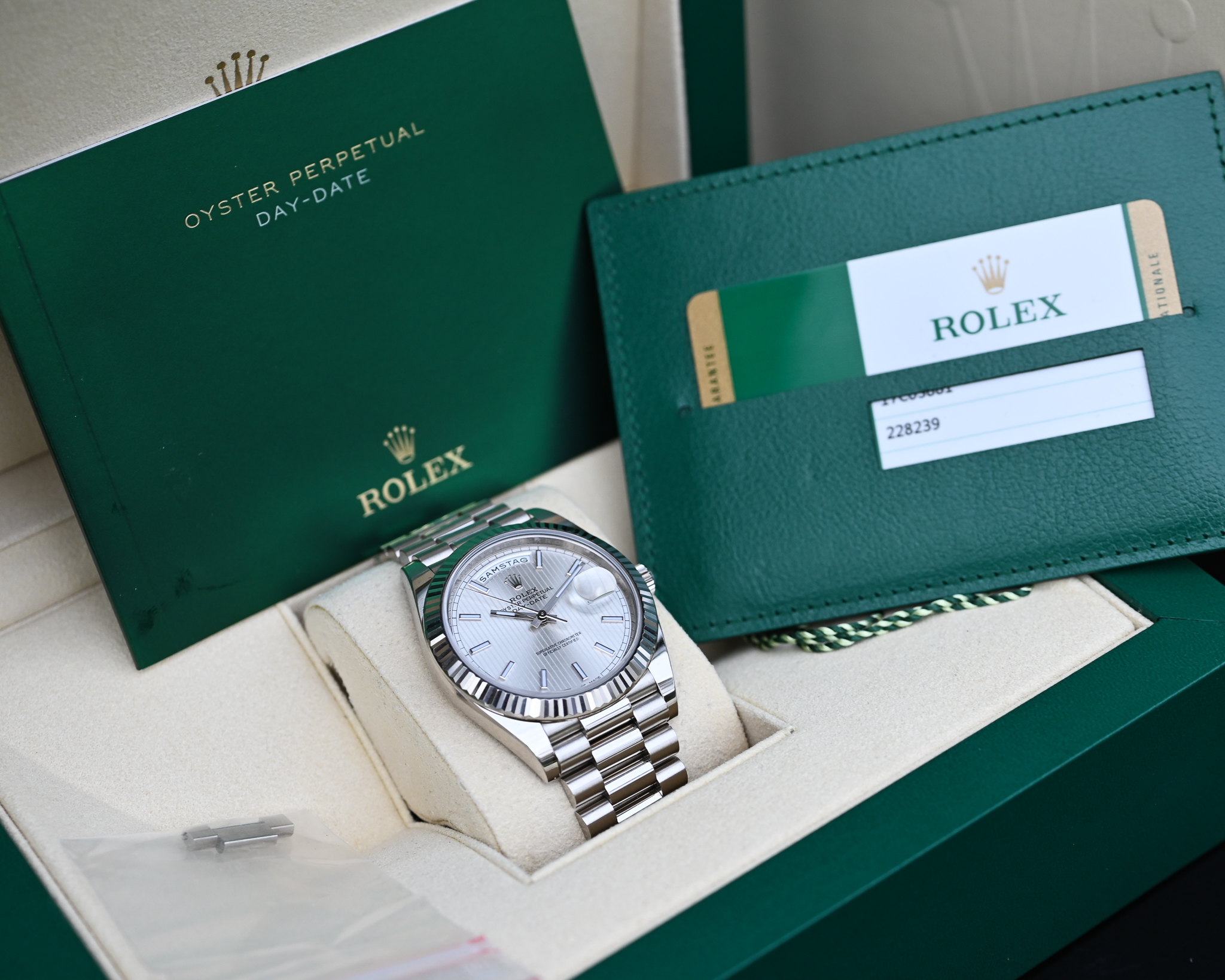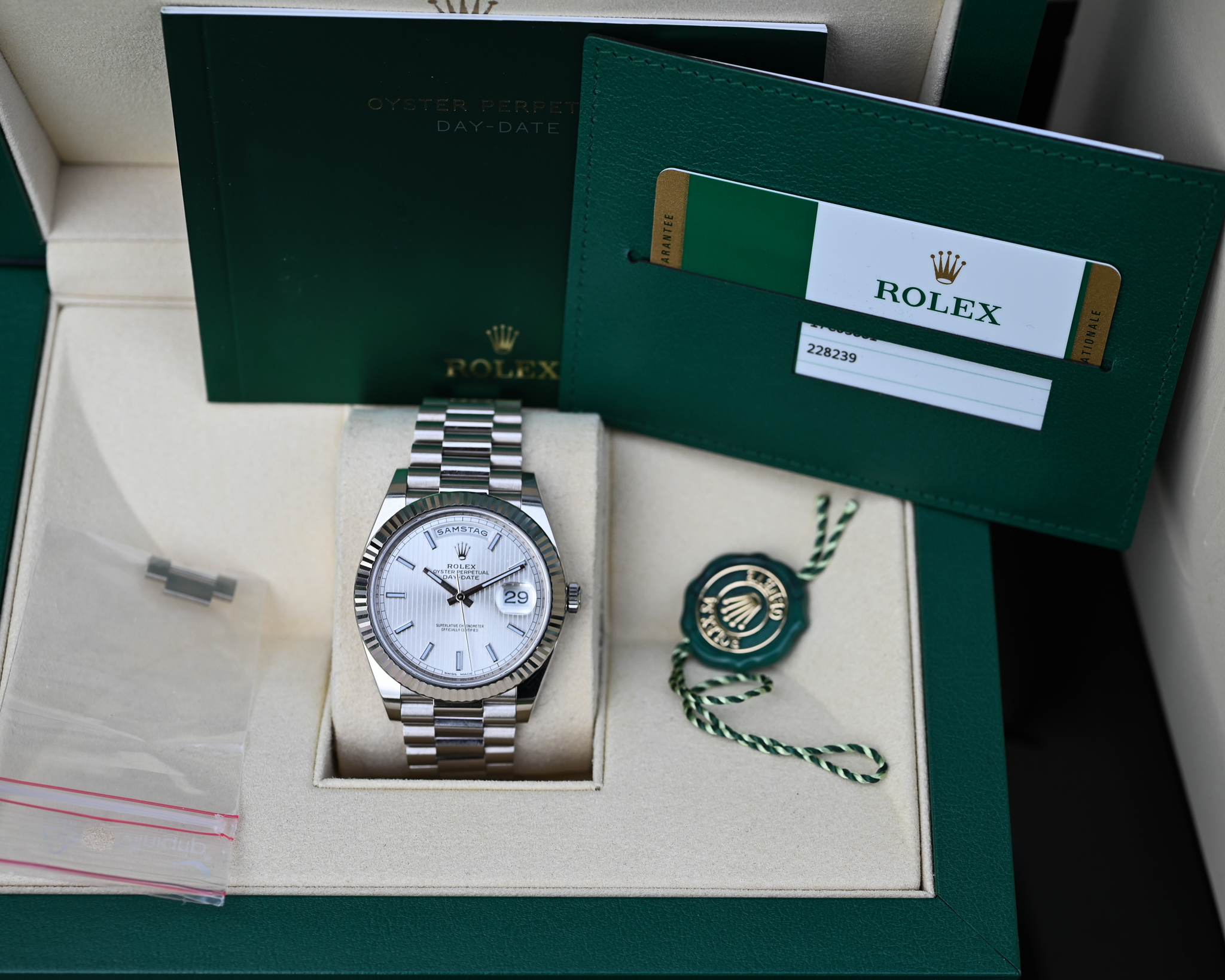Rolex Day-Date 40 – Referenz 228239 | Weißgold | 2020 | Full Set | Silbernes Tapestry-Dial | LC 100