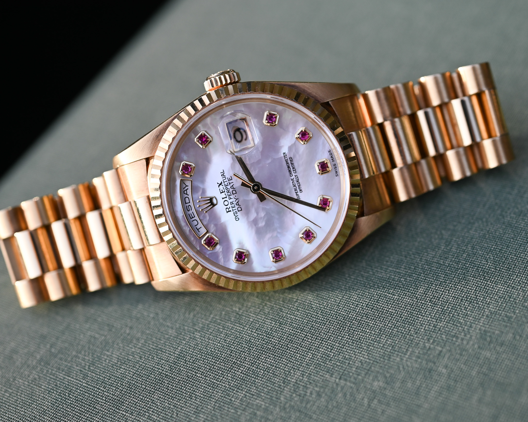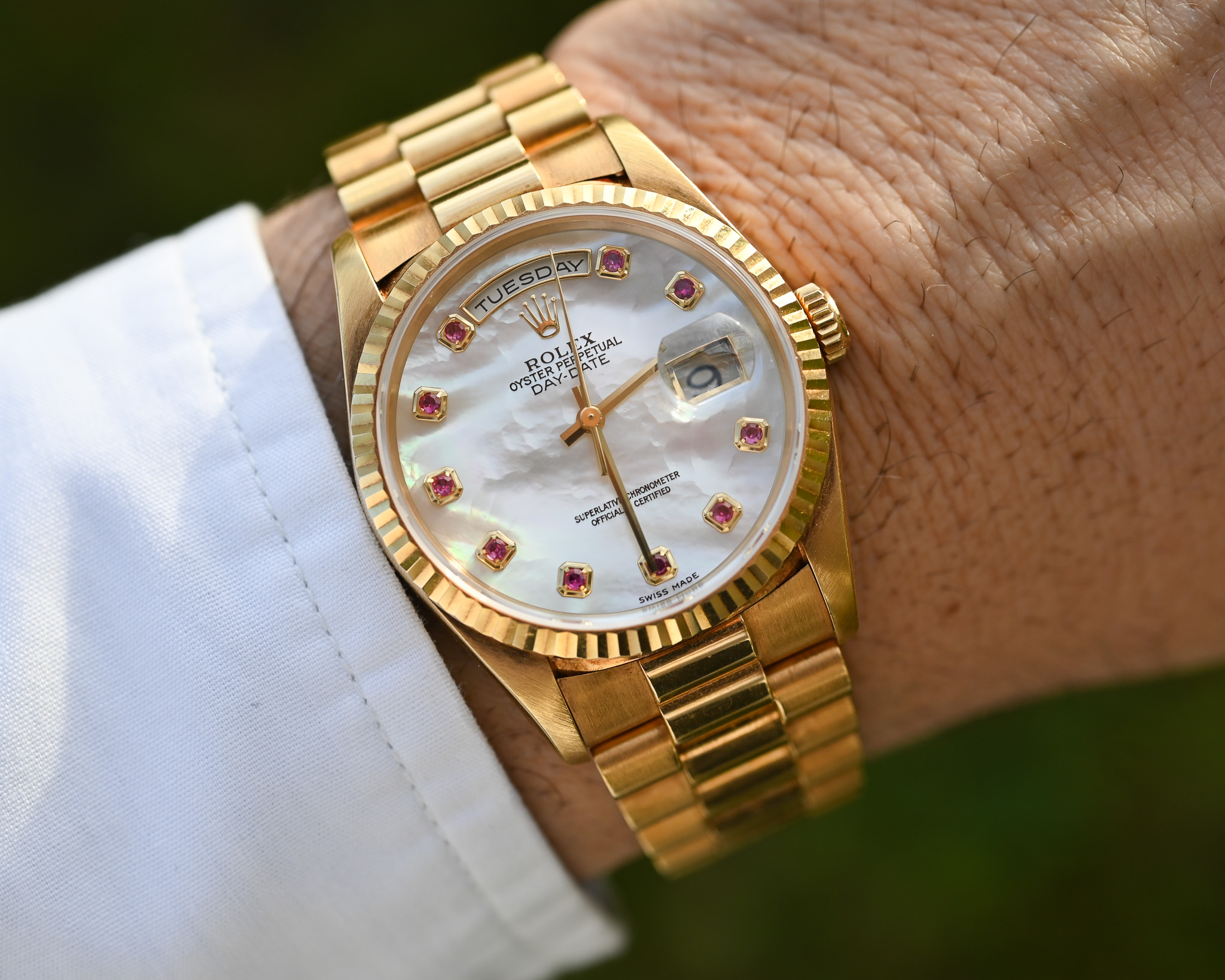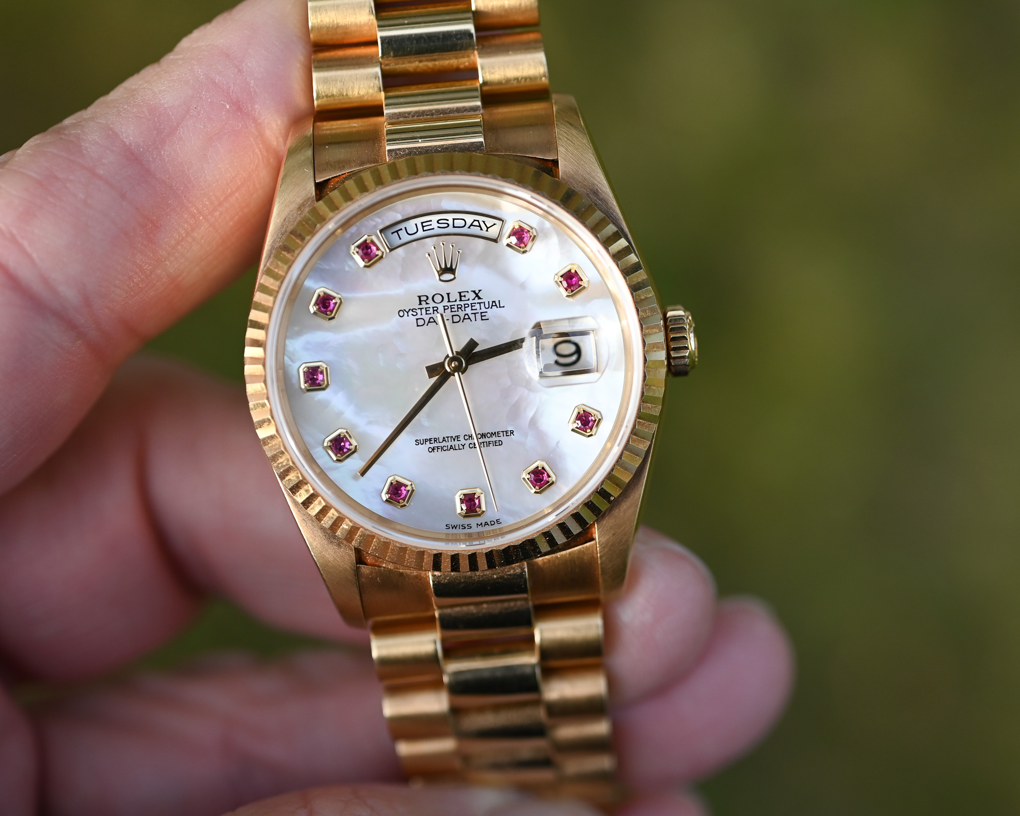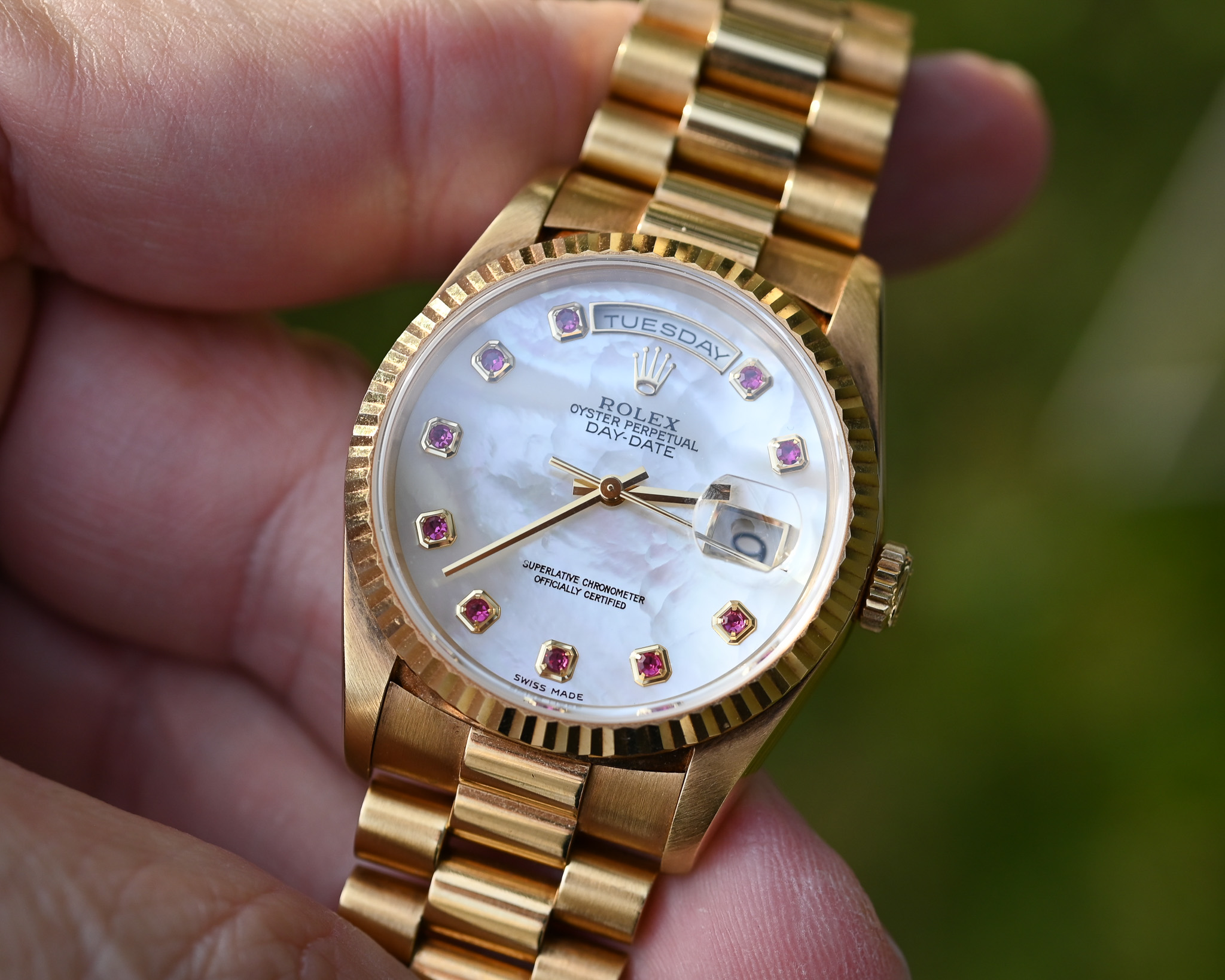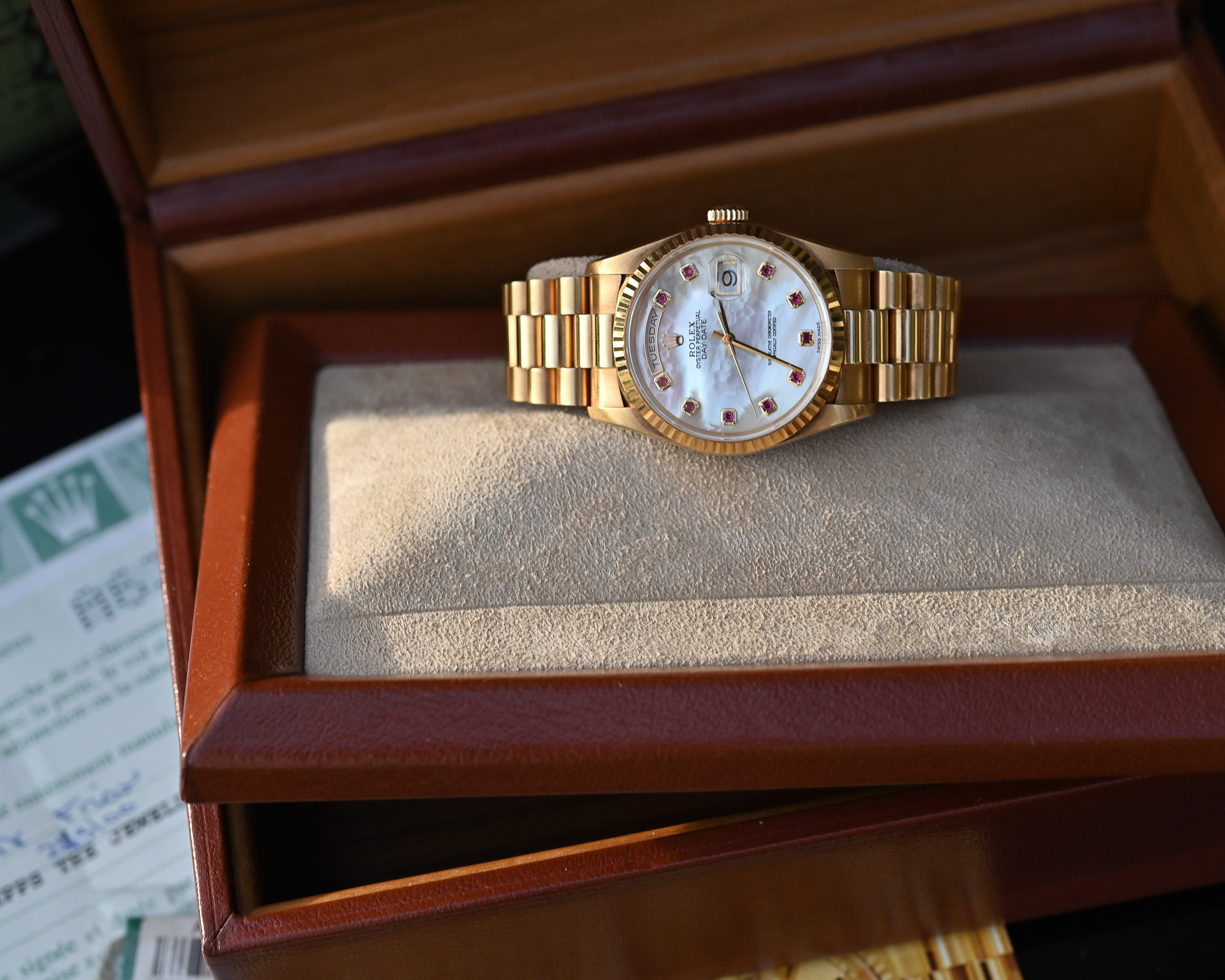Rolex Day-Date Ref. 18238 NGR – „Nacre Gemmes Rubis“ – Mother of Pearl mit Rubinen – Fullset – Neuwertig