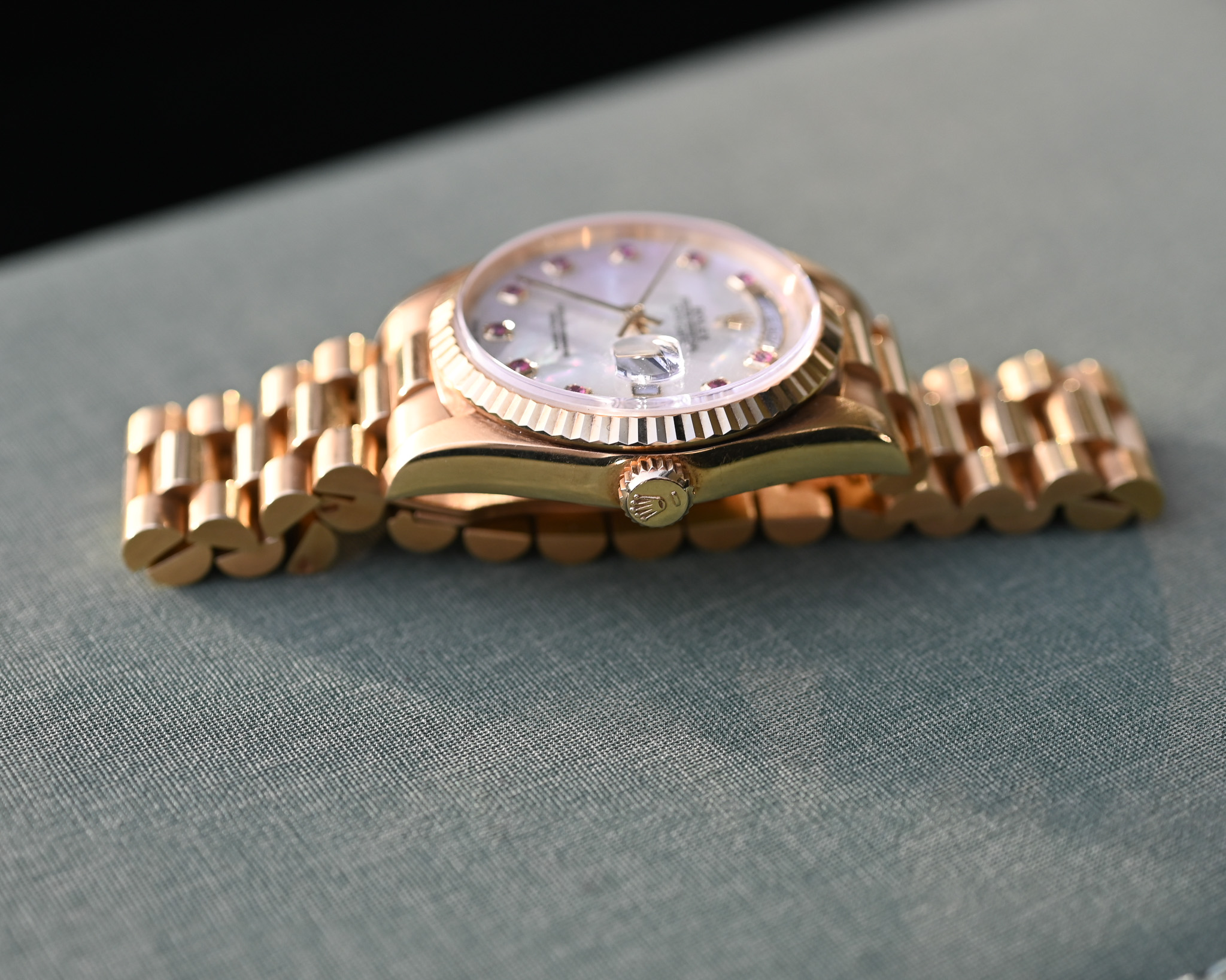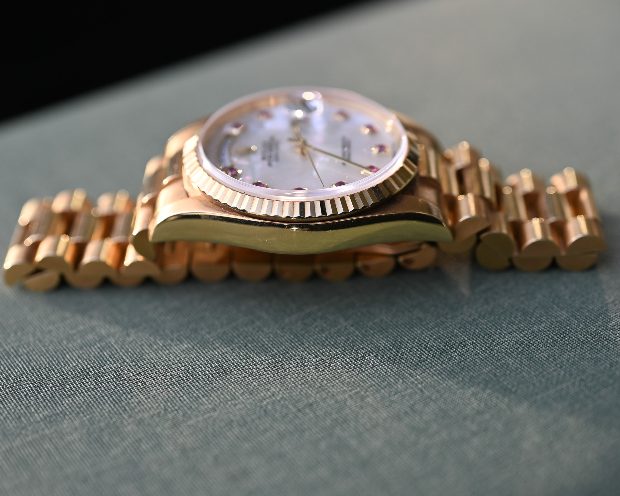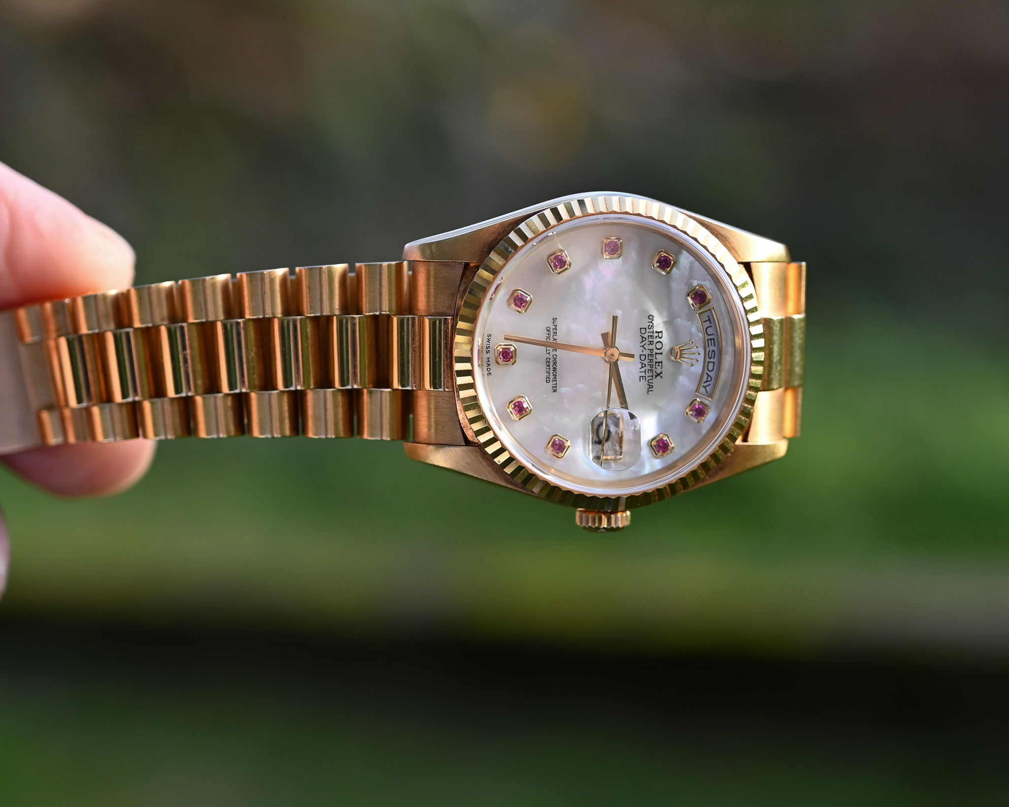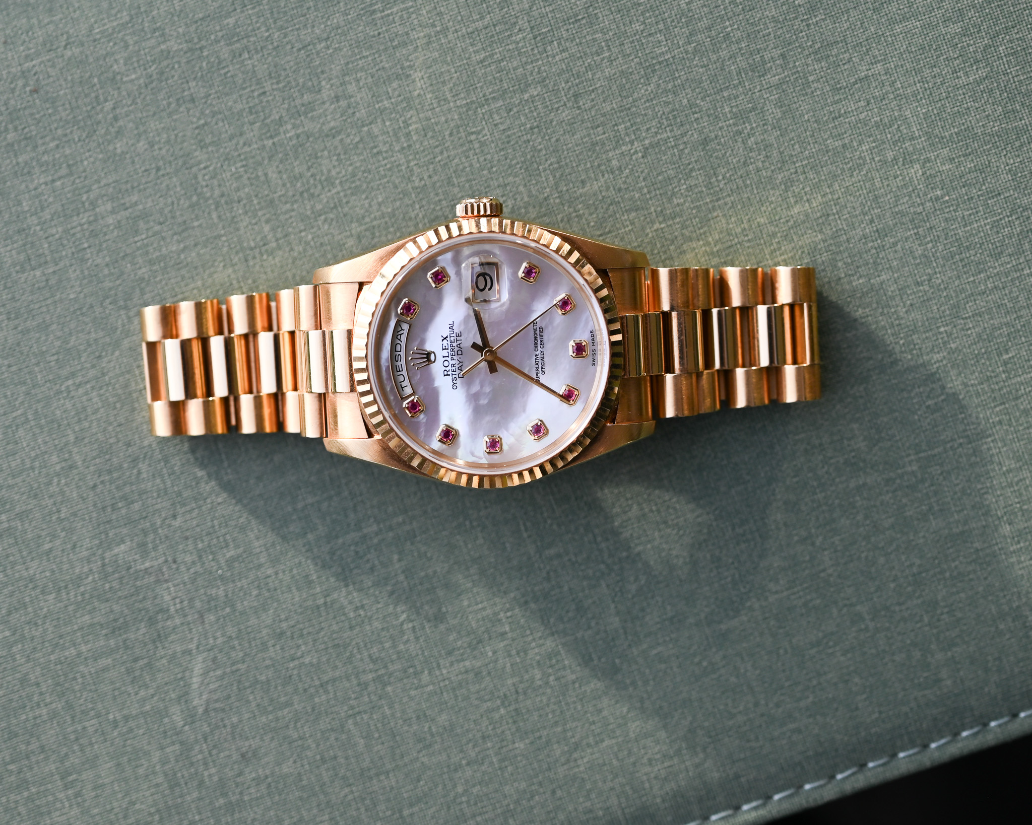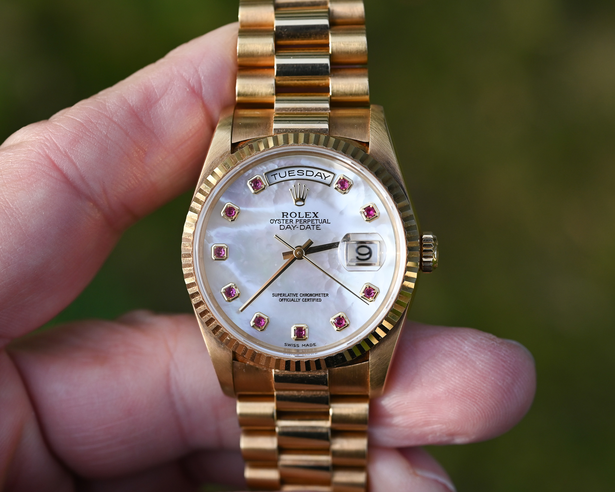 Rolex Day-Date Ref. 18238 NGR – „Nacre Gemmes Rubis“ – Mother of Pearl mit Rubinen – Fullset – Neuwertig