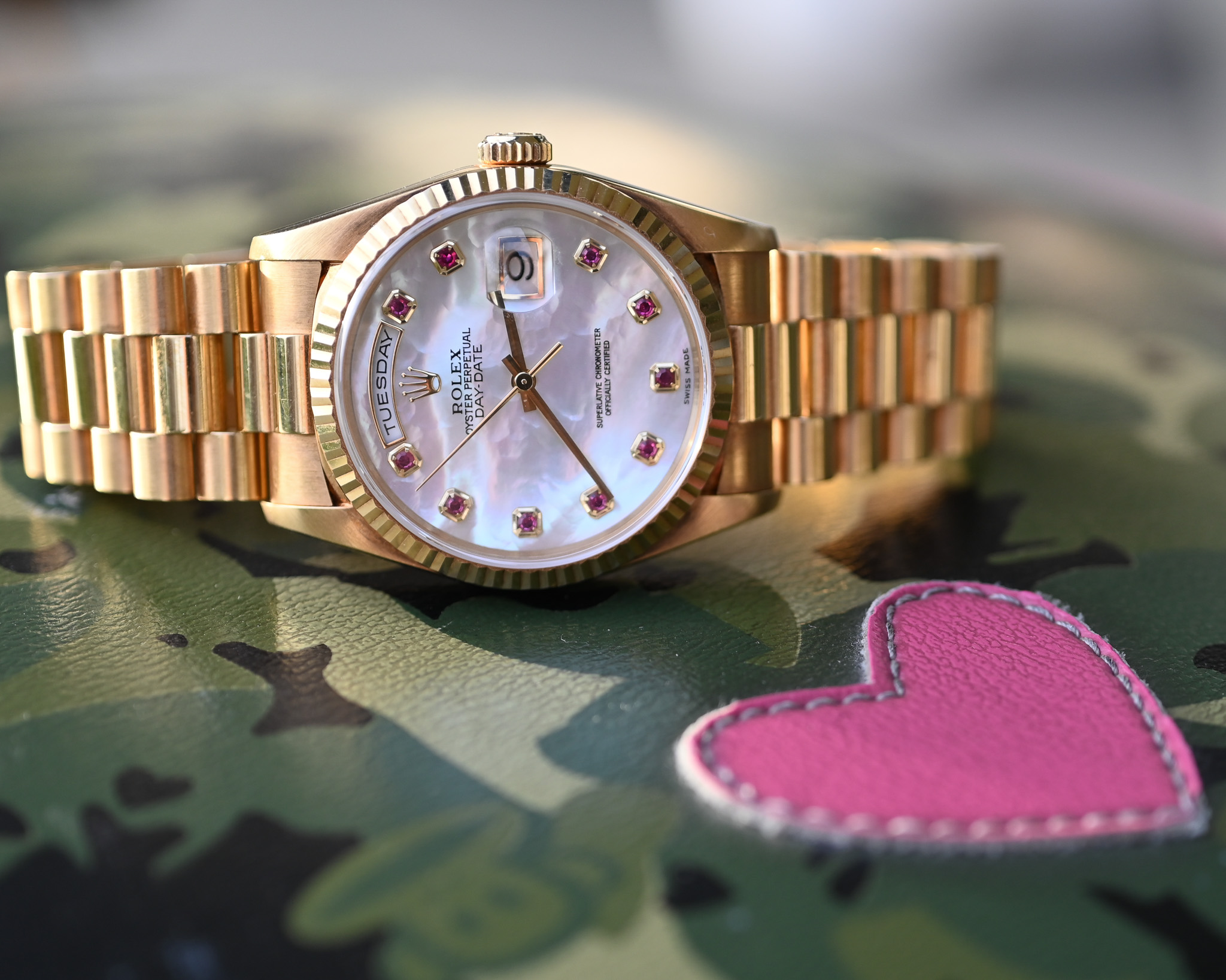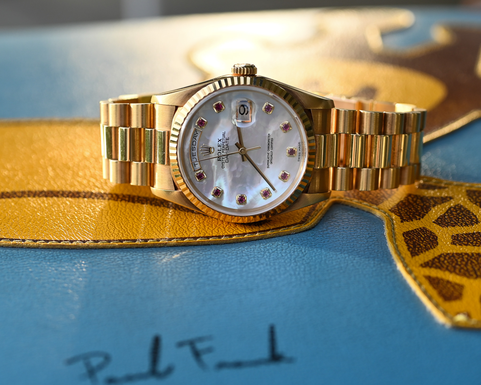 Eine außergewöhnlich seltene und luxuriöse Day-Date, die durch ihr einzigartiges Zifferblatt, ihren neuwertigen Zustand und den vollständigen Lieferumfang begeistert – ein echtes Highlight für anspruchsvolle Sammler und Kenner.