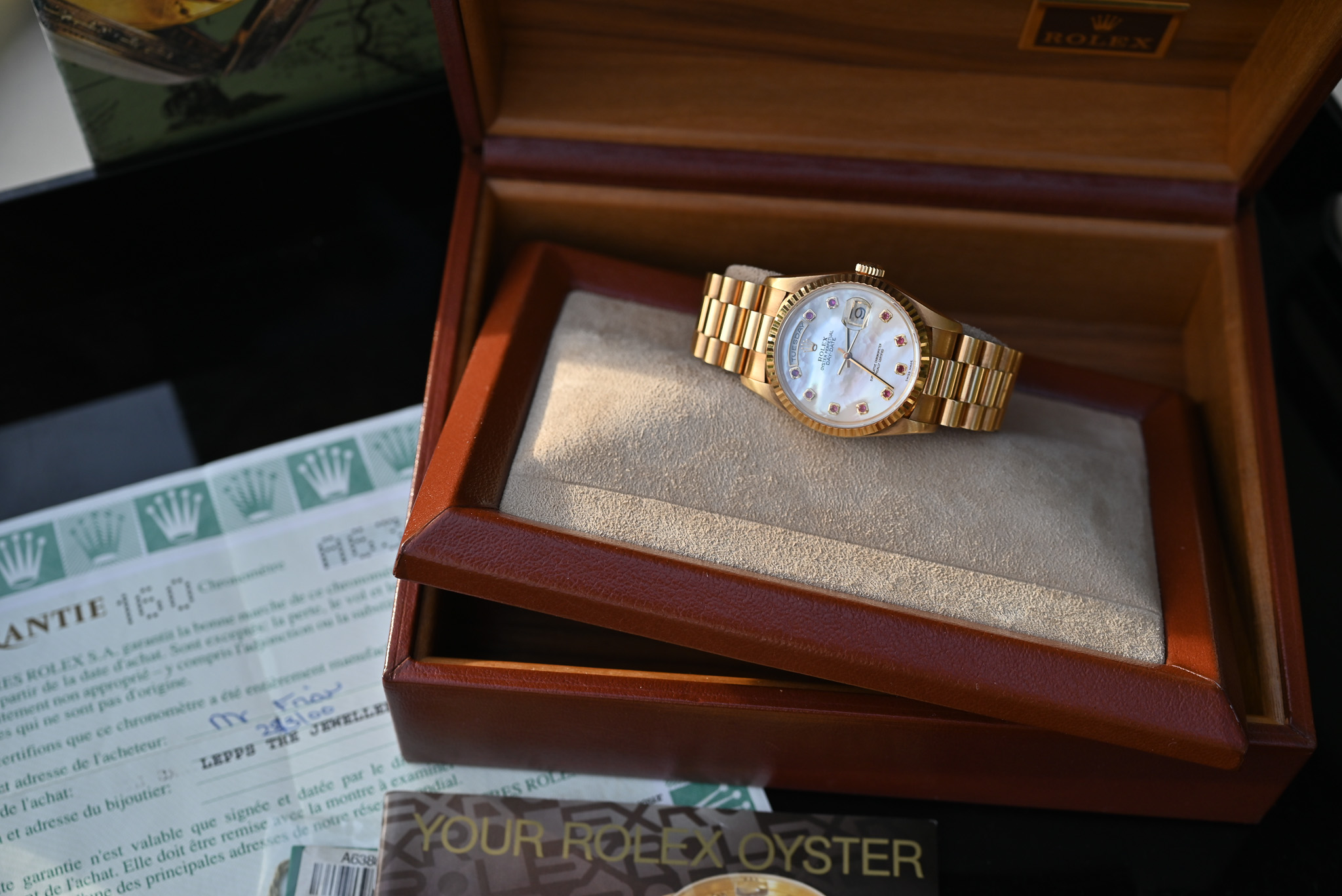 Selbstverständlich wird diese besondere Day-Date im Fullset mit Box und Papieren ausgeliefert – ein weiterer Pluspunkt für Sammler und Liebhaber außergewöhnlicher Rolex-Modelle.