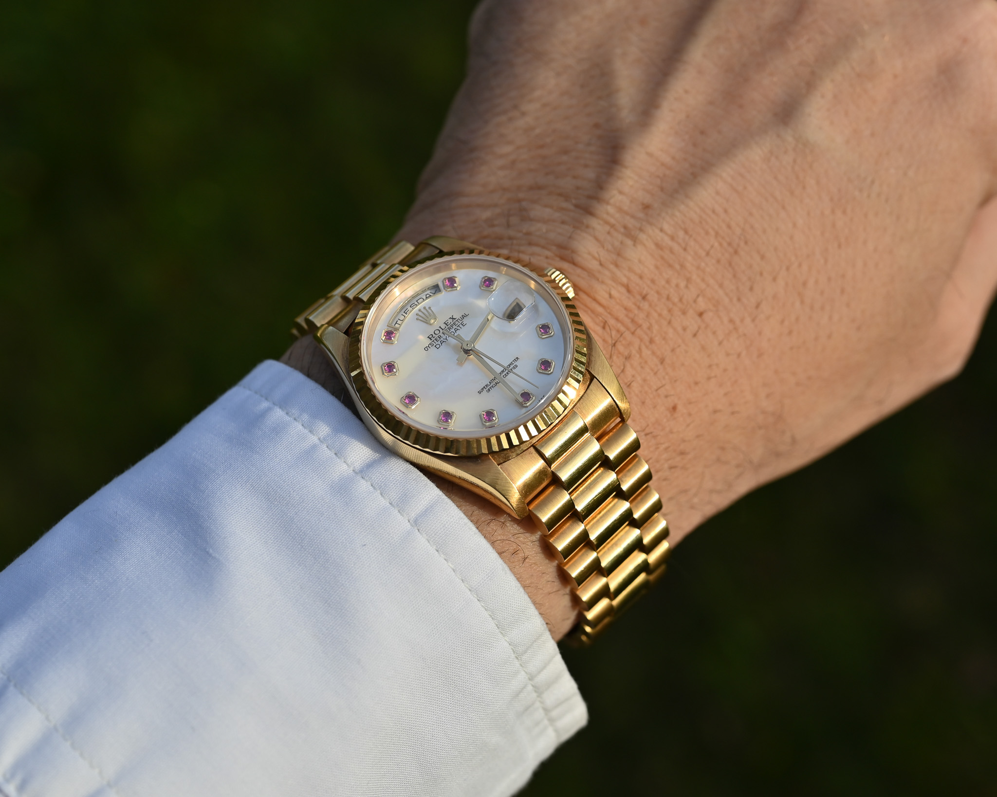 Zum Verkauf steht eine außergewöhnlich luxuriöse und äußerst seltene Rolex Day-Date Referenz 18238 NGR. Die Bezeichnung **NGR („Nacre Gemmes Rubis“) **steht für ein edles Mother-of-Pearl-Zifferblatt aus Muschel, veredelt mit hochwertigen Rubinen – eine der exklusivsten und beeindruckendsten Zifferblattvarianten, die Rolex je für die Day-Date gefertigt hat.