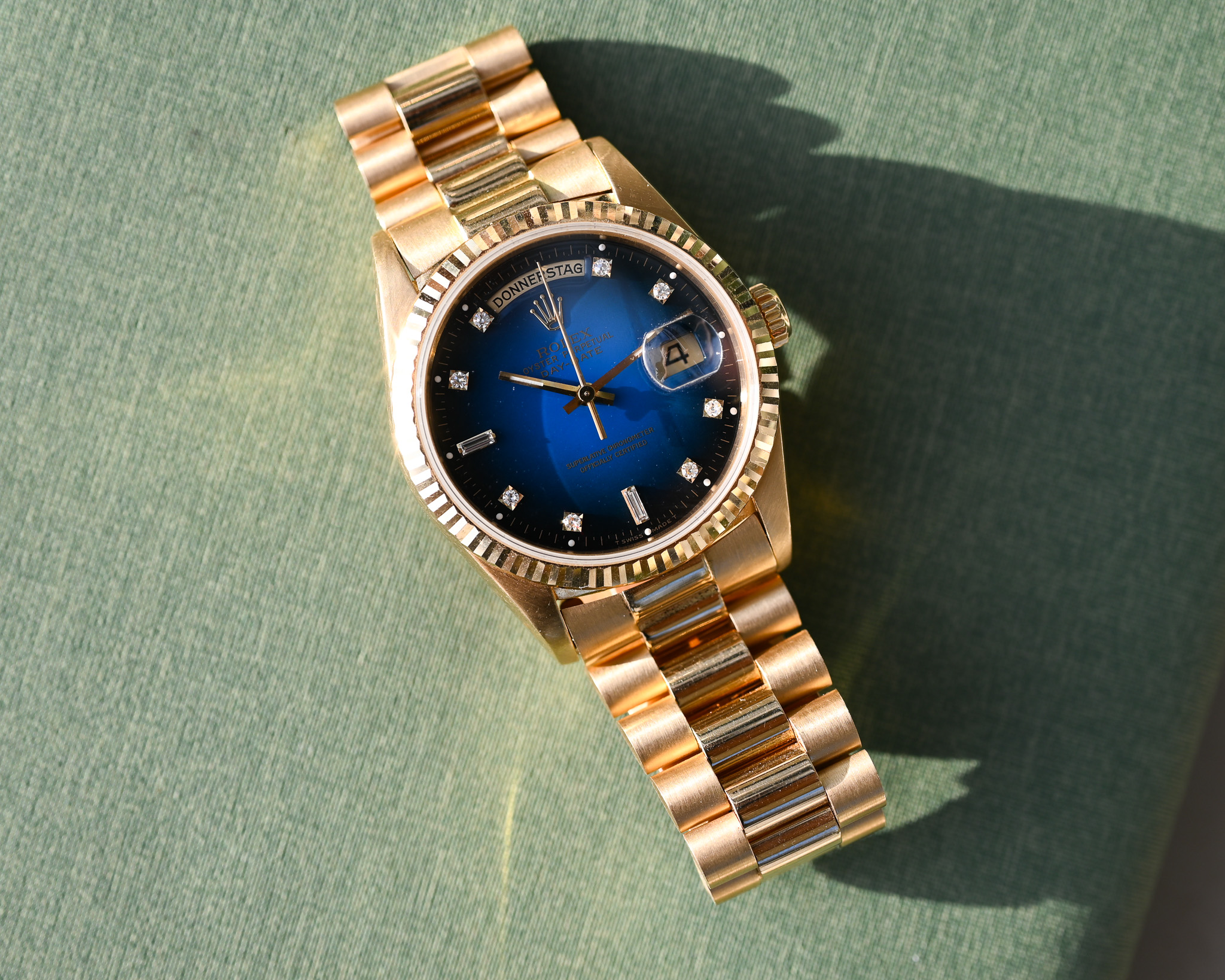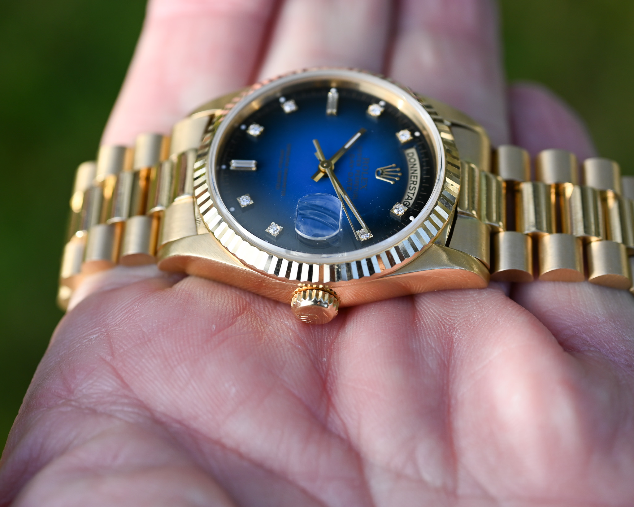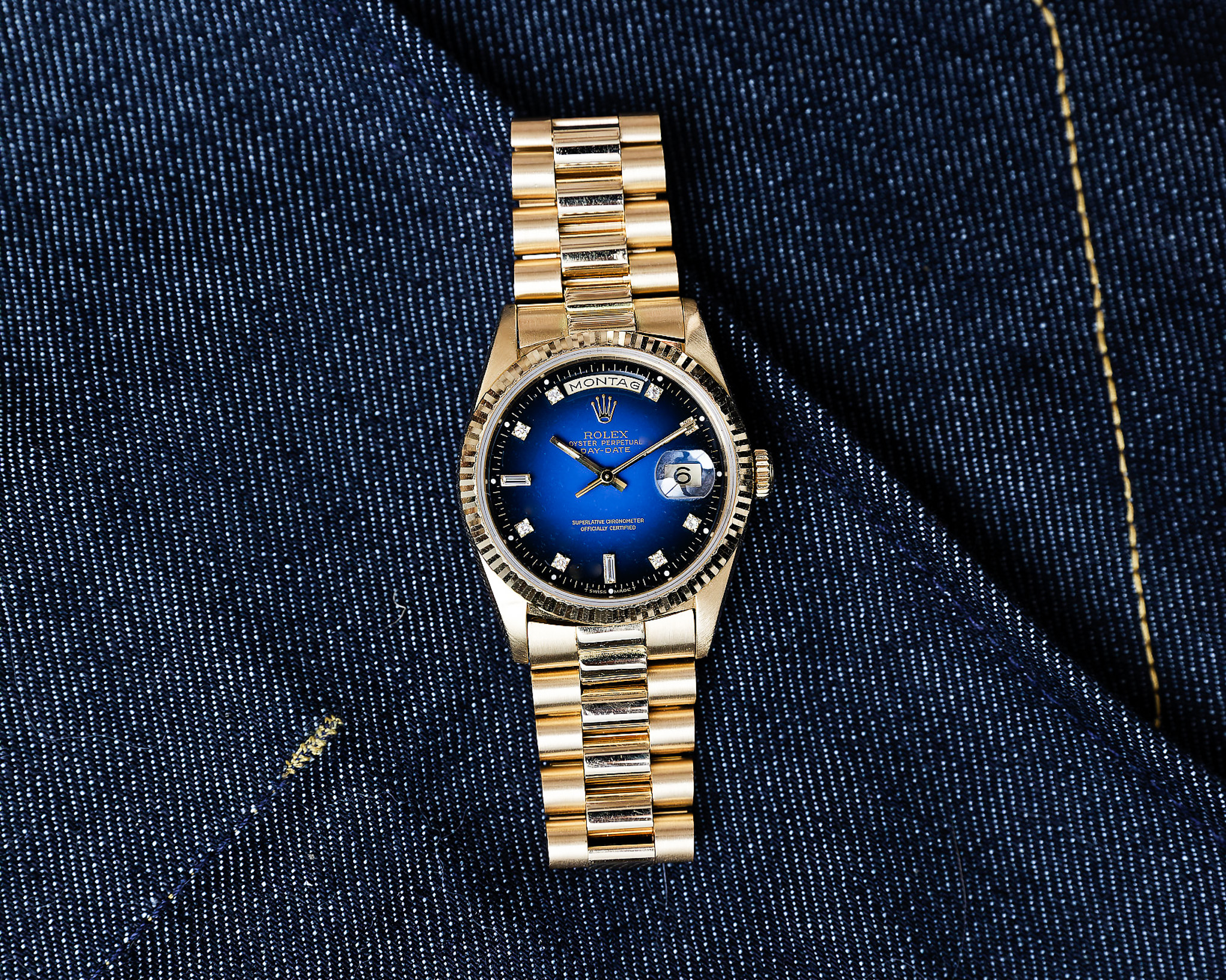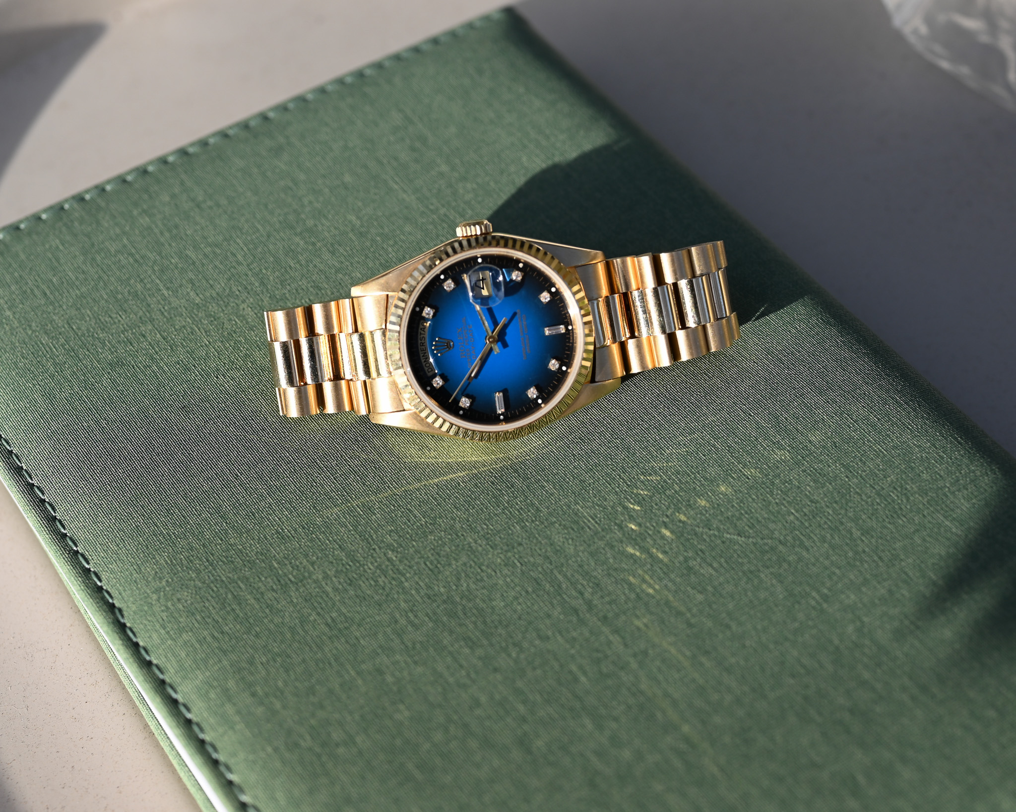 Das Highlight dieser Day-Date ist das blaue Vignette Diamond Dial. Der wunderschöne Blauverlauf, der von einem helleren, lebendigen Blau in der Mitte sanft zu einem deutlich dunkleren Rand übergeht, verleiht dem Zifferblatt eine außergewöhnliche Tiefe und Dynamik. Die Lacktextur erinnert dabei stark an die beliebten Stella- Zifferblätter.