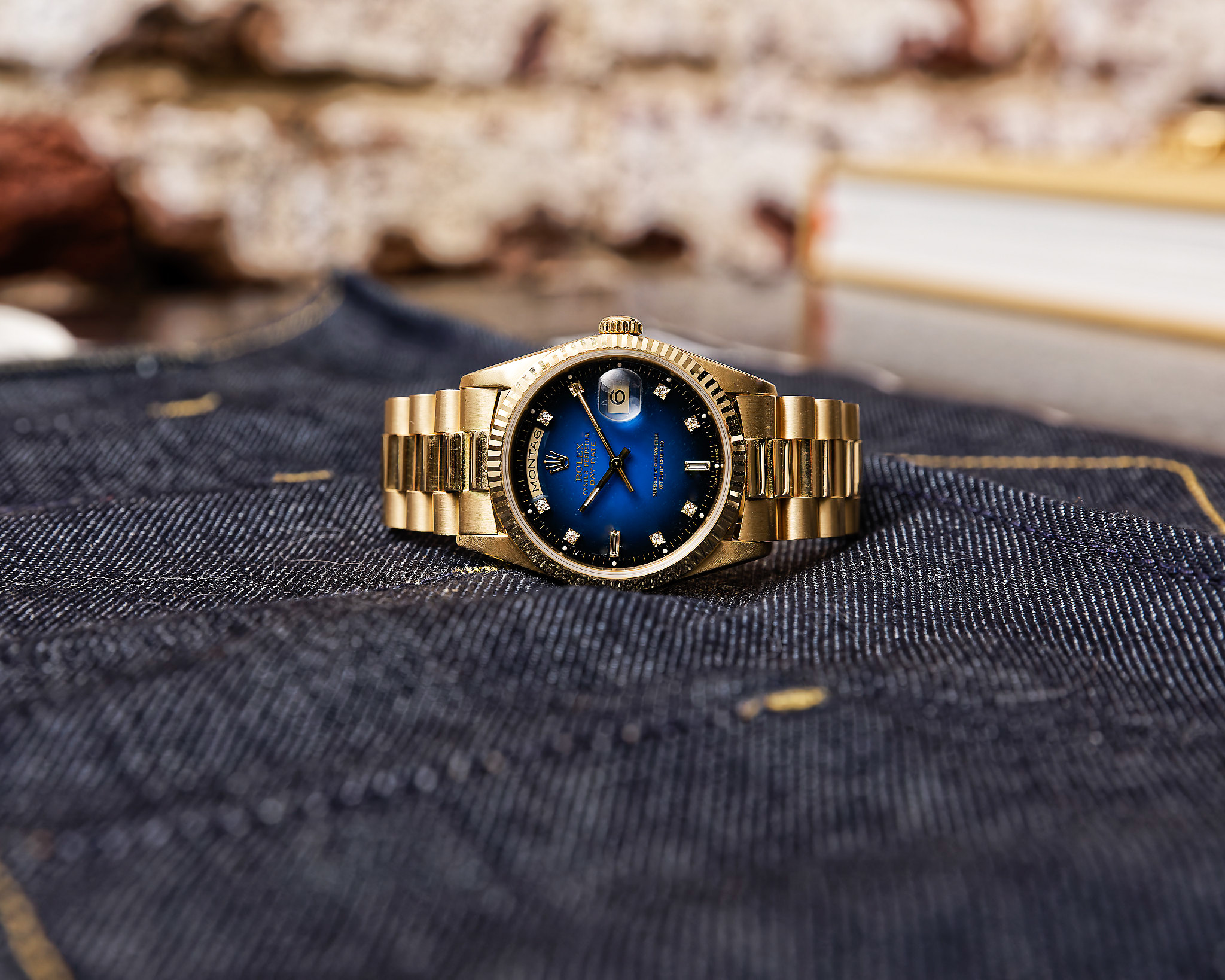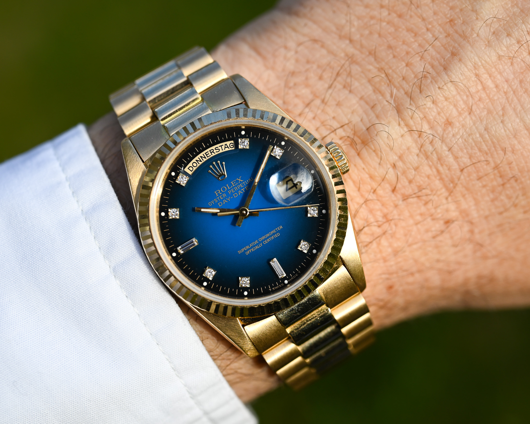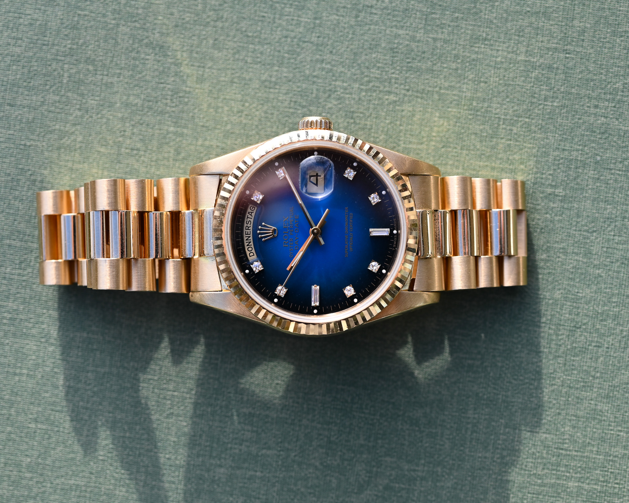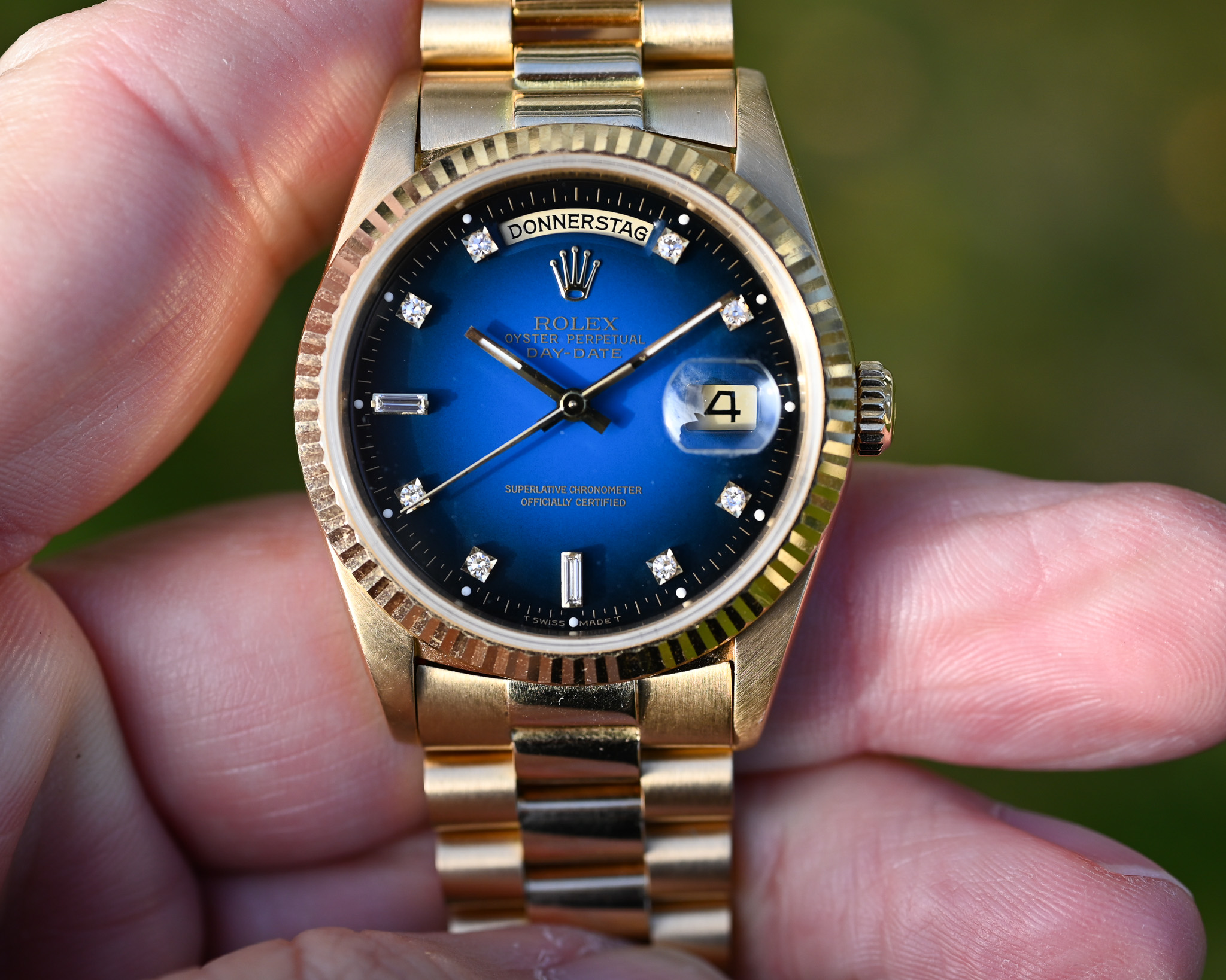 Das Highlight dieser Day-Date ist das blaue Vignette Diamond Dial. Der wunderschöne Blauverlauf, der von einem helleren, lebendigen Blau in der Mitte sanft zu einem deutlich dunkleren Rand übergeht, verleiht dem Zifferblatt eine außergewöhnliche Tiefe und Dynamik. Die Lacktextur erinnert dabei stark an die beliebten Stella- Zifferblätter.