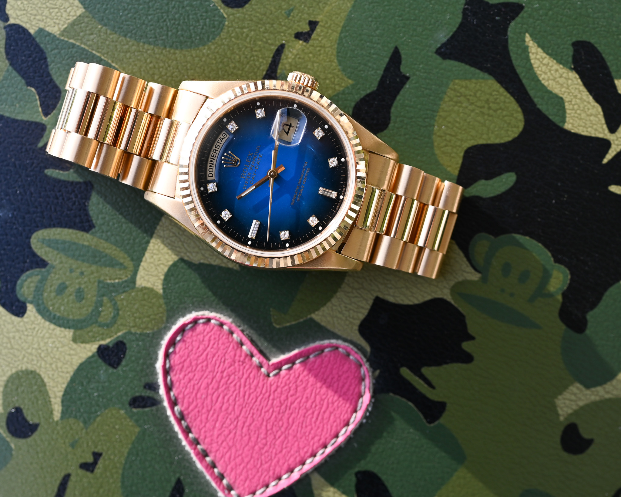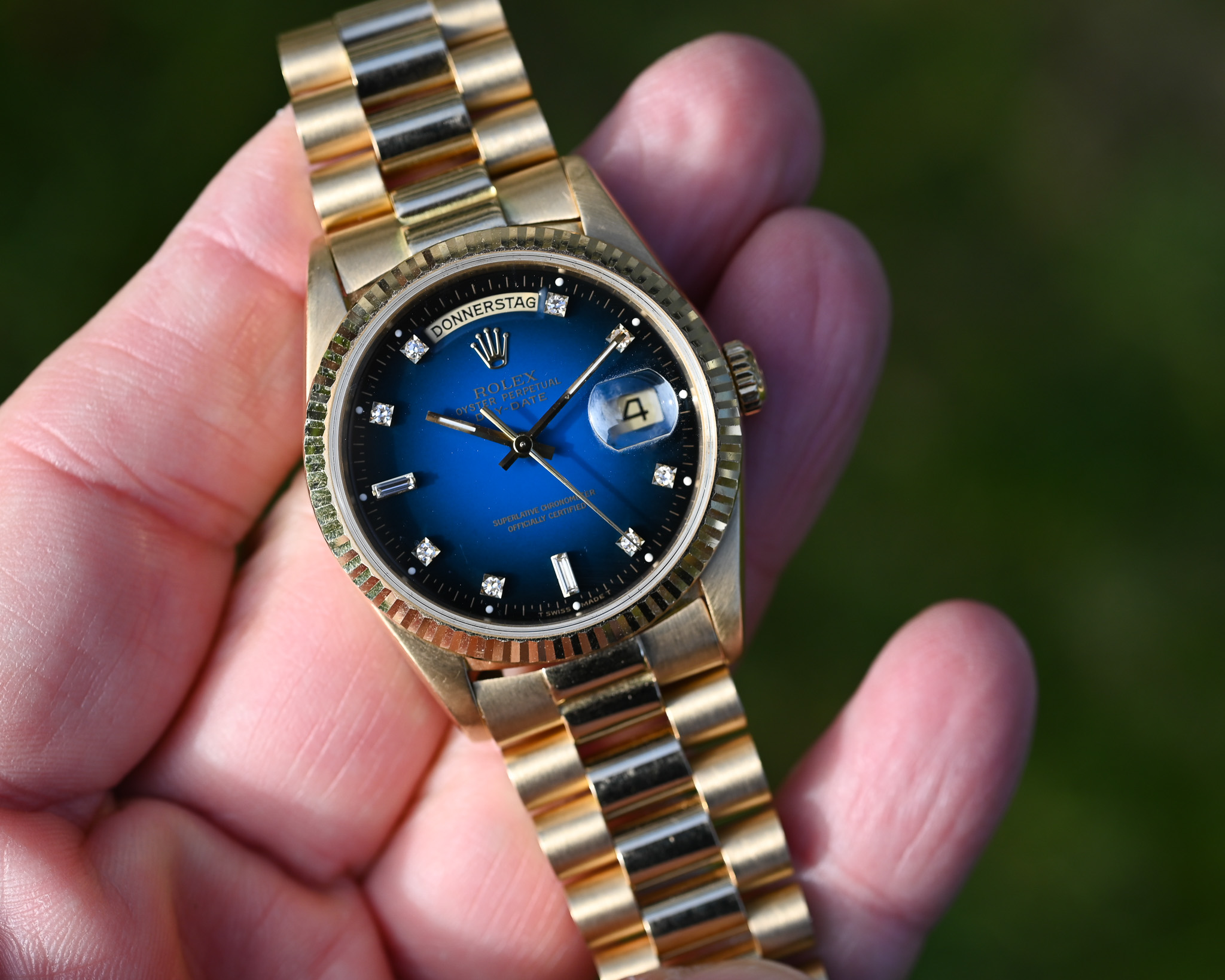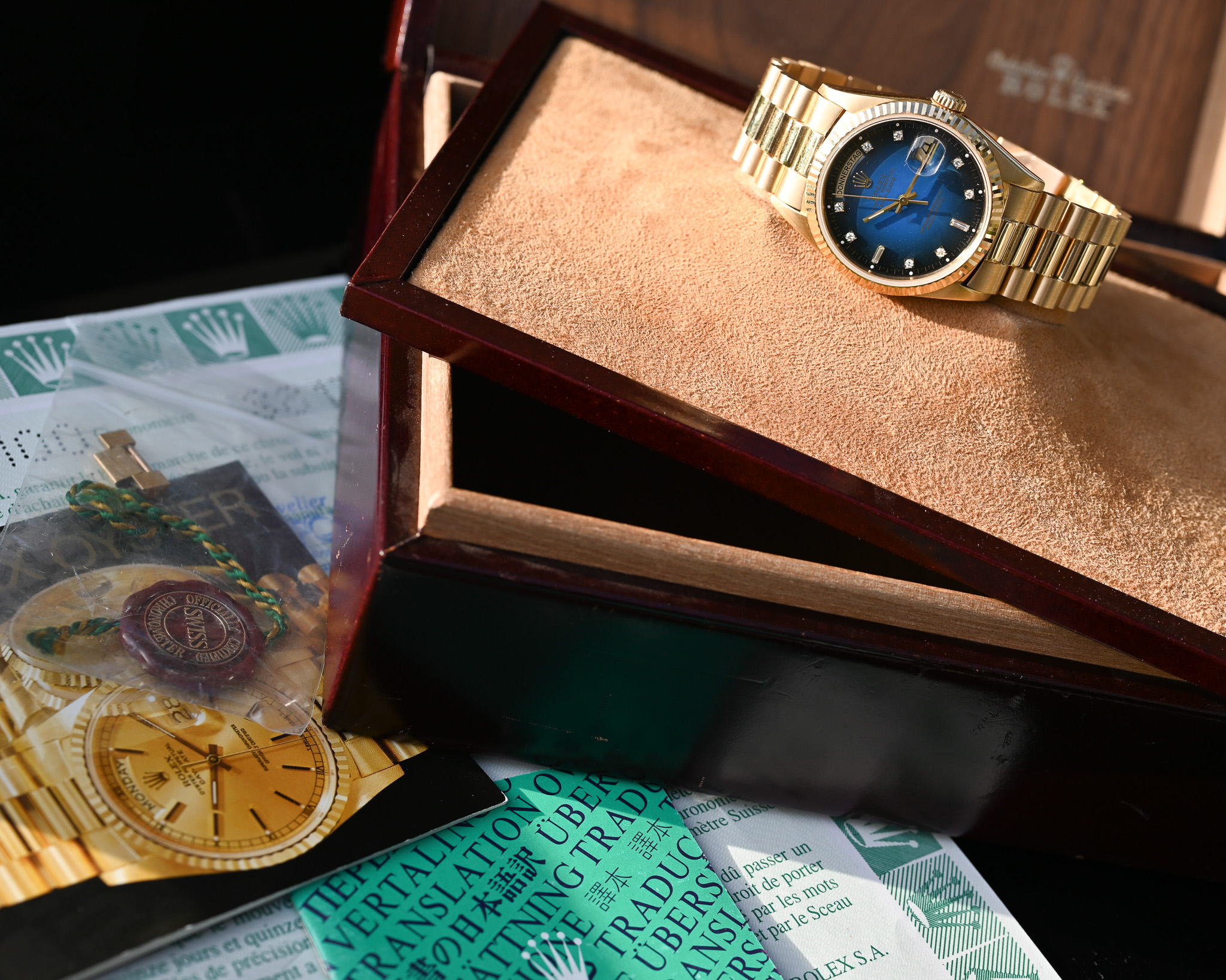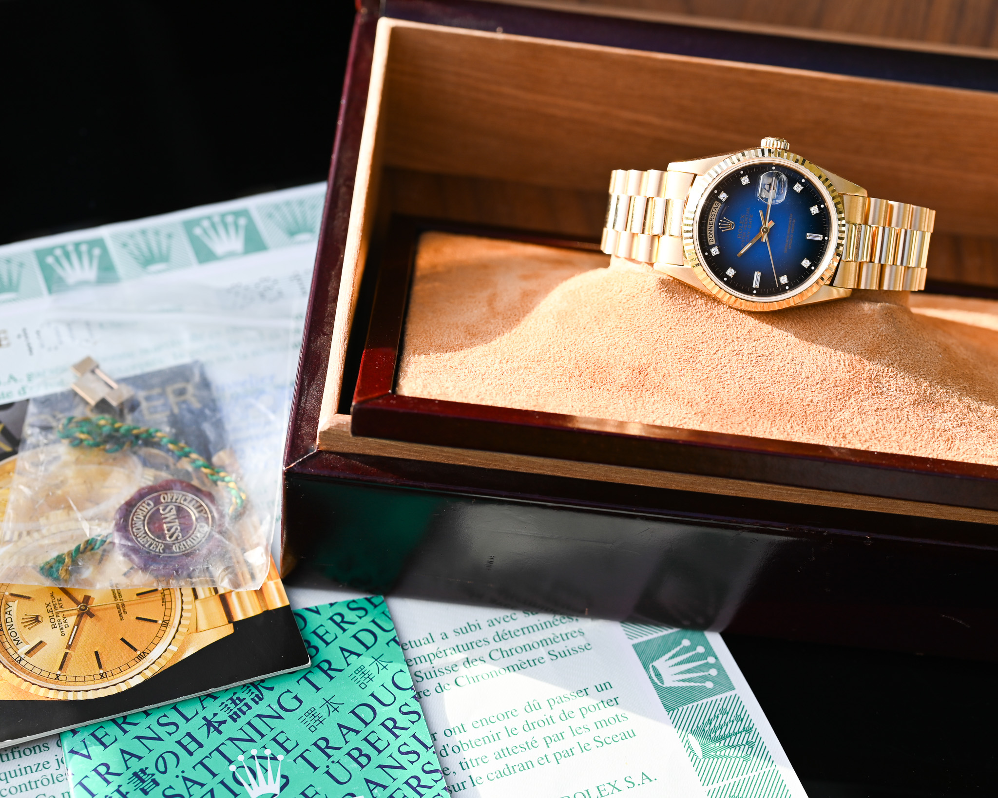 Eine außergewöhnliche Day-Date mit faszinierendem Farbverlauf, perfektem Zustand und vollständigem Lieferumfang – ideal für Sammler und Kenner, die eine besondere und seltene Zifferblattvariante suchen.