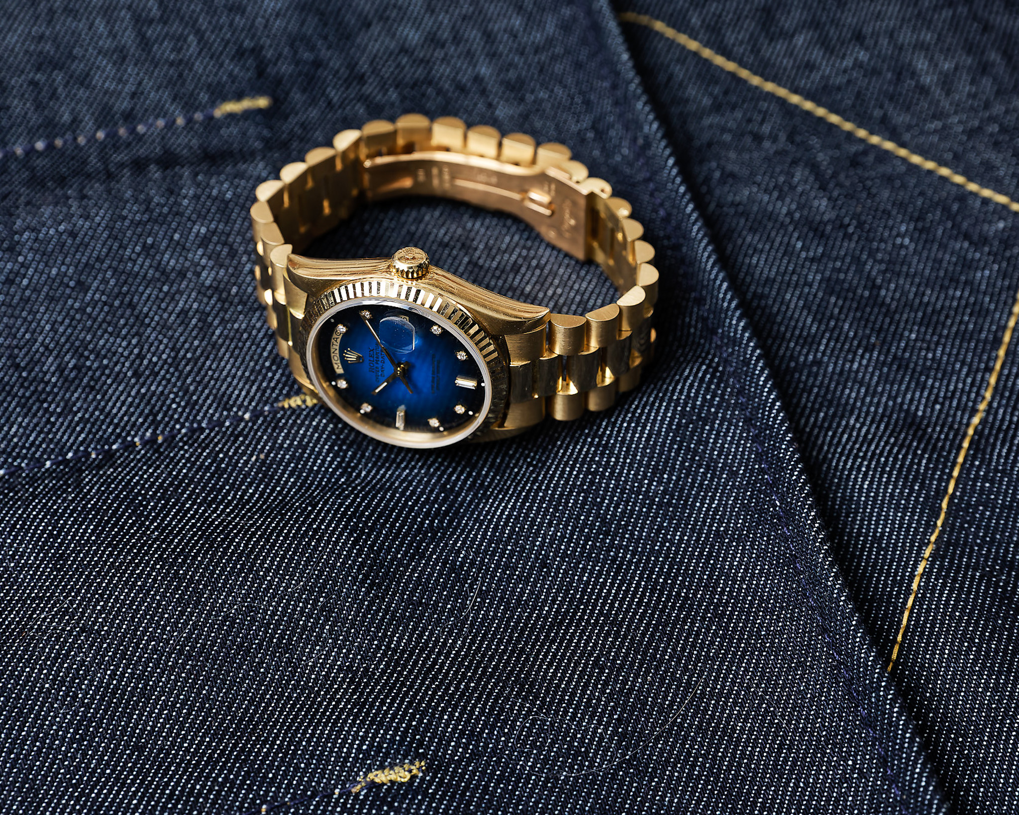 Zum Verkauf steht eine besonders elegante und ausdrucksstarke Rolex Day-Date Referenz 18238, die durch ihr außergewöhnliches blaues Vignette Diamond Zifferblatt und ihren makellosen Gesamtzustand begeistert.