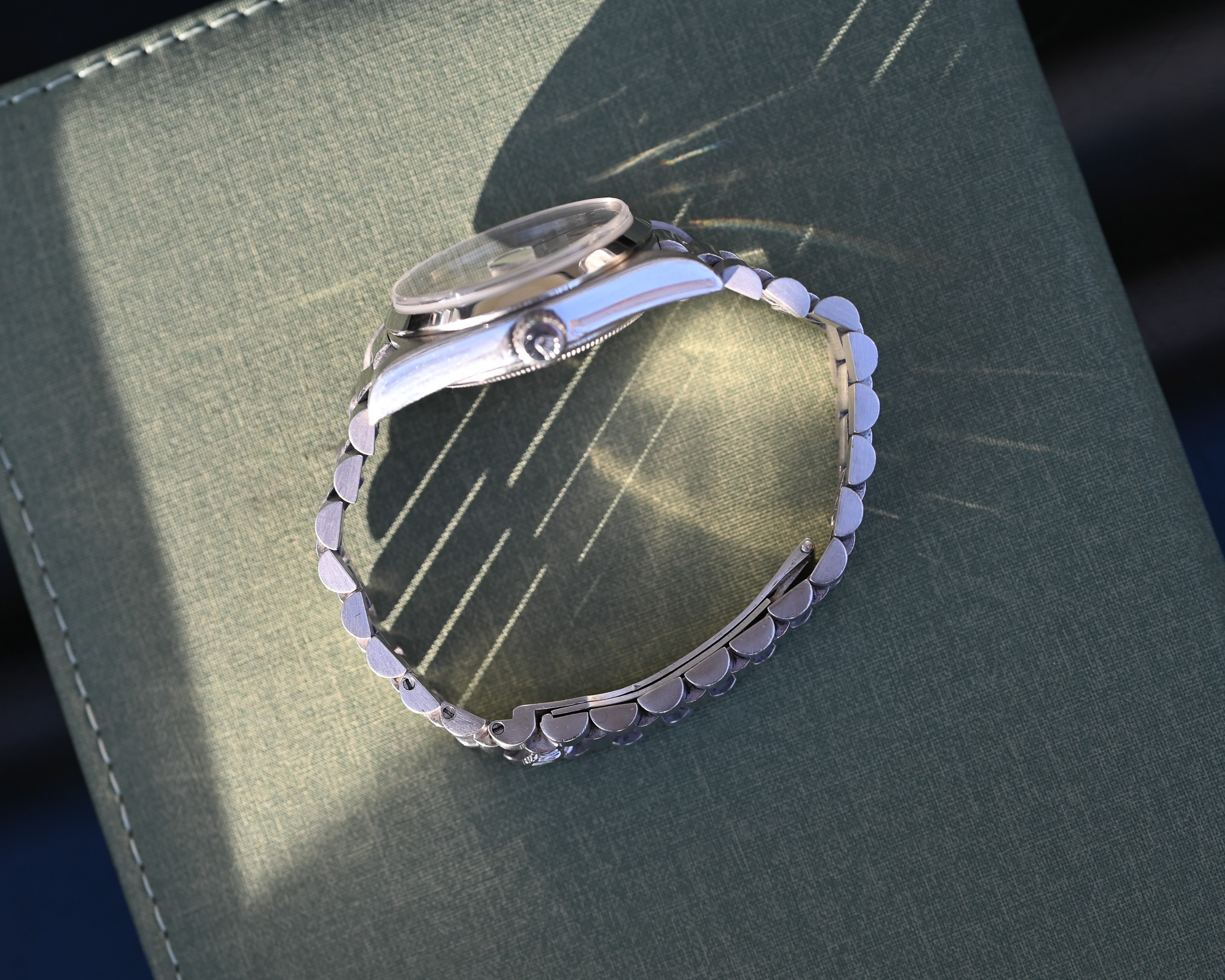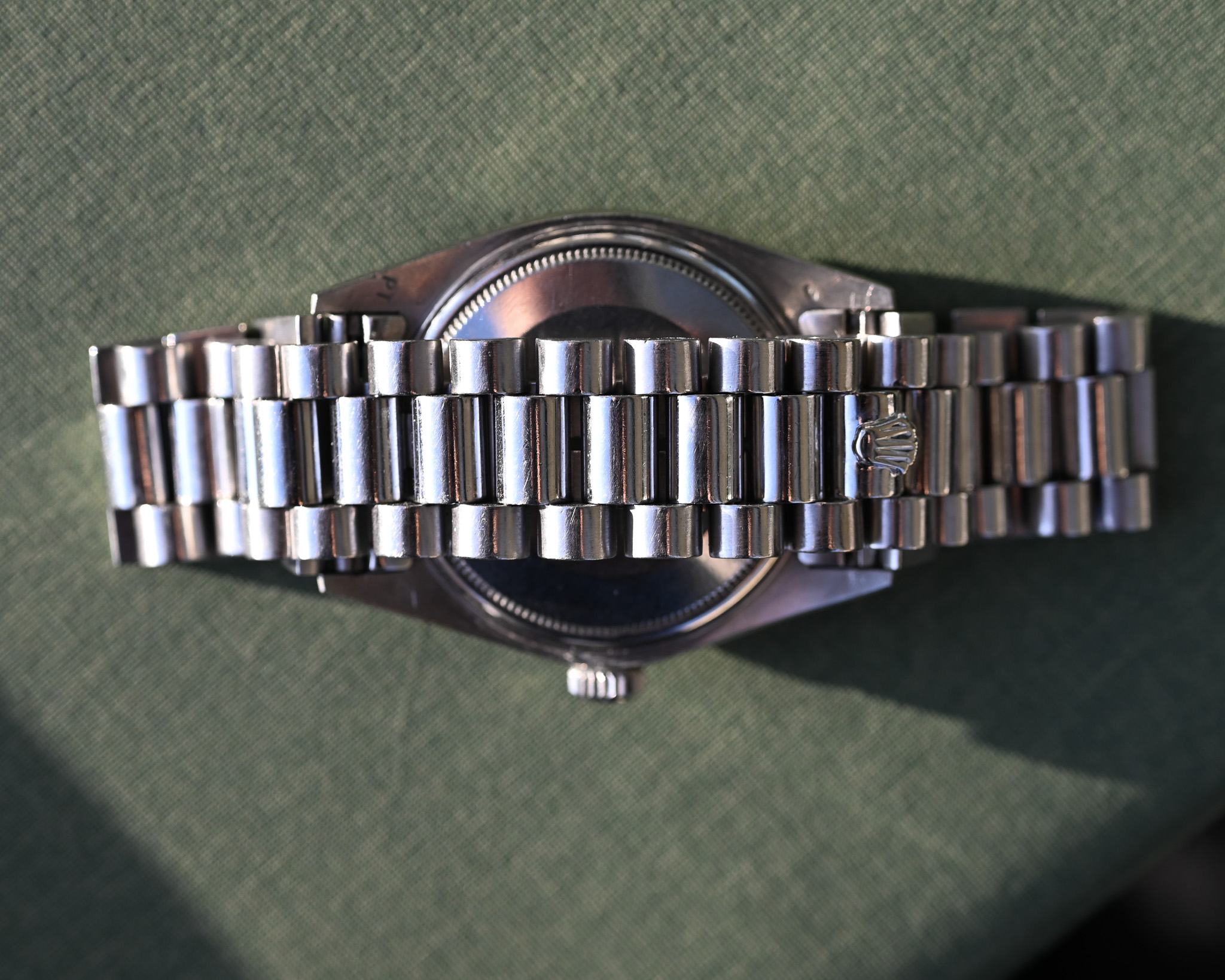 Die Uhr befindet sich in sehr gutem Gesamtzustand und überzeugt durch ihre hochwertige, massive Anmutung, für die die Platin-Day-Date bekannt ist. Das President-Band zeigt lediglich geringen Spannungsverlust und präsentiert sich insgesamt sehr gepflegt – ein klares Zeichen für einen schonenden Umgang.