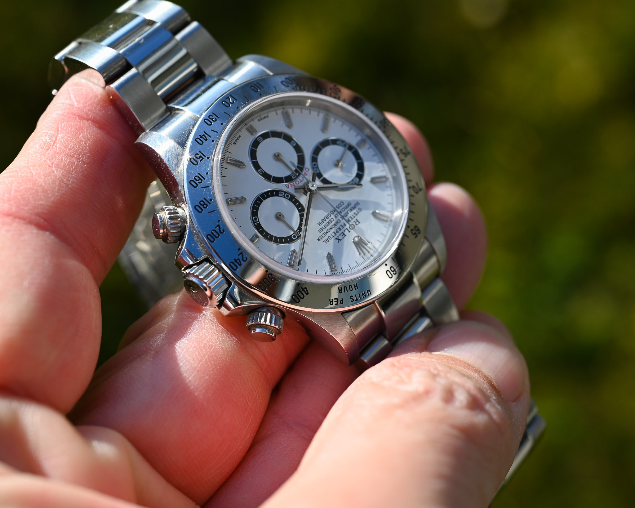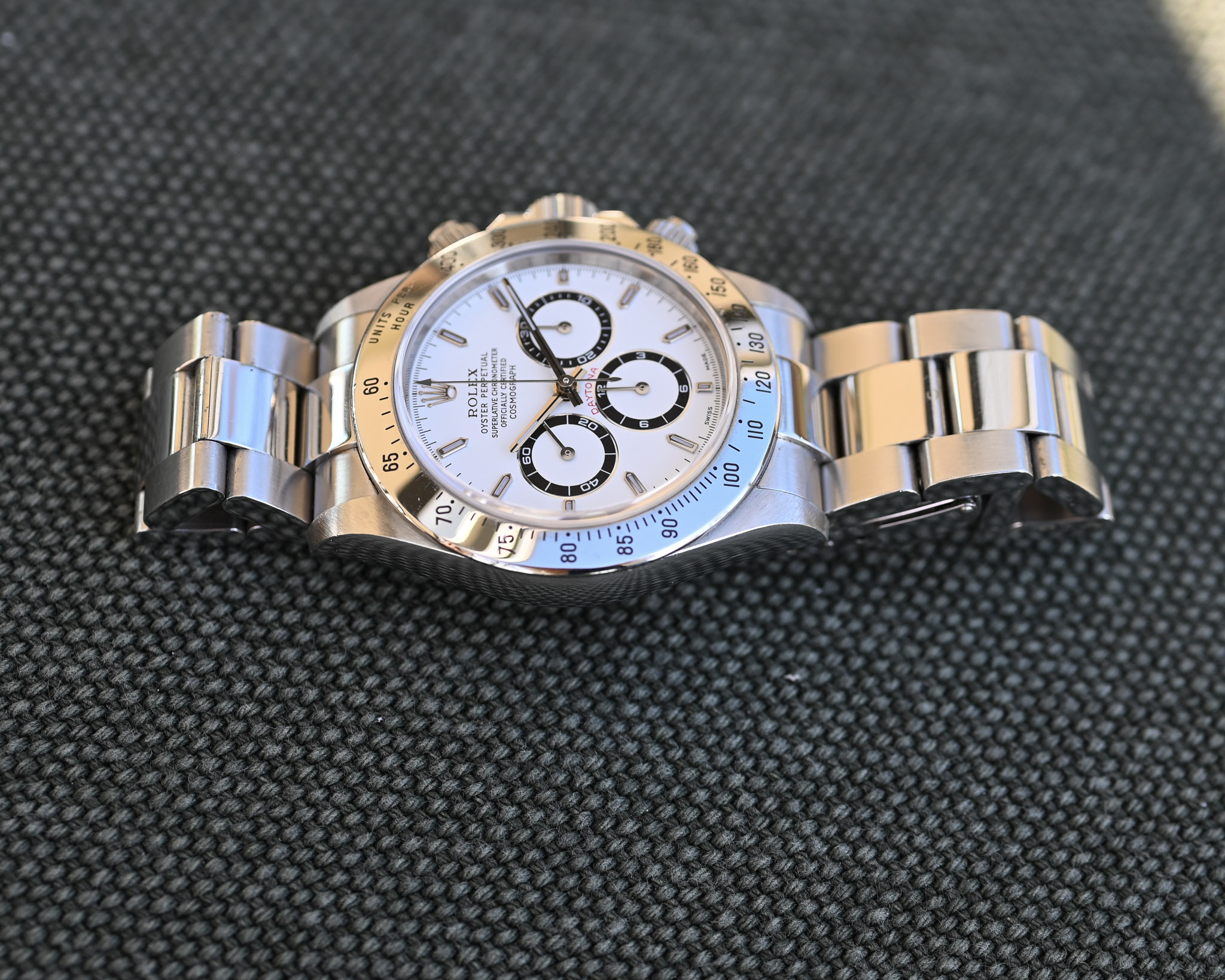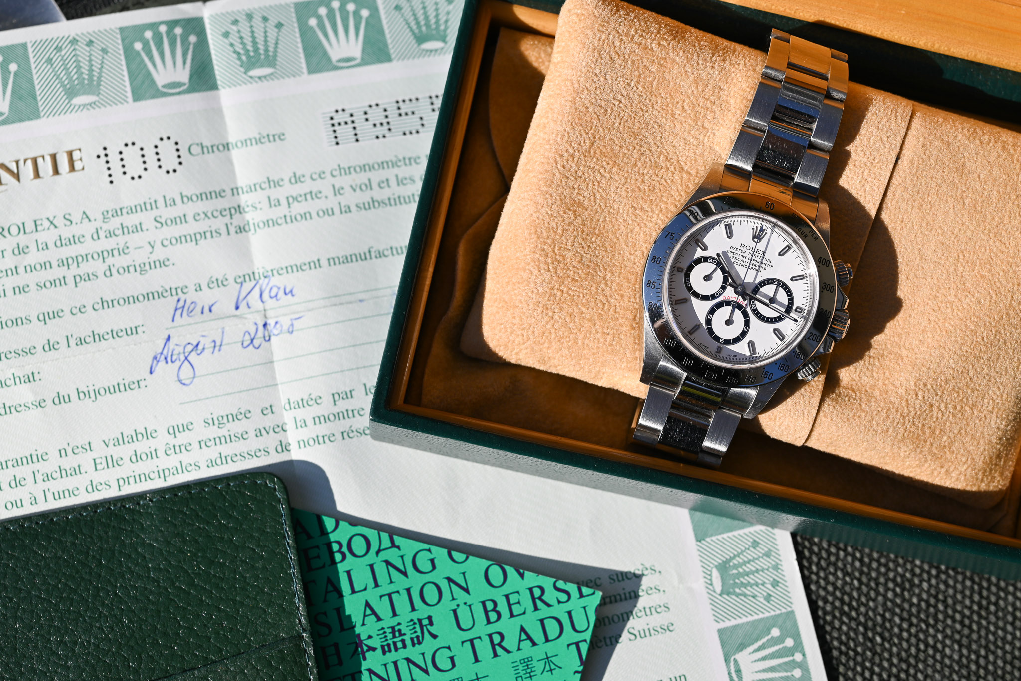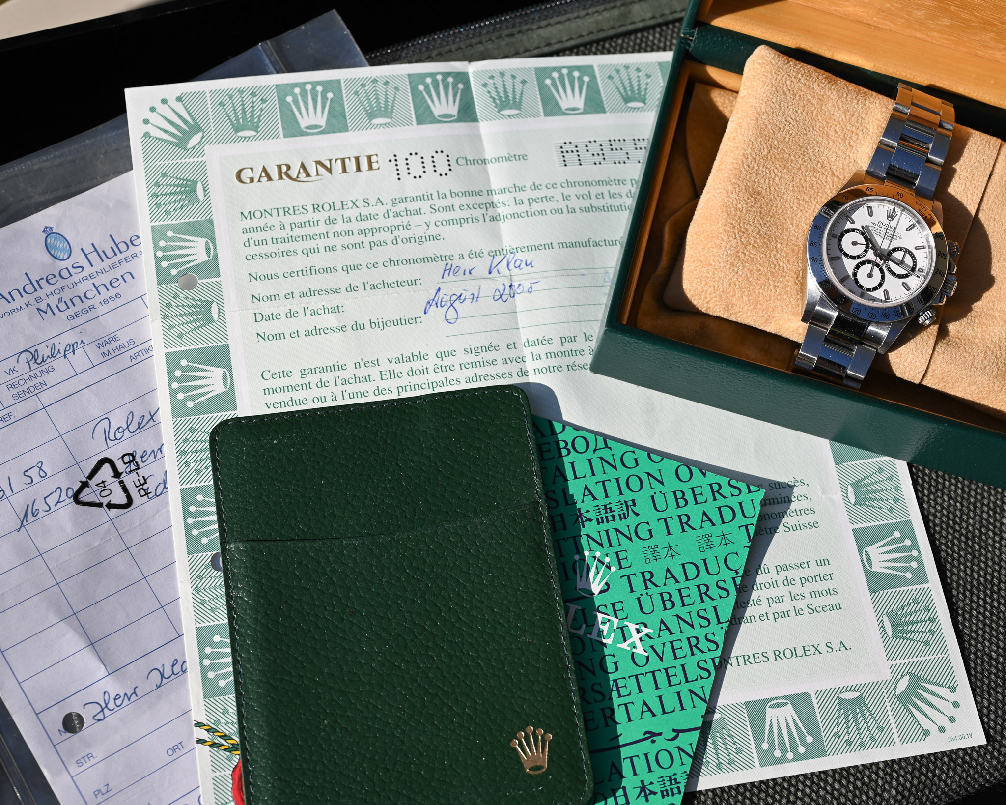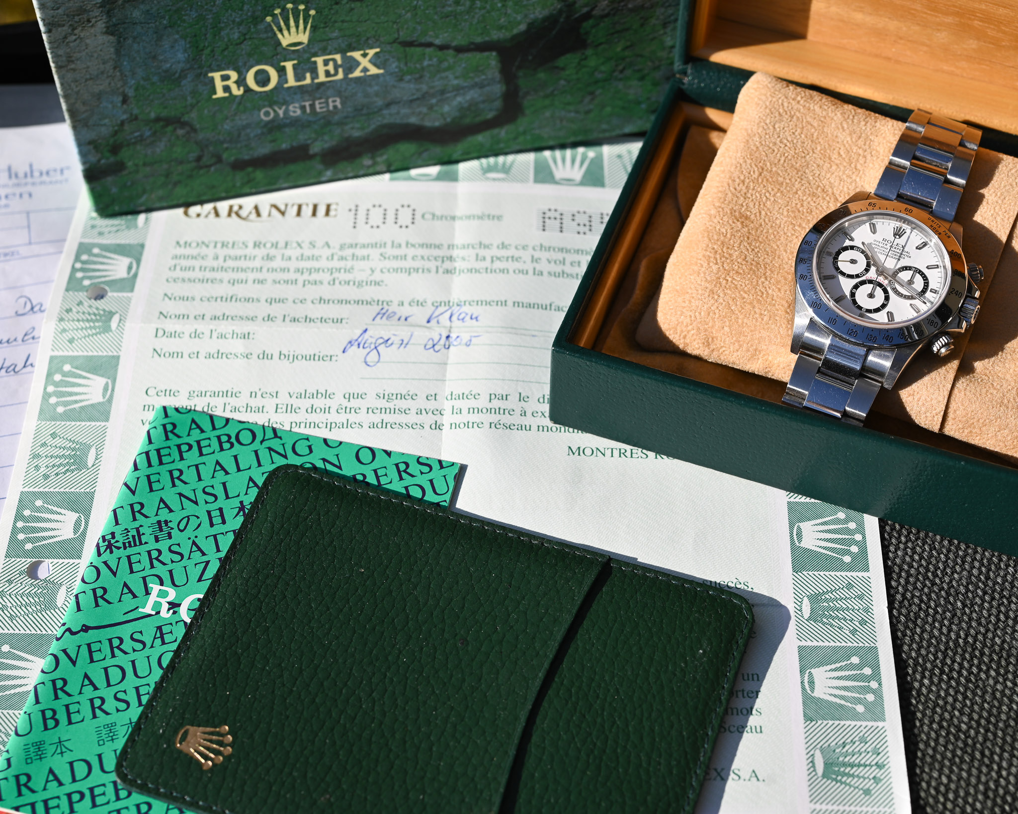 Eine Rolex Daytona 16520 in unpoliertem Topzustand als Fullset – eine seltene Gelegenheit für Sammler und Liebhaber, die Wert auf Originalität, Substanz und auf eine Uhr mit Box, Papieren und Erstkaufrechnung legen. Ein Klassiker mit stetig wachsender Bedeutung innerhalb der Rolex-Historie.