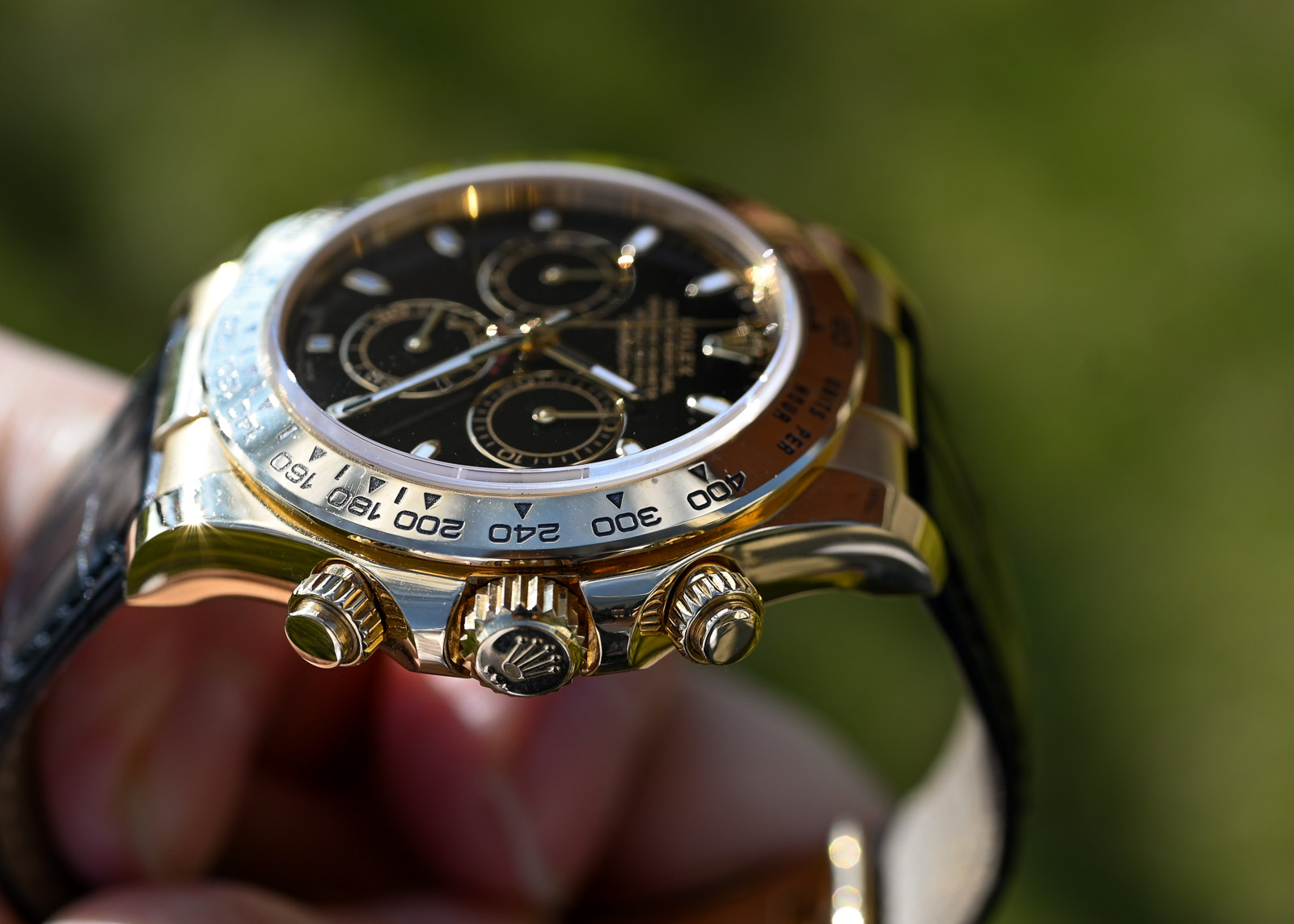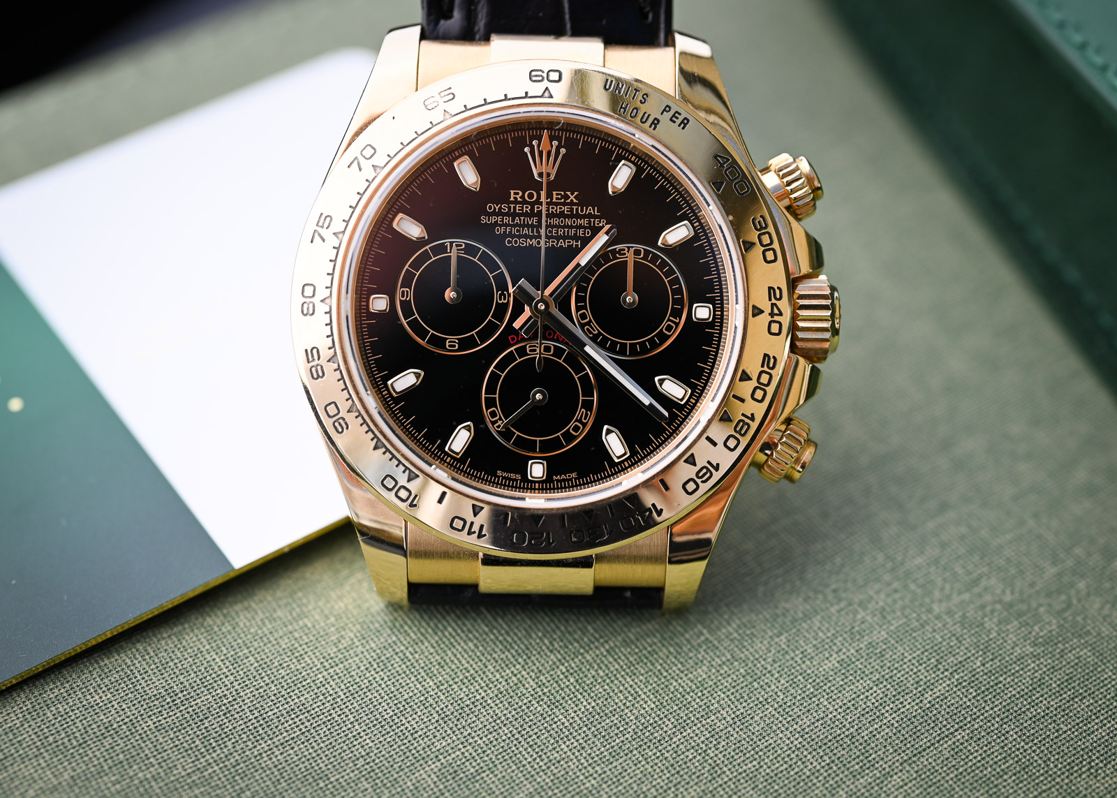 Ich wollte diese Daytona möglichst schwarz / monochrom haben, damit der Gelbgold Ton schön raus poppt und die Uhr trotzdem ein Understatement ist.