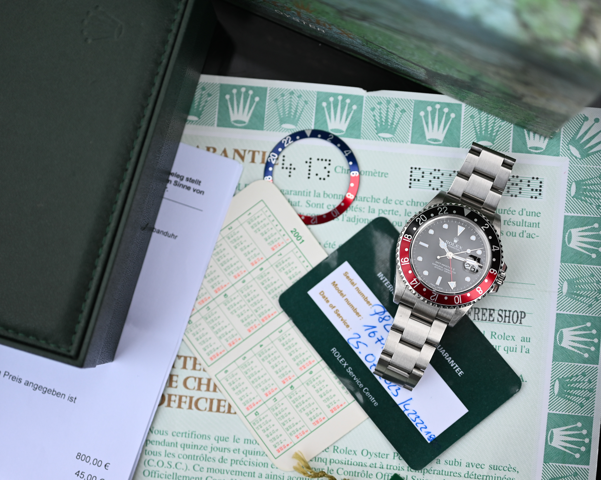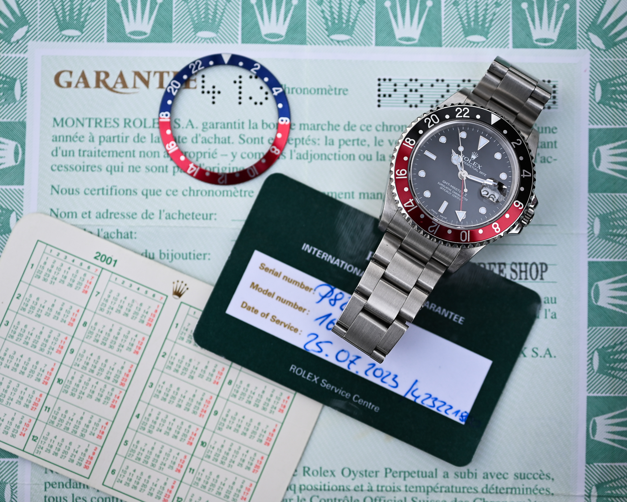 Zum Verkauf steht eine Rolex GMT-Master II 16710 aus dem Jahr 2001, die sich in einem optisch wie technisch einwandfreien Zustand befindet. Die Uhr wurde im Jahr 2023 bei Rolex einem offiziellen Service unterzogen und kommt selbstverständlich mit der Rolex-Servicekarte als Nachweis.