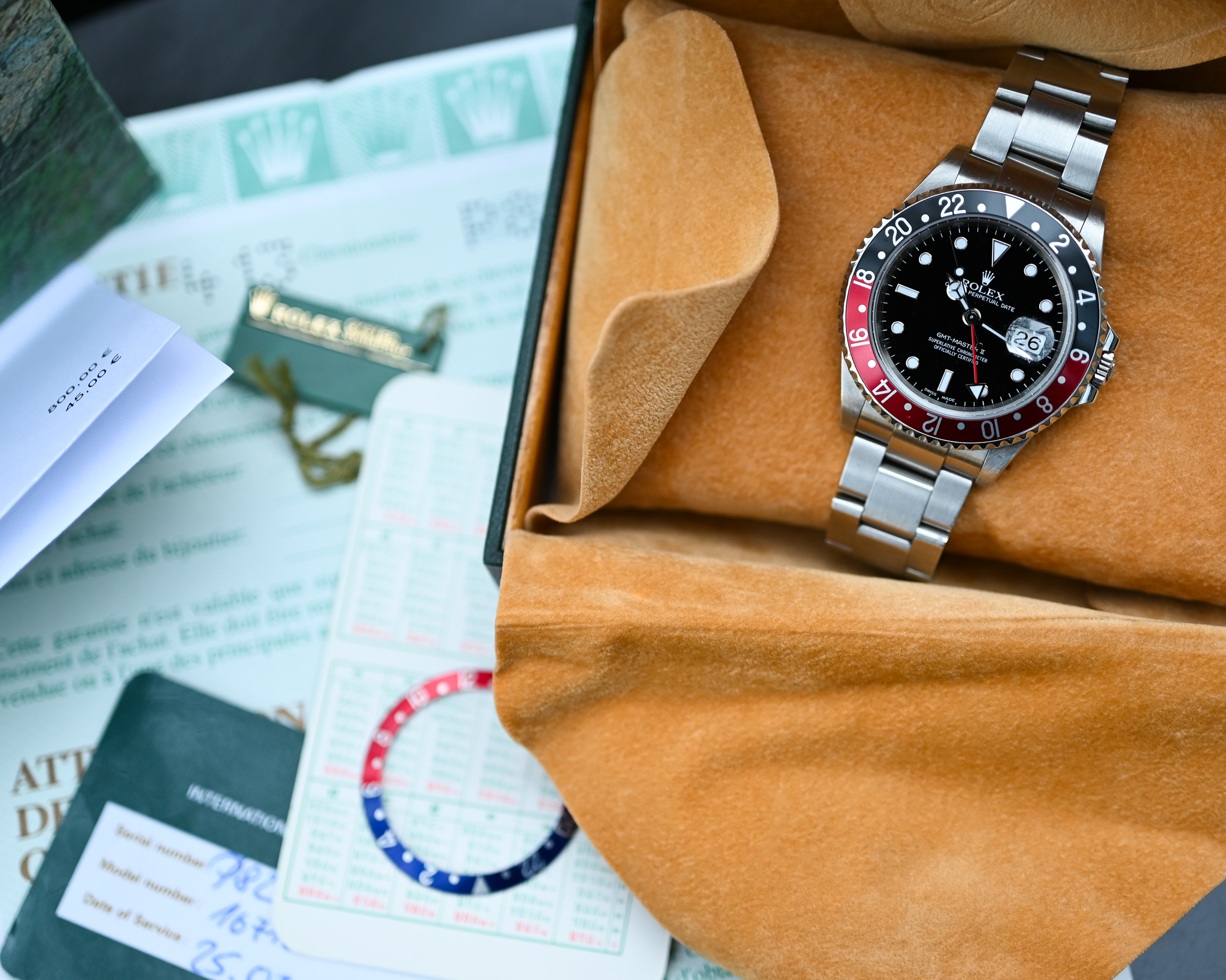Die GMT-Master II wird komplett mit Box und Papieren verkauft – ein rundes Gesamtpaket für Sammler und Liebhaber dieser ikonischen Referenz.