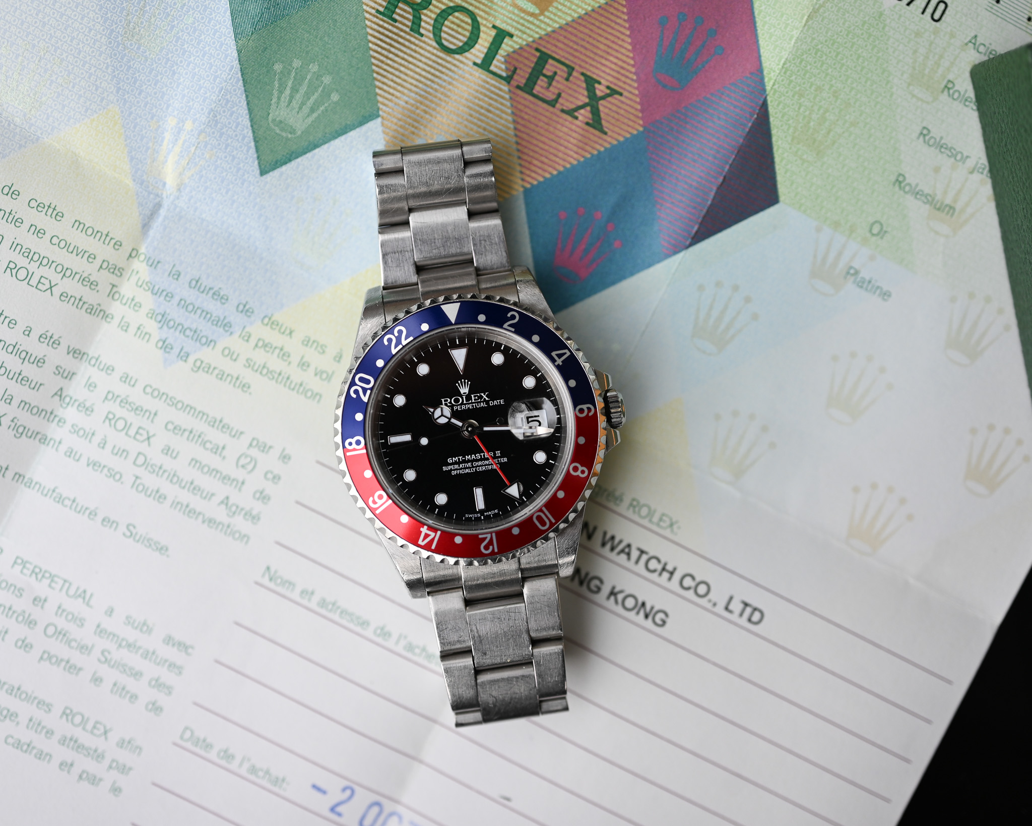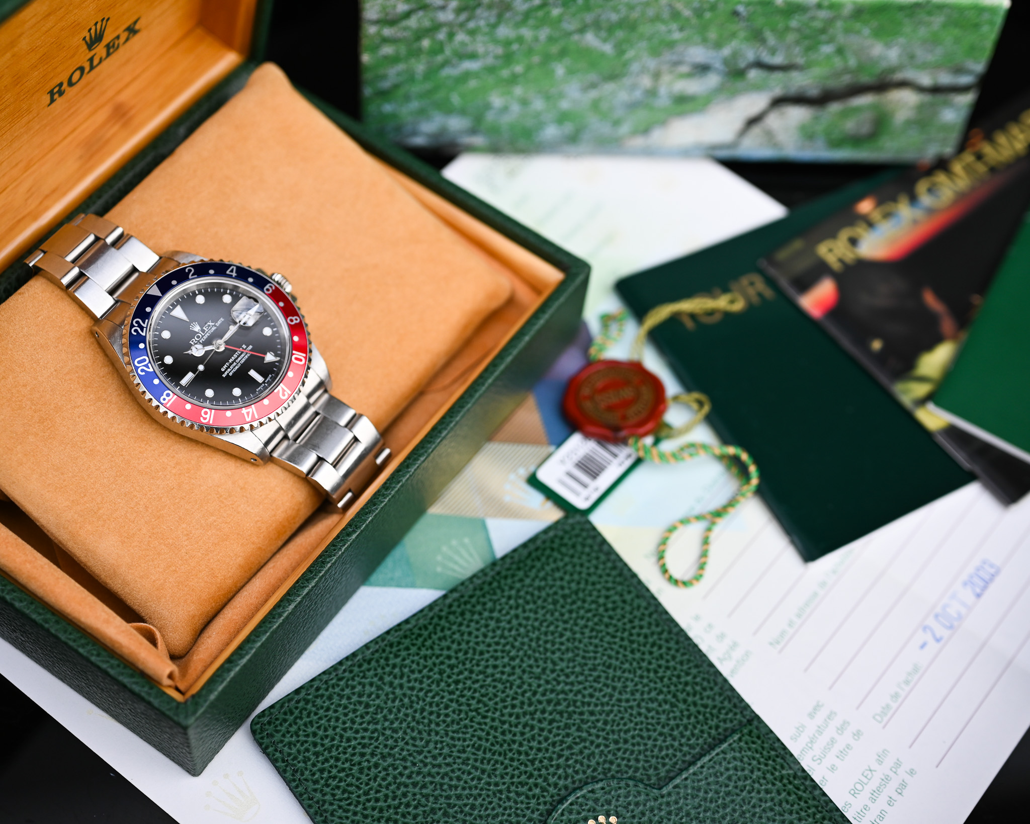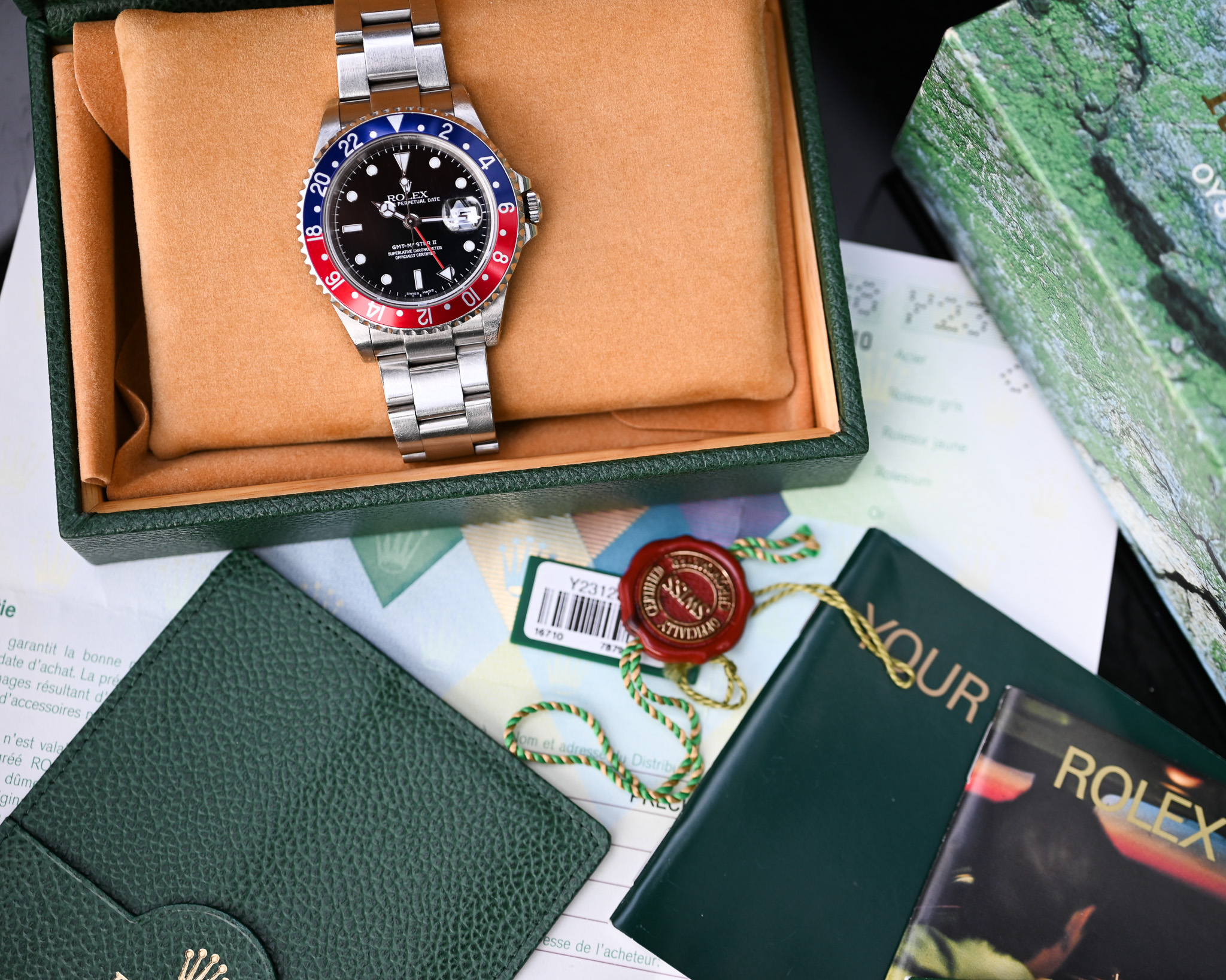 Eine Rolex GMT-Master II 16710 Pepsi in unpoliertem Zustand mit umfangreichem Originalzubehör – ein klassischer Neo-Vintage-Sportrolex mit hoher Nachfrage und nachhaltigem Sammlerpotenzial.