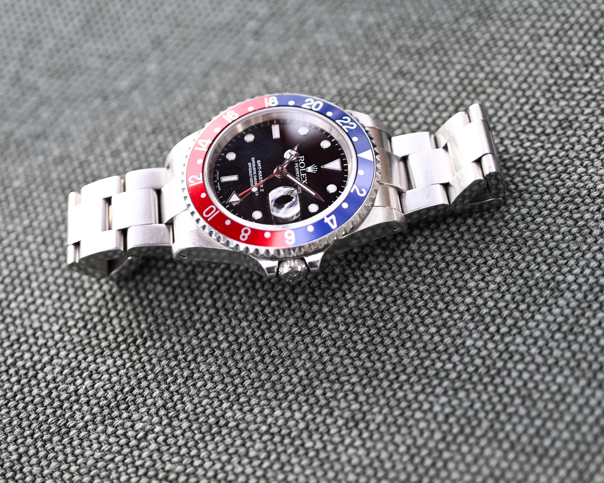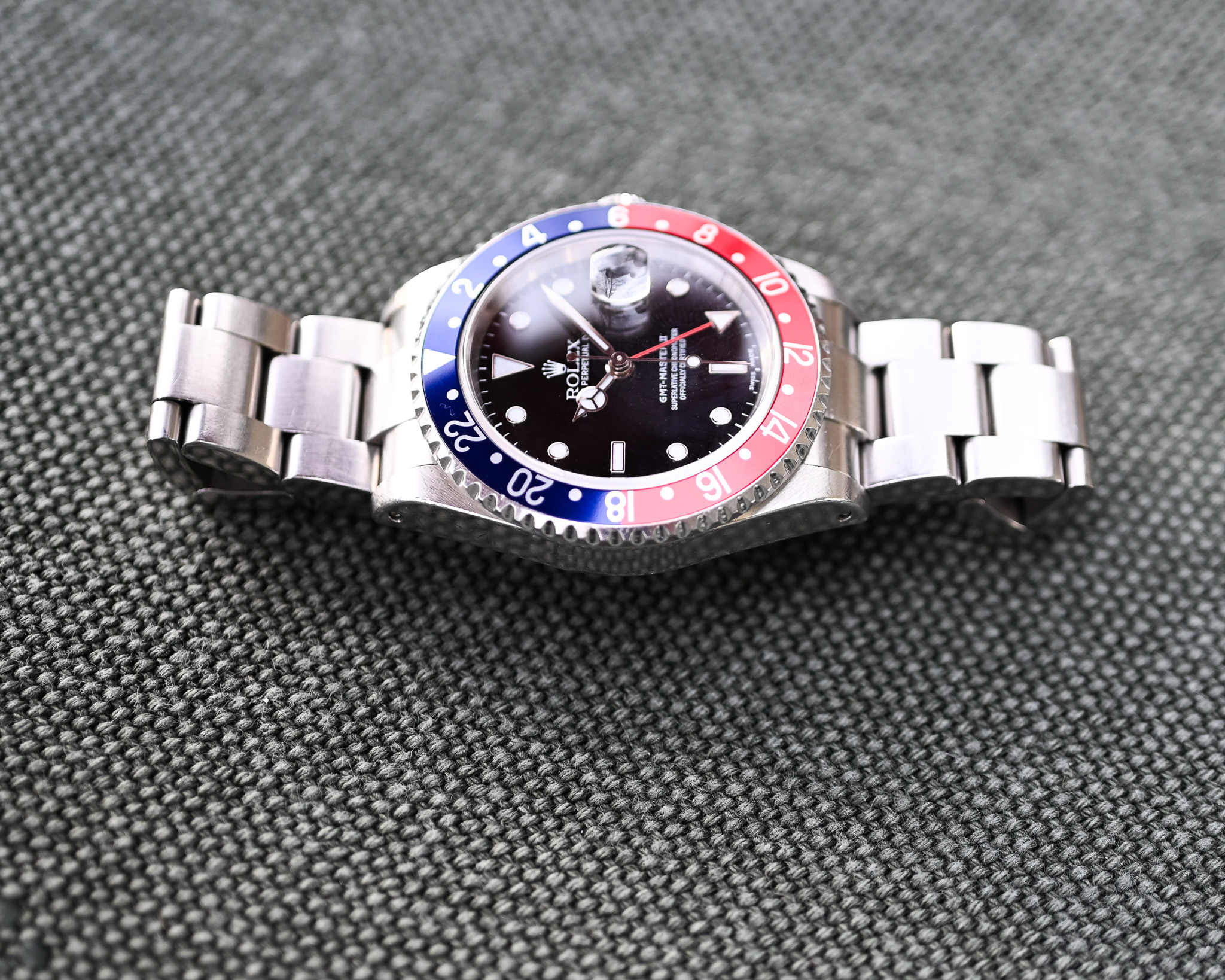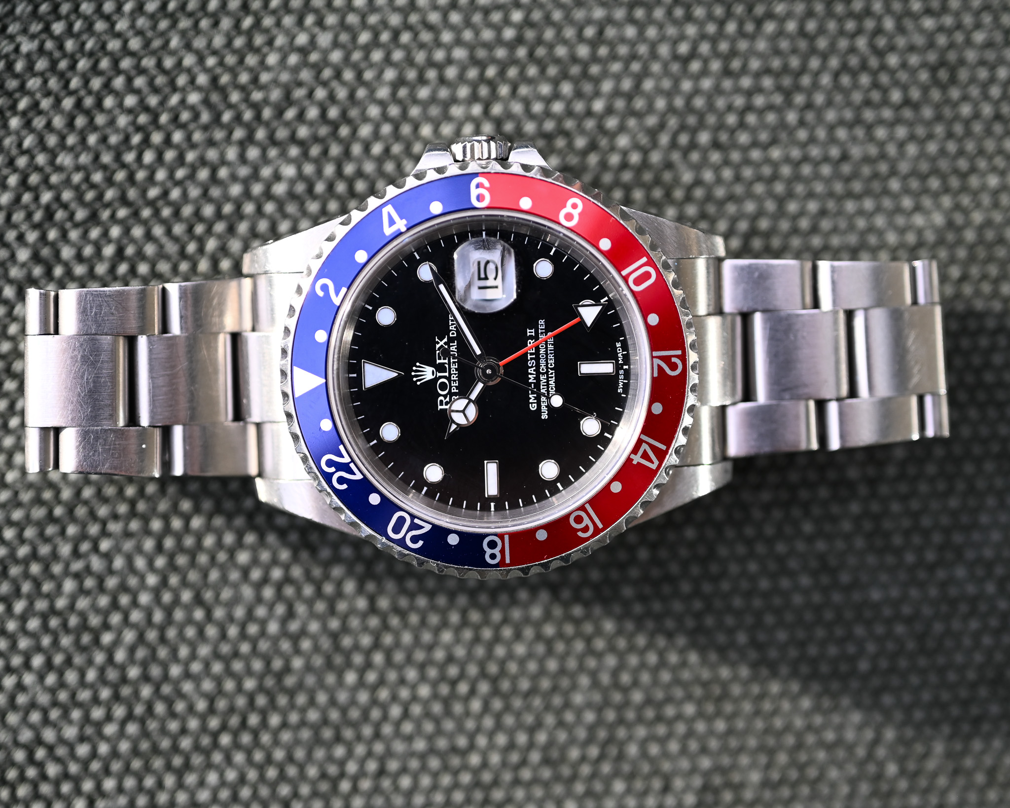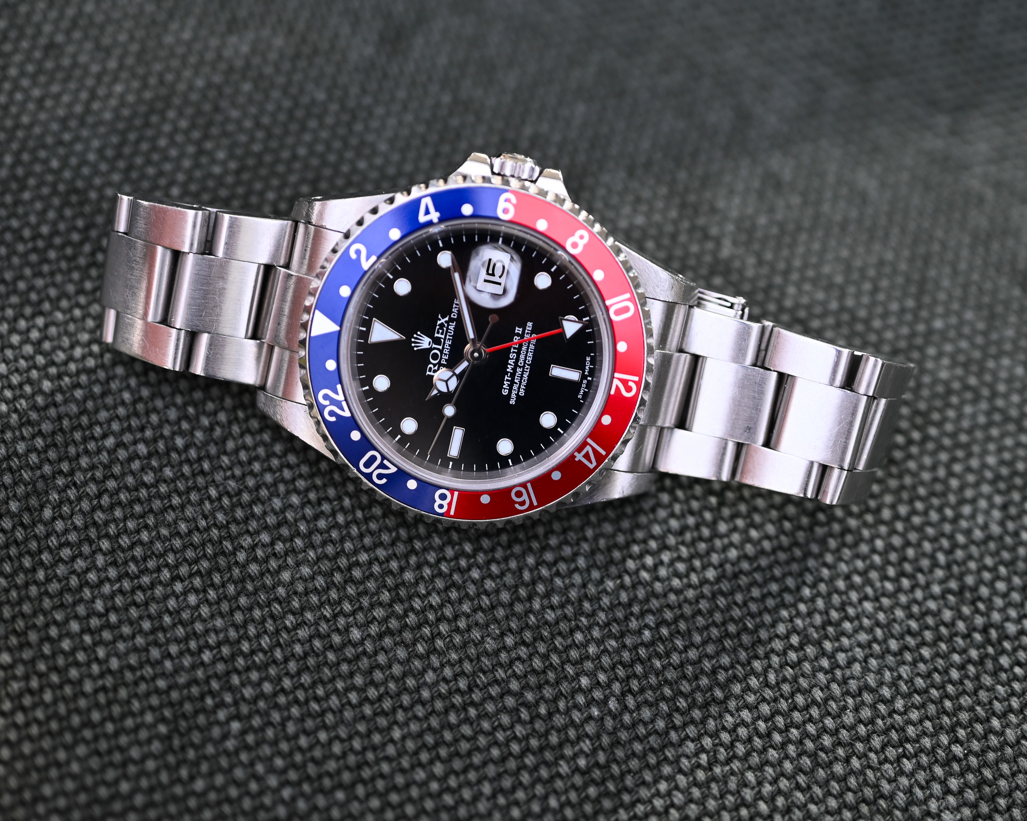 Zum Verkauf steht eine äußerst begehrte Rolex GMT-Master II Referenz 16710 aus dem Jahr 2003 – ein Klassiker der modernen Rolex-Geschichte und insbesondere in der beliebten Pepsi-Lünettenausführung eines der gefragtesten GMT-Modelle überhaupt.