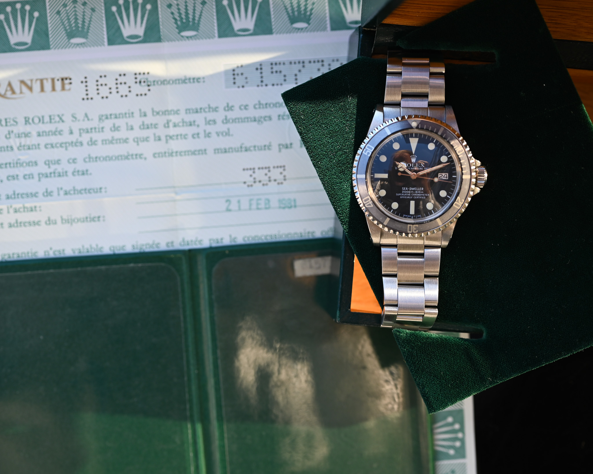 Geliefert wird diese Sea-Dweller inklusive Box und Papieren, was ihre Attraktivität für anspruchsvolle Sammler zusätzlich steigert. Die Kombination aus technischer Frische, aufgearbeitetem Gehäuse und stimmiger Patina macht diese Referenz zu einem äußerst ausgewogenen und hervorragend tragbaren Klassiker.