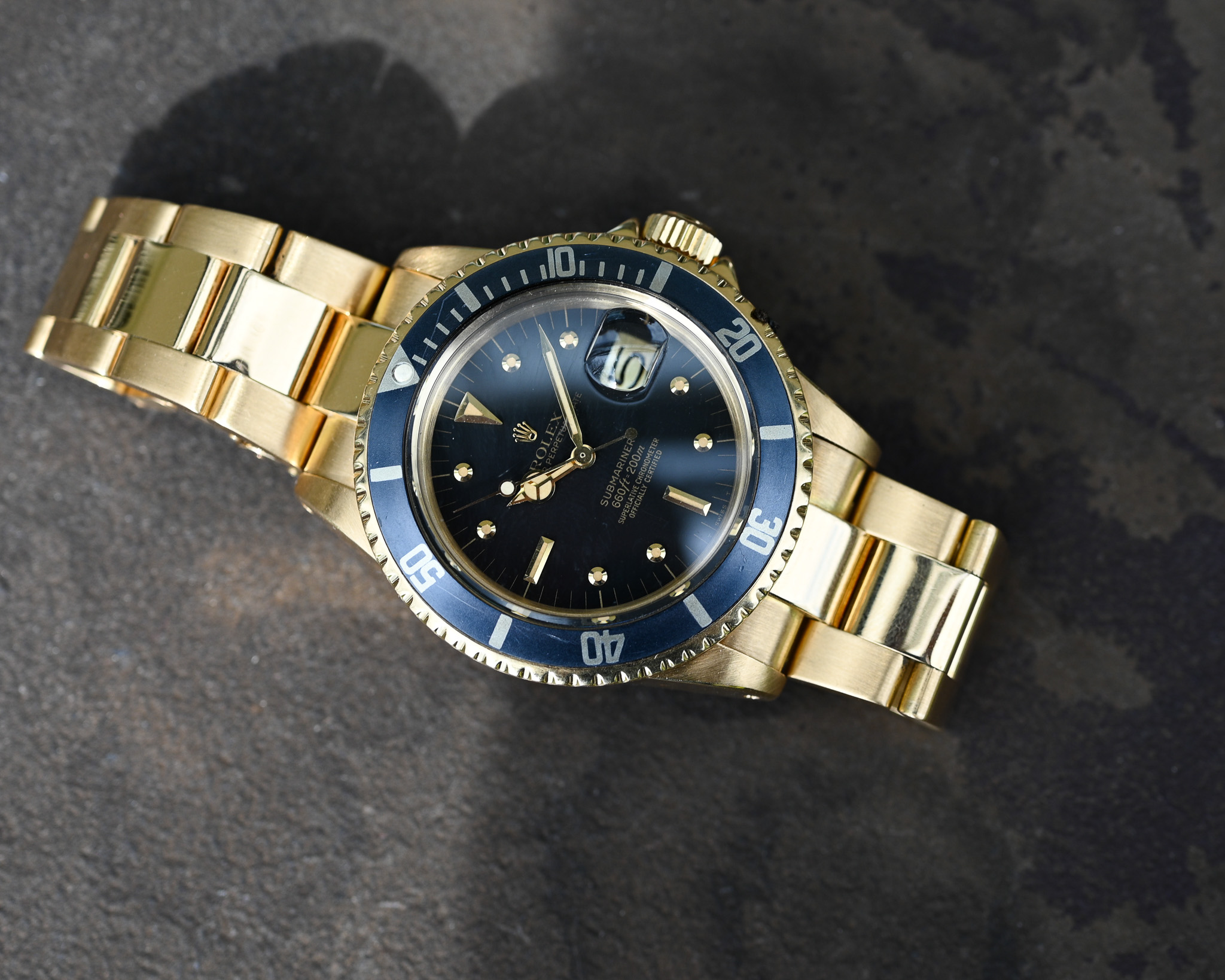 Zum Verkauf steht eine äußerst attraktive und zunehmend seltene Rolex Submariner Date Referenz 1680/8 aus dem Jahr 1973 – die ikonische Submariner vollständig in Gelbgold, inklusive des originalen Gelbgold-Oysterbands.