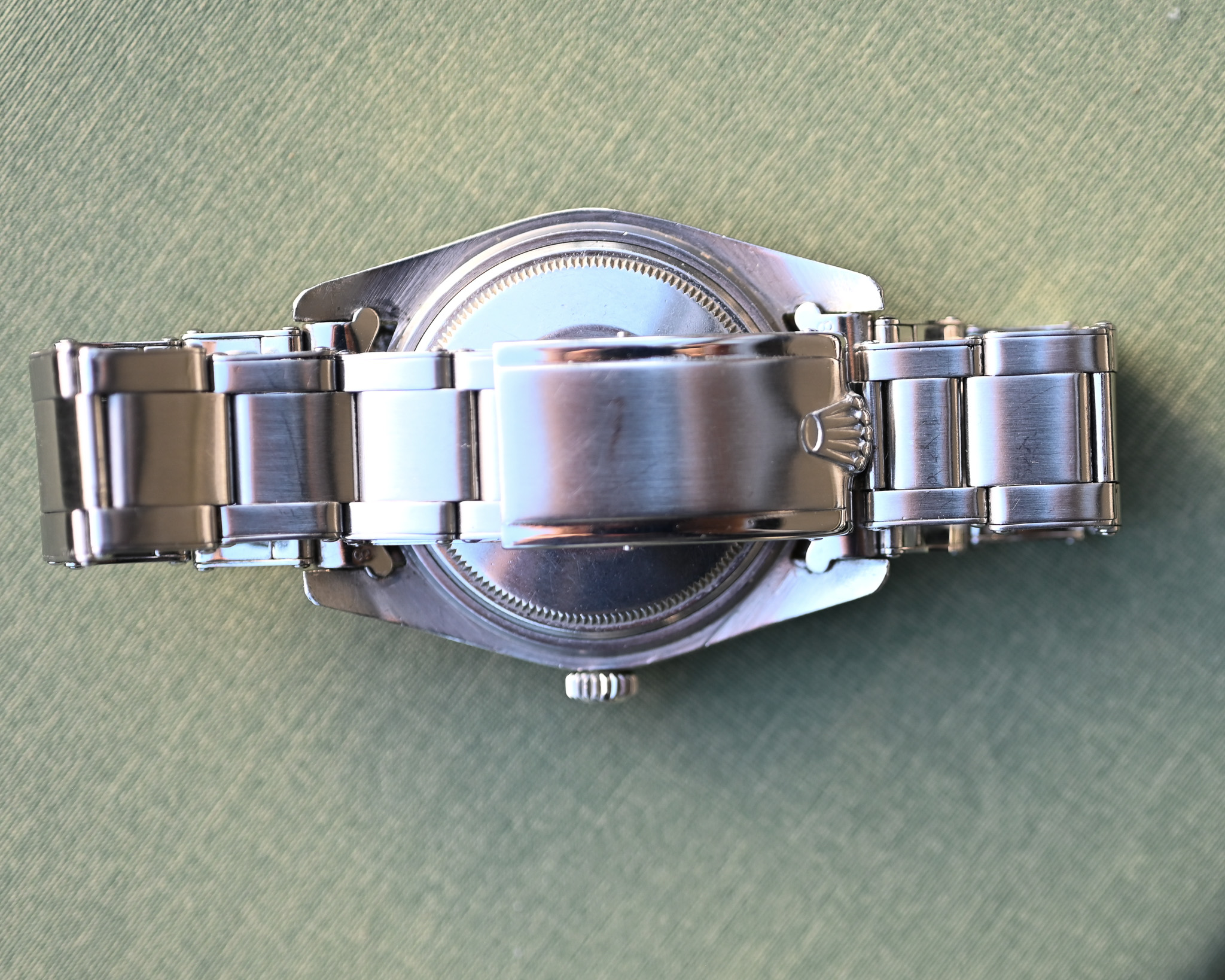Das Gehäuse ist perfekt erhalten und unpoliert – mit klaren Kanten und exzellenten Proportionen, wie man sie nur selten findet. Ergänzt wird die Uhr durch ein elastisches Rolex 6636 Oyster-Band mit den korrekten 58er Anstößen, eine äußerst stimmige und gesuchte Kombination für diese Referenz.