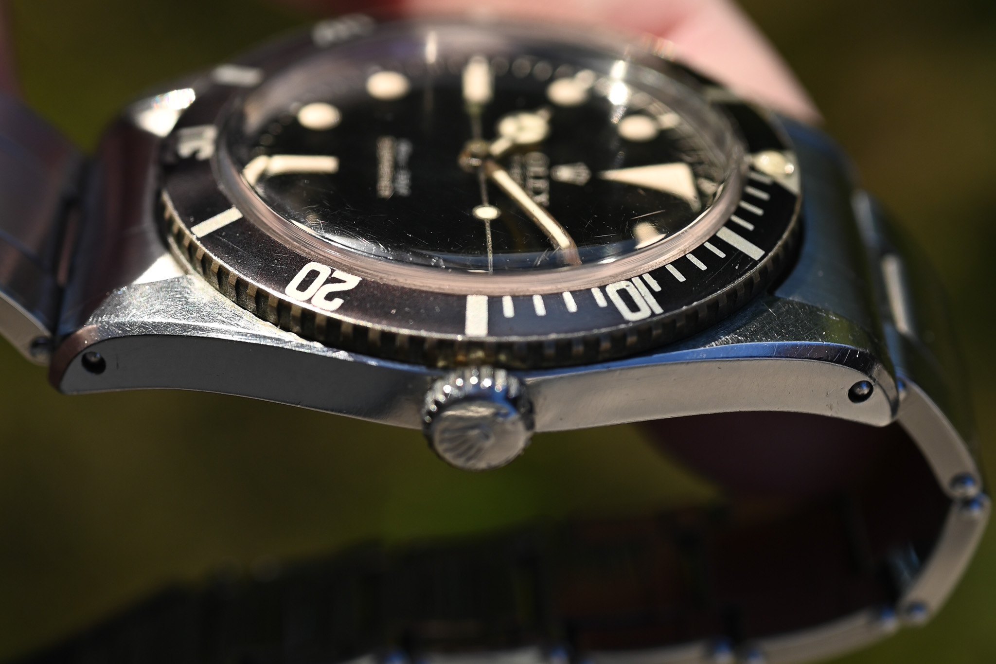 Das originale Zifferblatt begeistert mit 100 % erhaltenem Glanz, während die intakte Tritium-Leuchtmasse und die korrekten, zeitgenössischen Zeiger die Authentizität dieses Zeitmessers unterstreichen. Hervorzuheben ist ebenfalls das sehr schön gefadete „Kissing-4“-Lünetteninsert, das der Uhr eine unvergleichliche Vintage-Ästhetik verleiht.