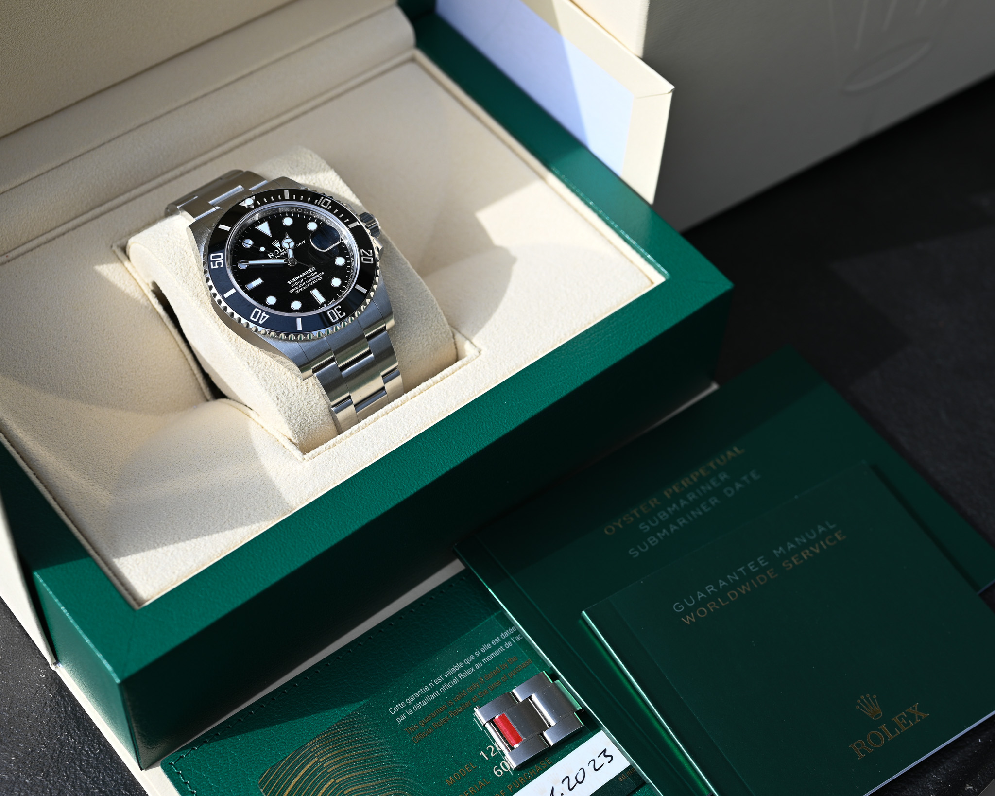 Eine nahezu neuwertige Submariner 126610LN aus 2023 im Fullset mit verbleibender Rolex Herstellergarantie – die perfekte Wahl für Liebhaber moderner Rolex-Sportmodelle.
