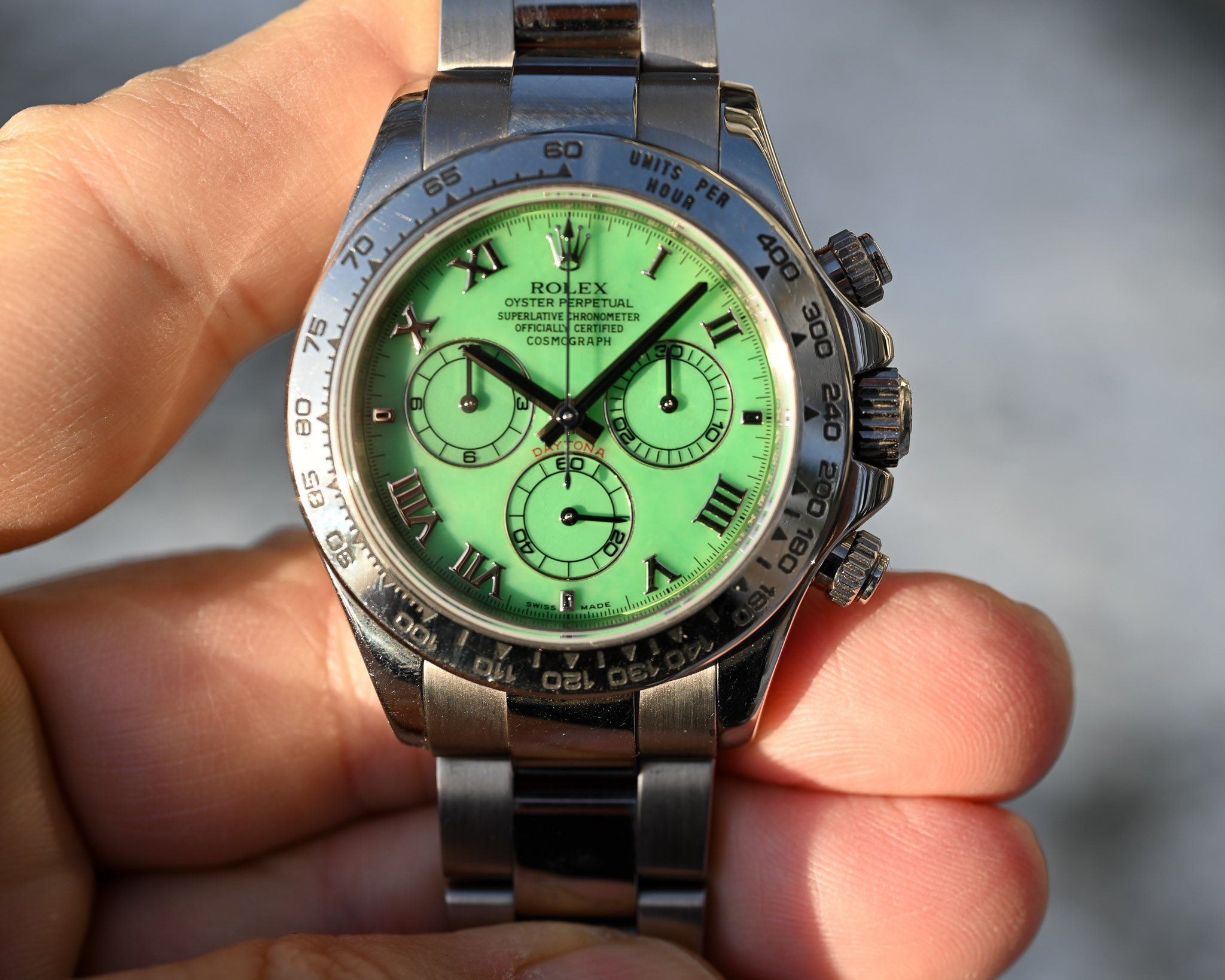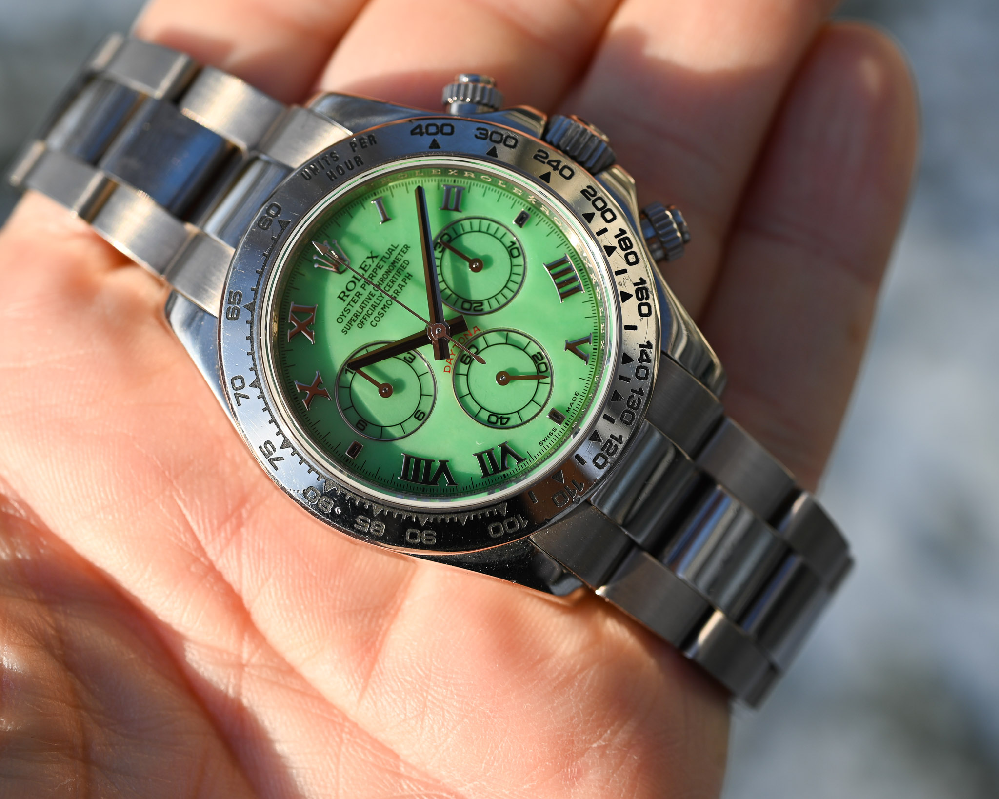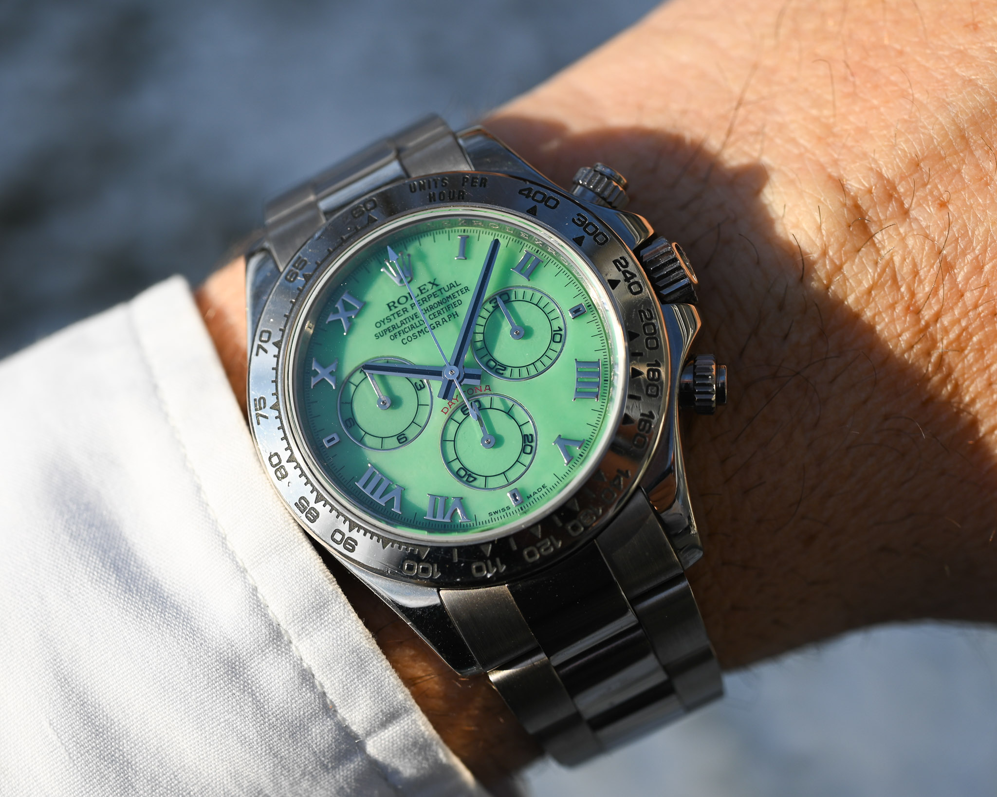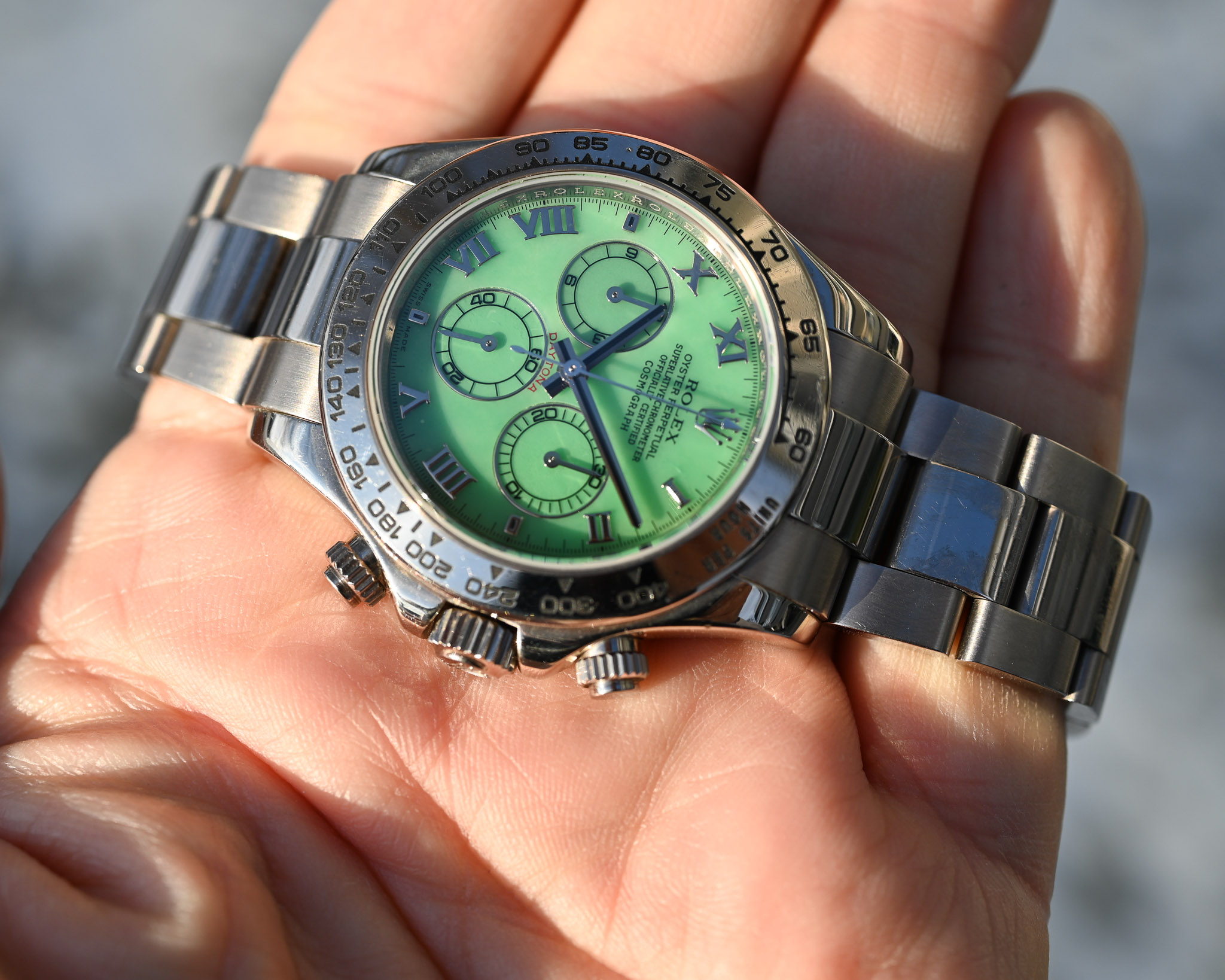 Dieses faszinierende Naturstein-Zifferblatt wurde unter anderem auch in den kultigen Rolex Cosmograph Daytona 116519 „Beach Daytonas“ verbaut. Wichtig: Das Chrysopras-Blatt war offiziell für beide Referenzen erhältlich und ist somit absolut referenzgerecht in dieser 116509 verbaut.