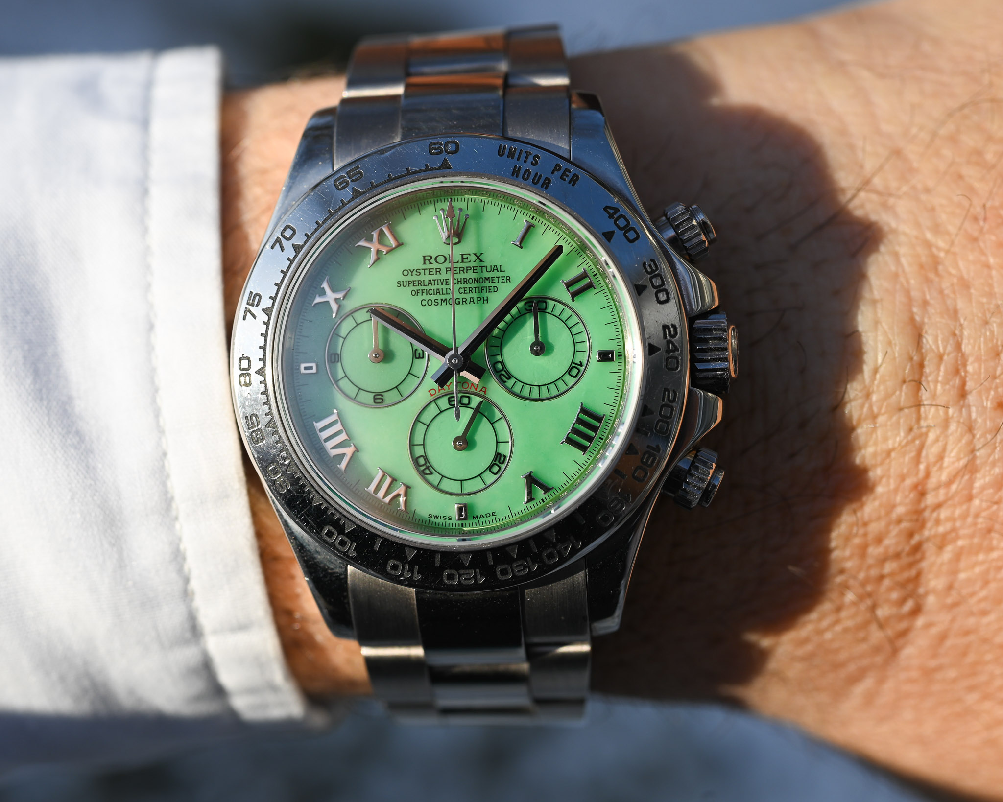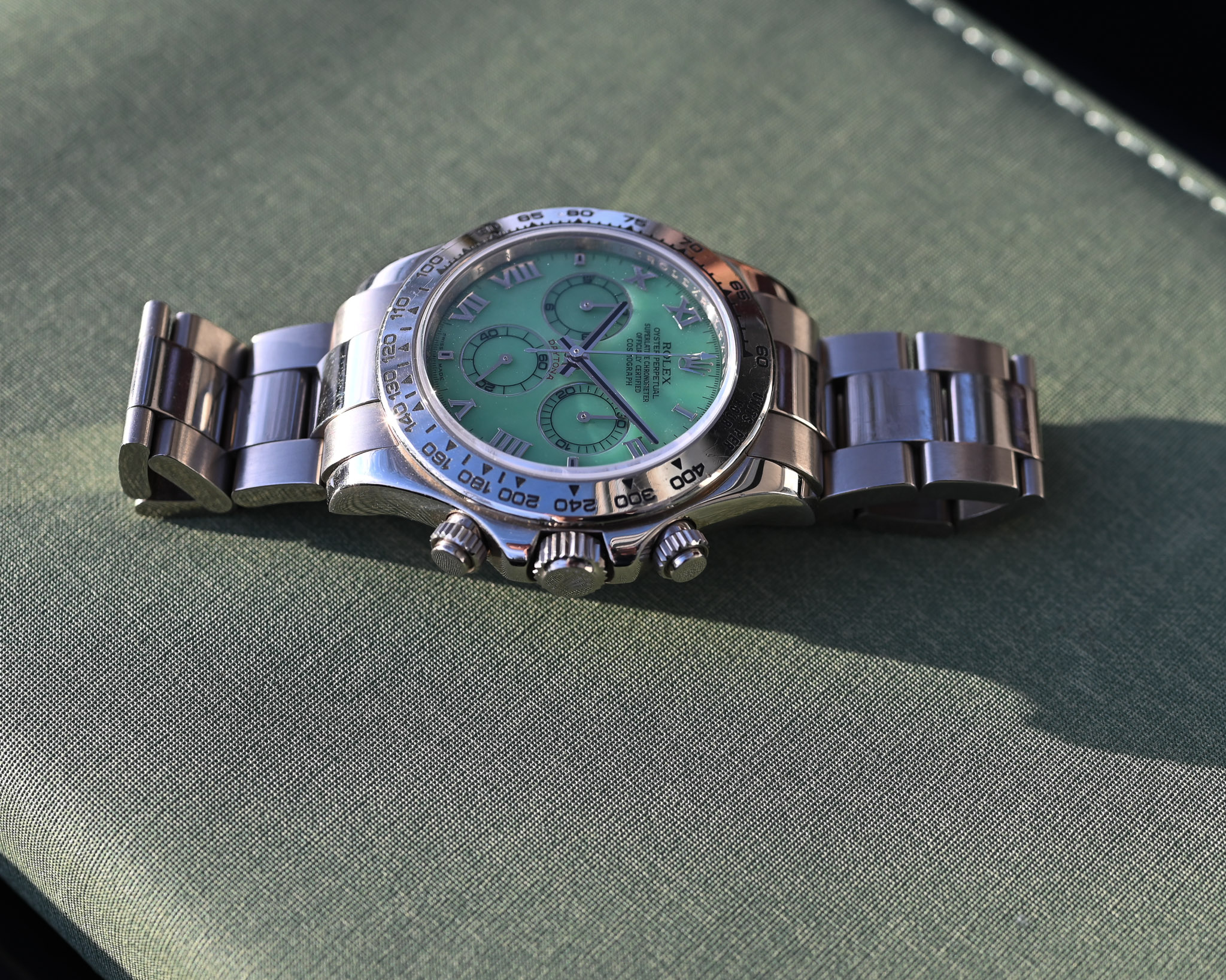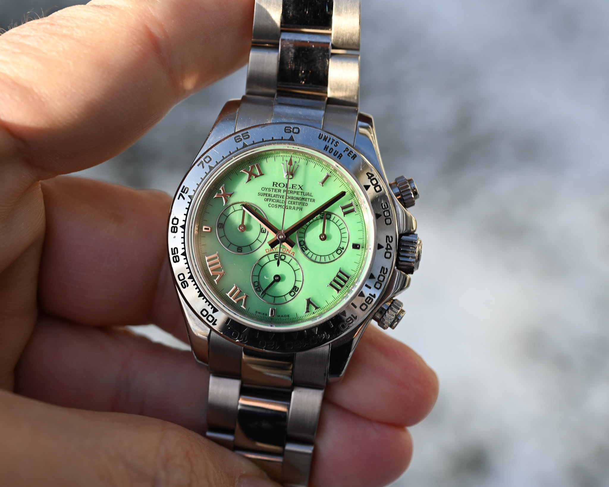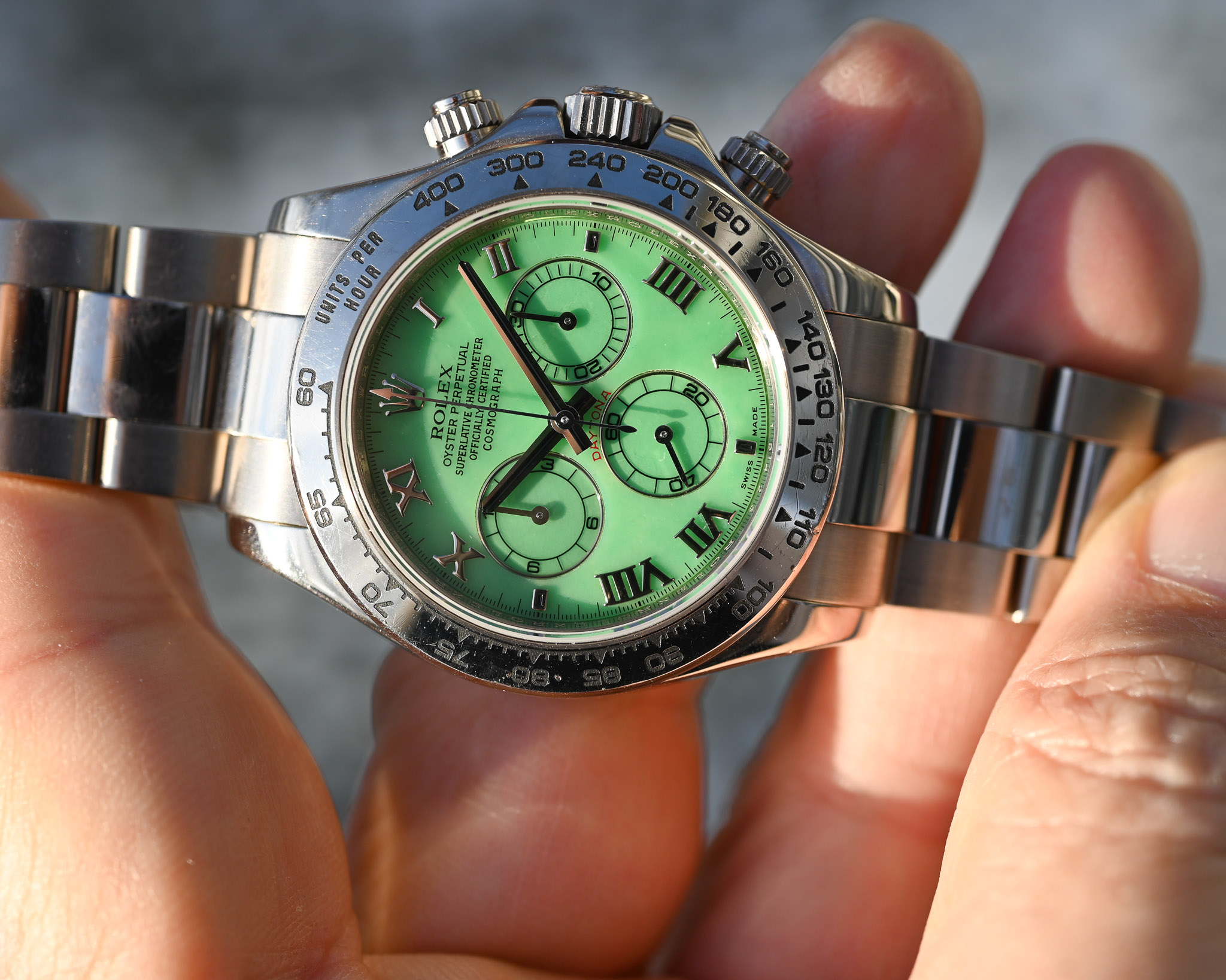 Dieses faszinierende Naturstein-Zifferblatt wurde unter anderem auch in den kultigen Rolex Cosmograph Daytona 116519 „Beach Daytonas“ verbaut. Wichtig: Das Chrysopras-Blatt war offiziell für beide Referenzen erhältlich und ist somit absolut referenzgerecht in dieser 116509 verbaut.