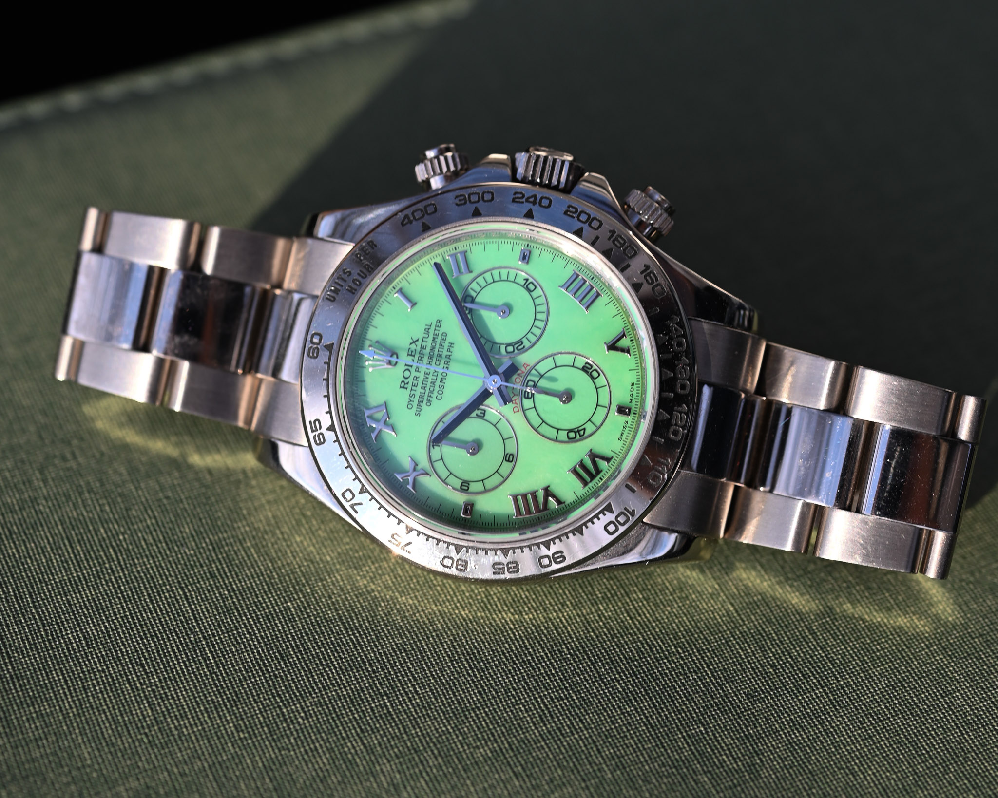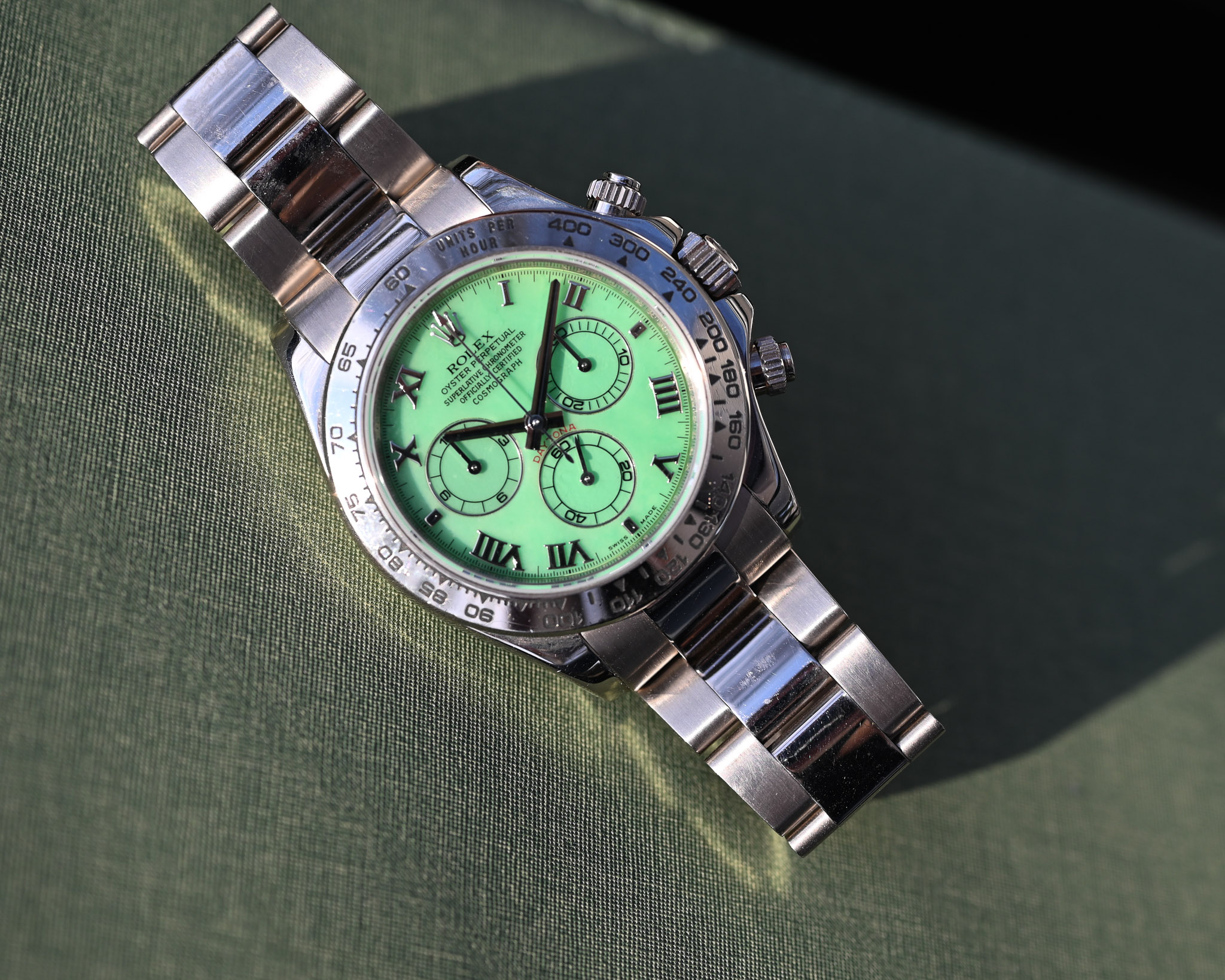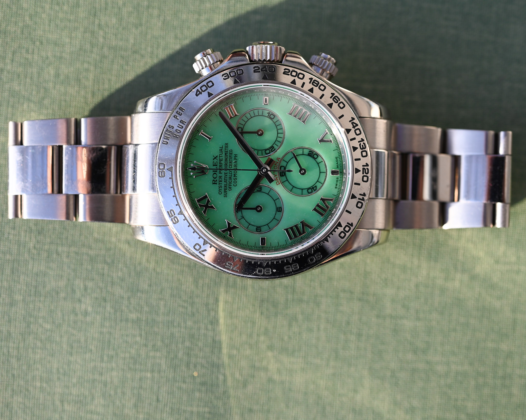 Zum Verkauf steht eine außergewöhnliche Rolex Daytona 116509 aus dem Jahr 2004 in Weißgold – ausgestattet mit einem atemberaubenden Chrysopras-Steinblatt.