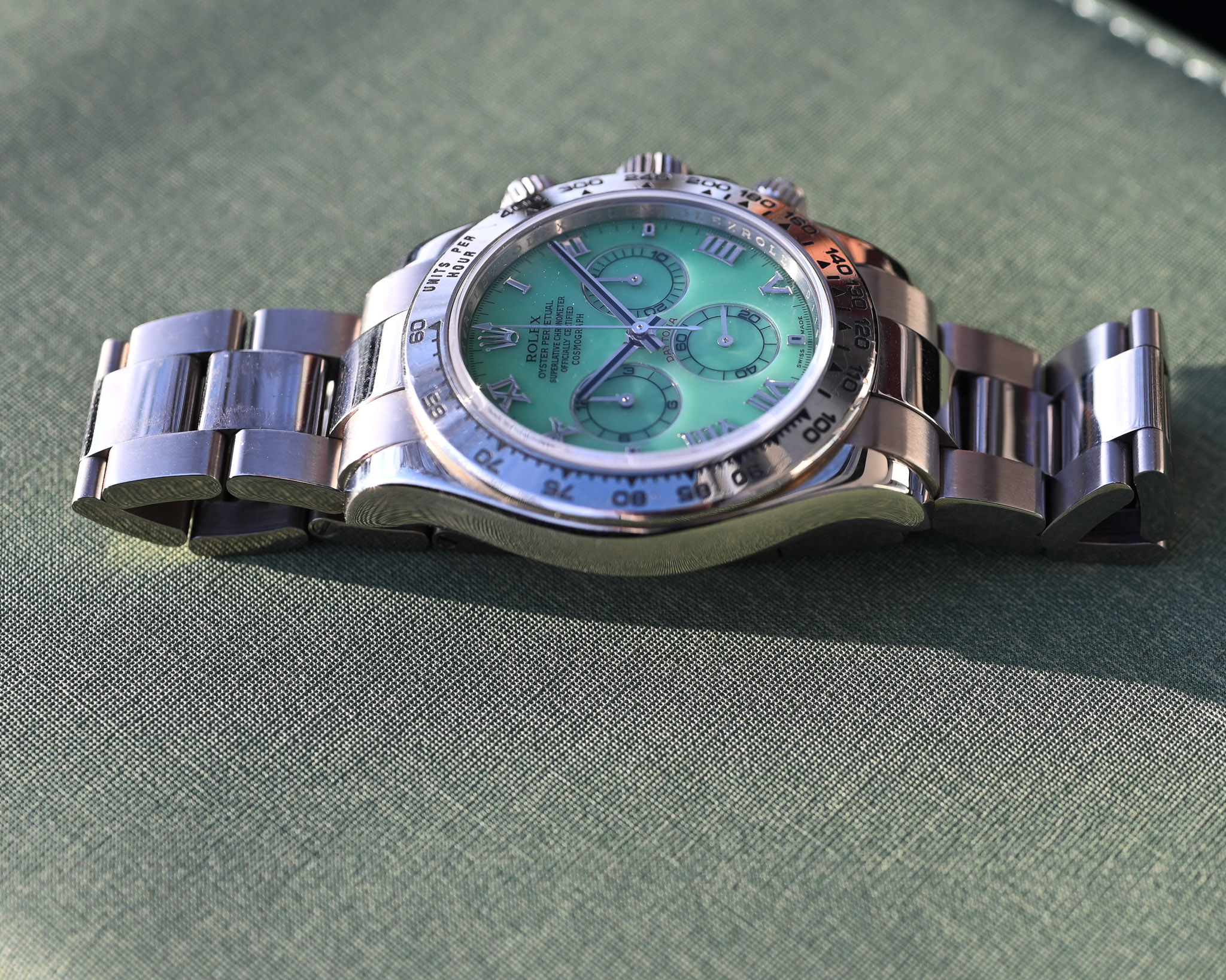 Rolex Weißgold Daytona 116509 mit perfektem Chrysopras Steinblatt aka Beach-Dial